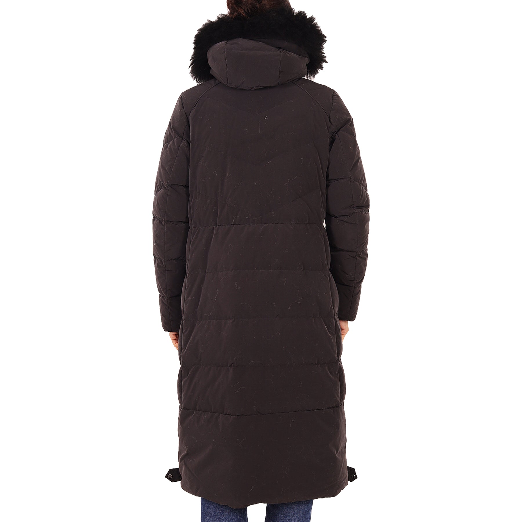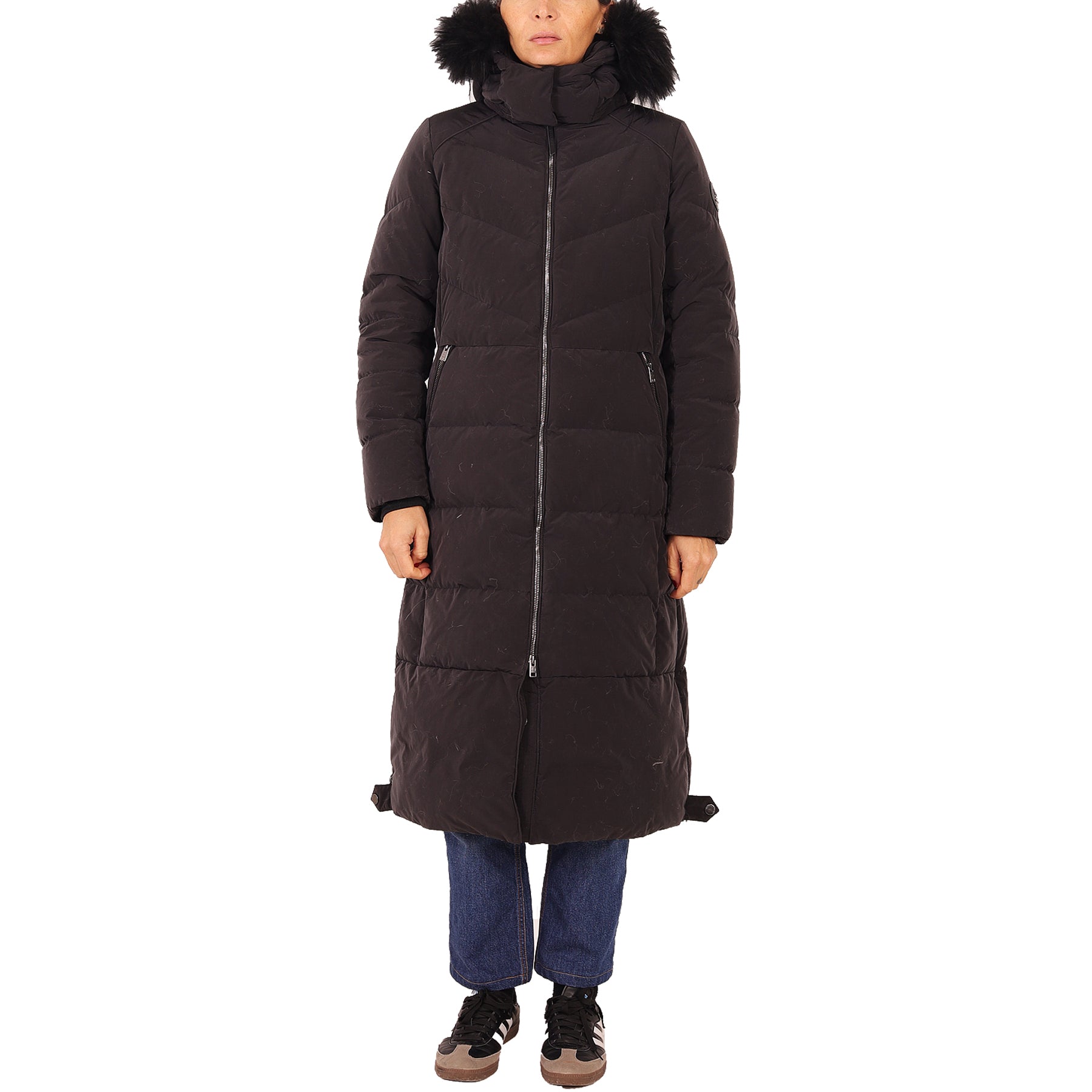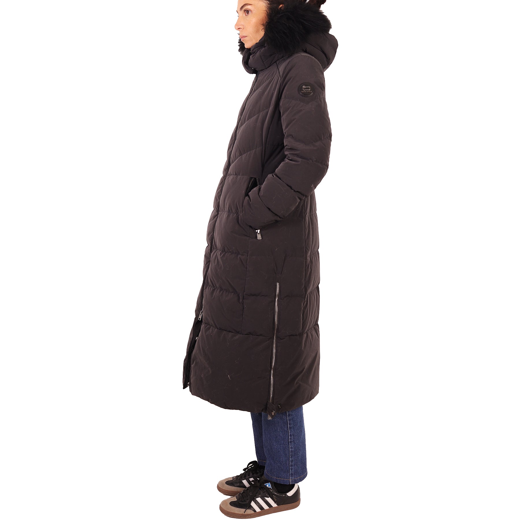 Piumino Woolrich, in tessuto impermeabile, lungo, colore nero, con tasche, chiusura con zip, con cappuccio rimovibile bordato in pelliccia, con imbottitura in piuma, spacchi laterali con zip, micro imperfezioni