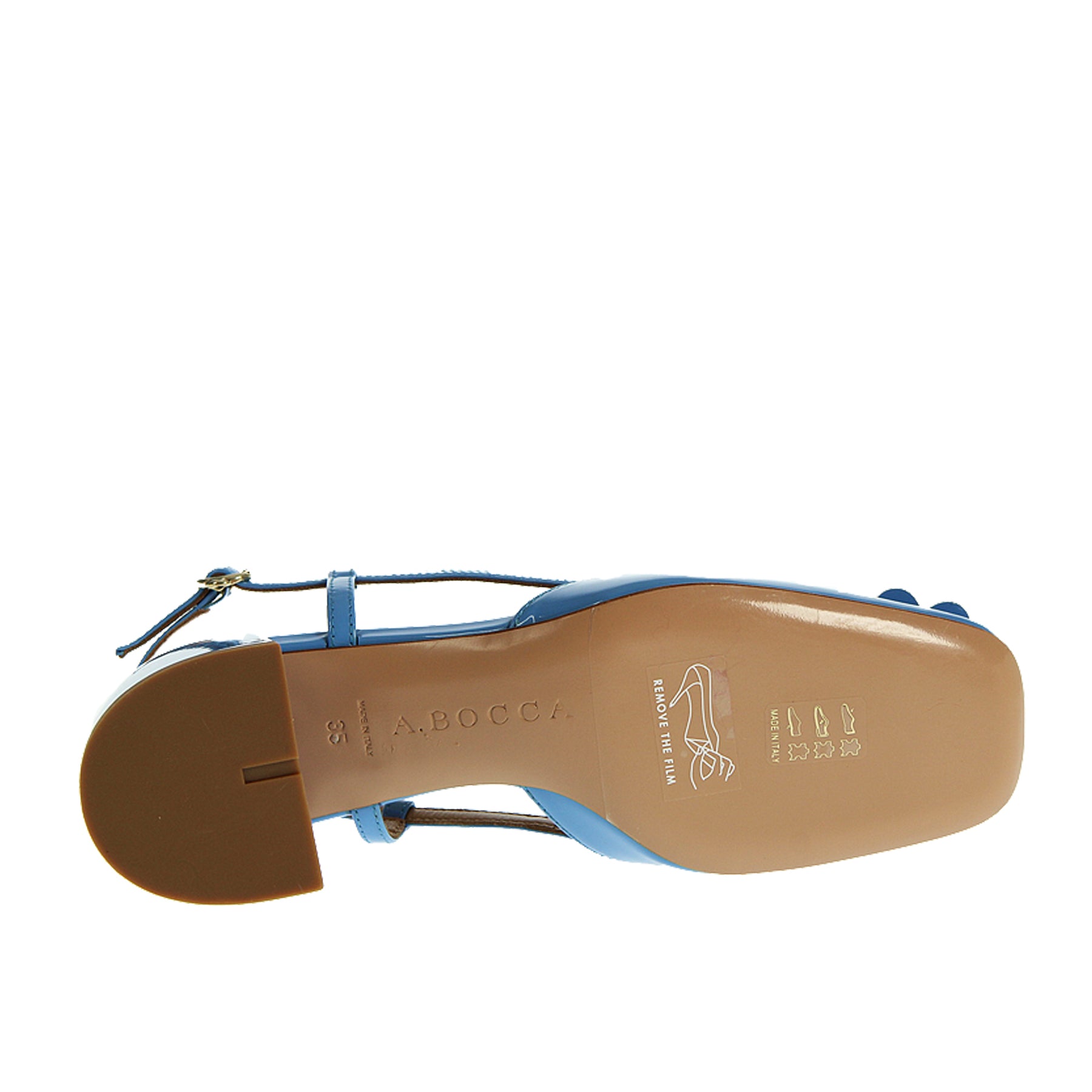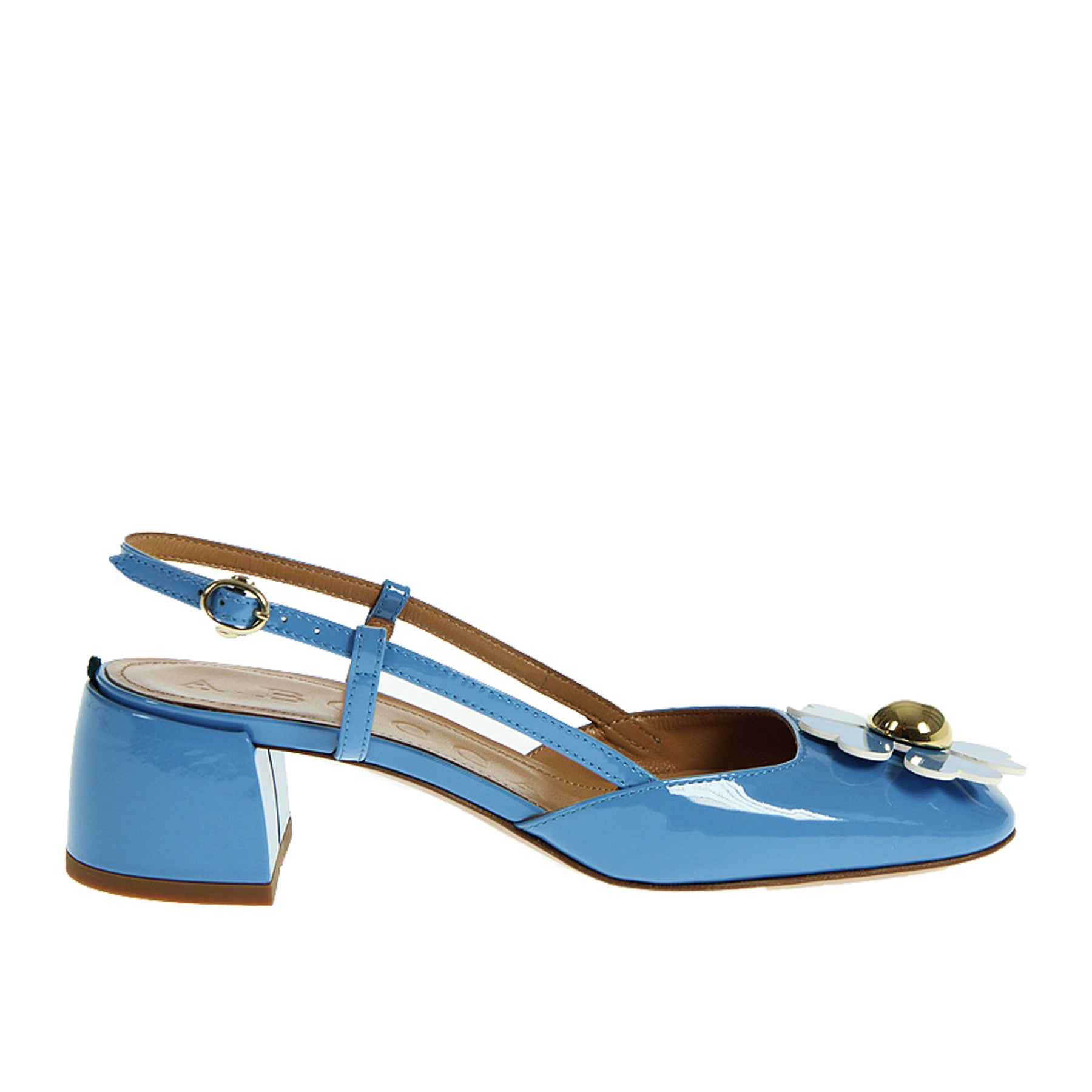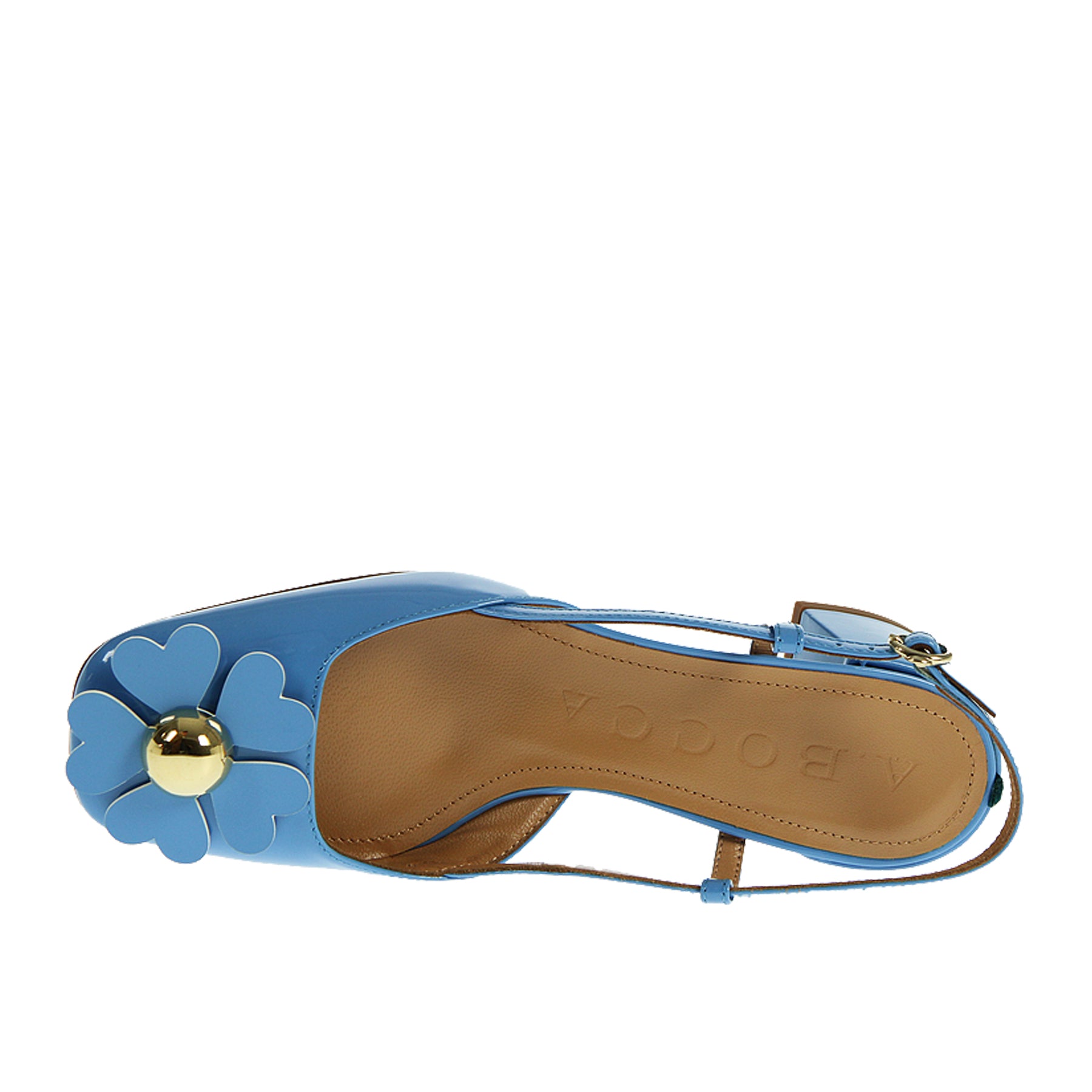 Chanel A.Bocca, in vernice azzurra, con fiore applicato in punta, suola in cuoio, altezza tacco 5 cm