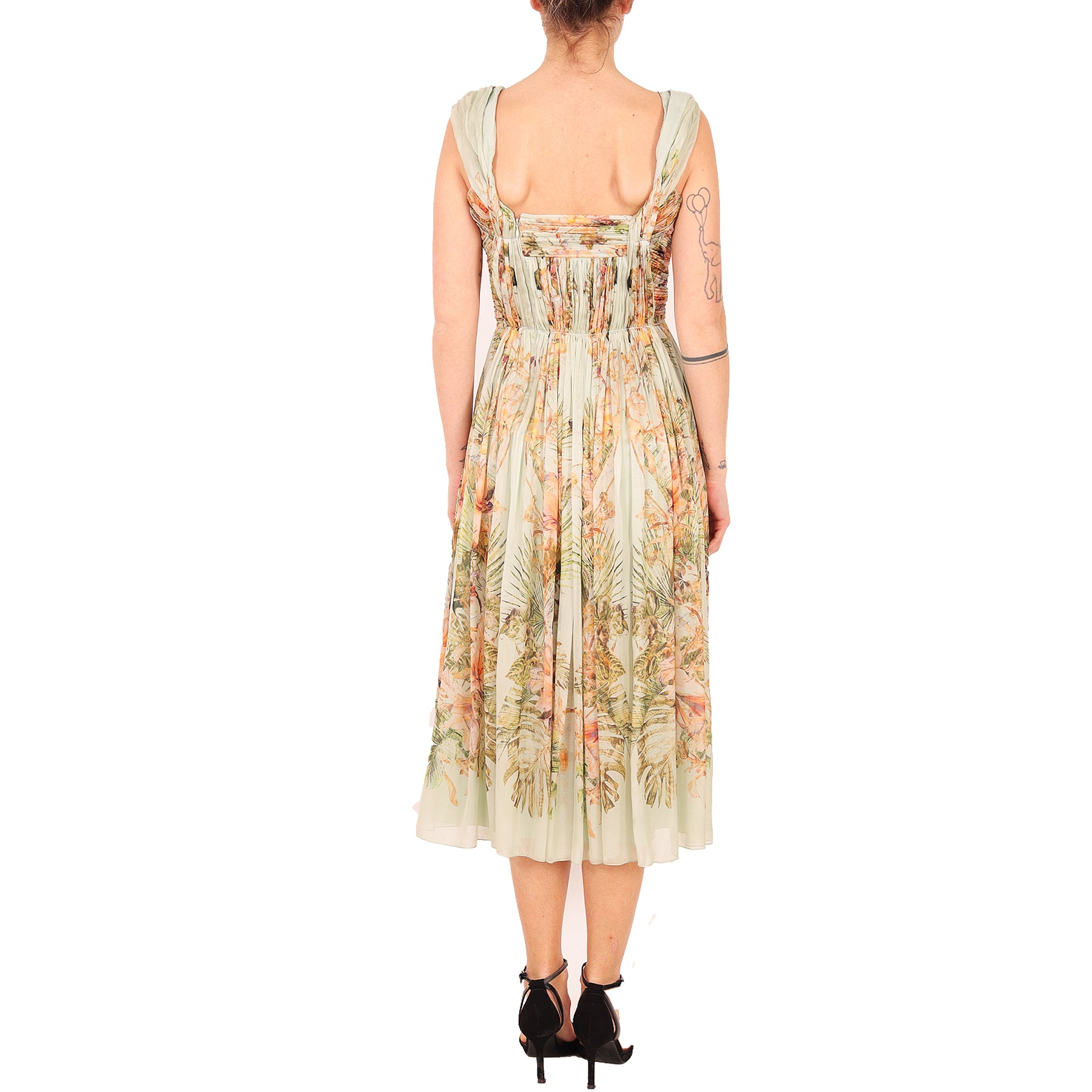Abito Alberta Ferretti, colore verde, a fiori, plissettato, in seta, senza maniche, zip laterale