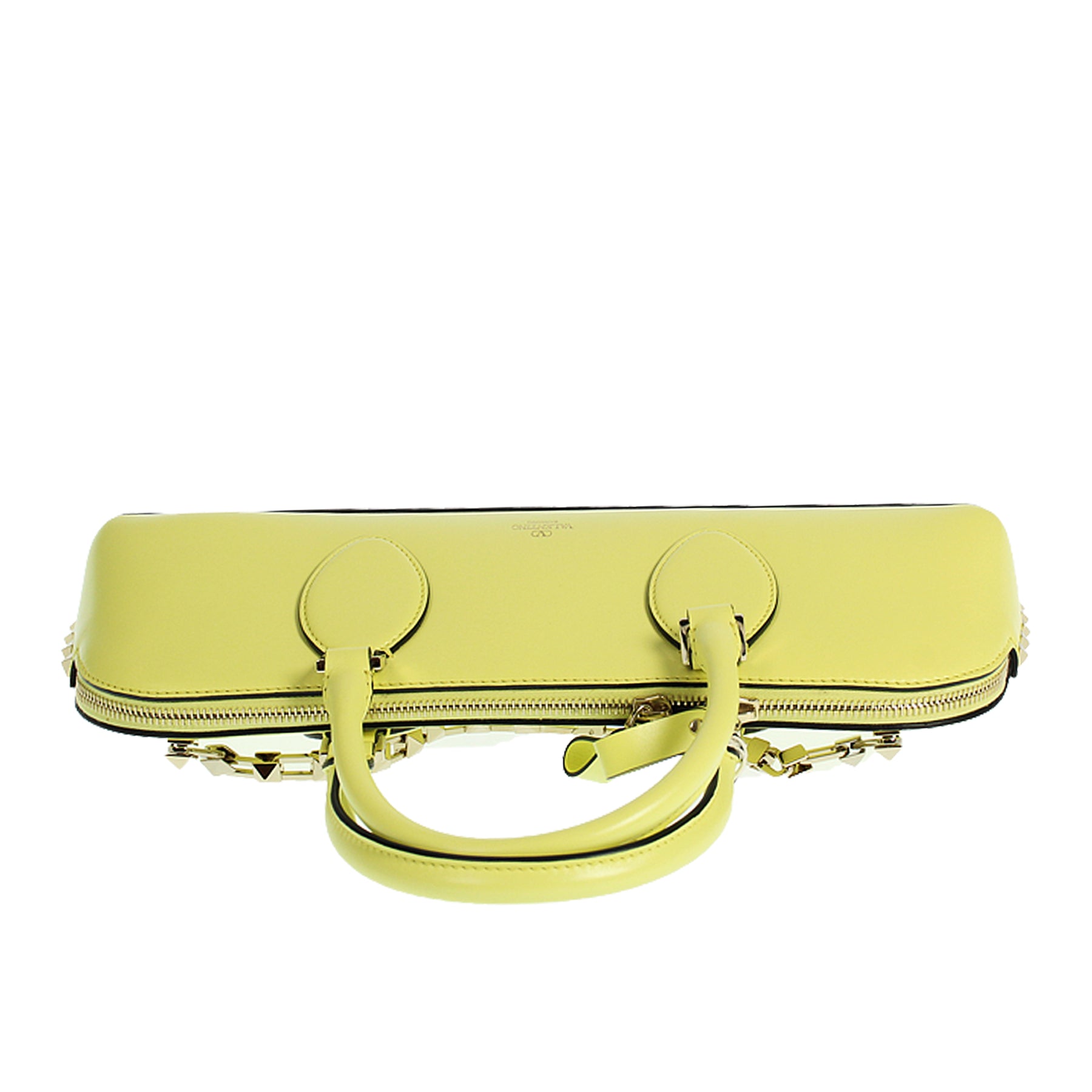 Borsa Valentino, in pelle gialla, doppi manici, fondo con borchie dorate, chiusura con zip, tracolla rimovibile, taschino interno portacarte