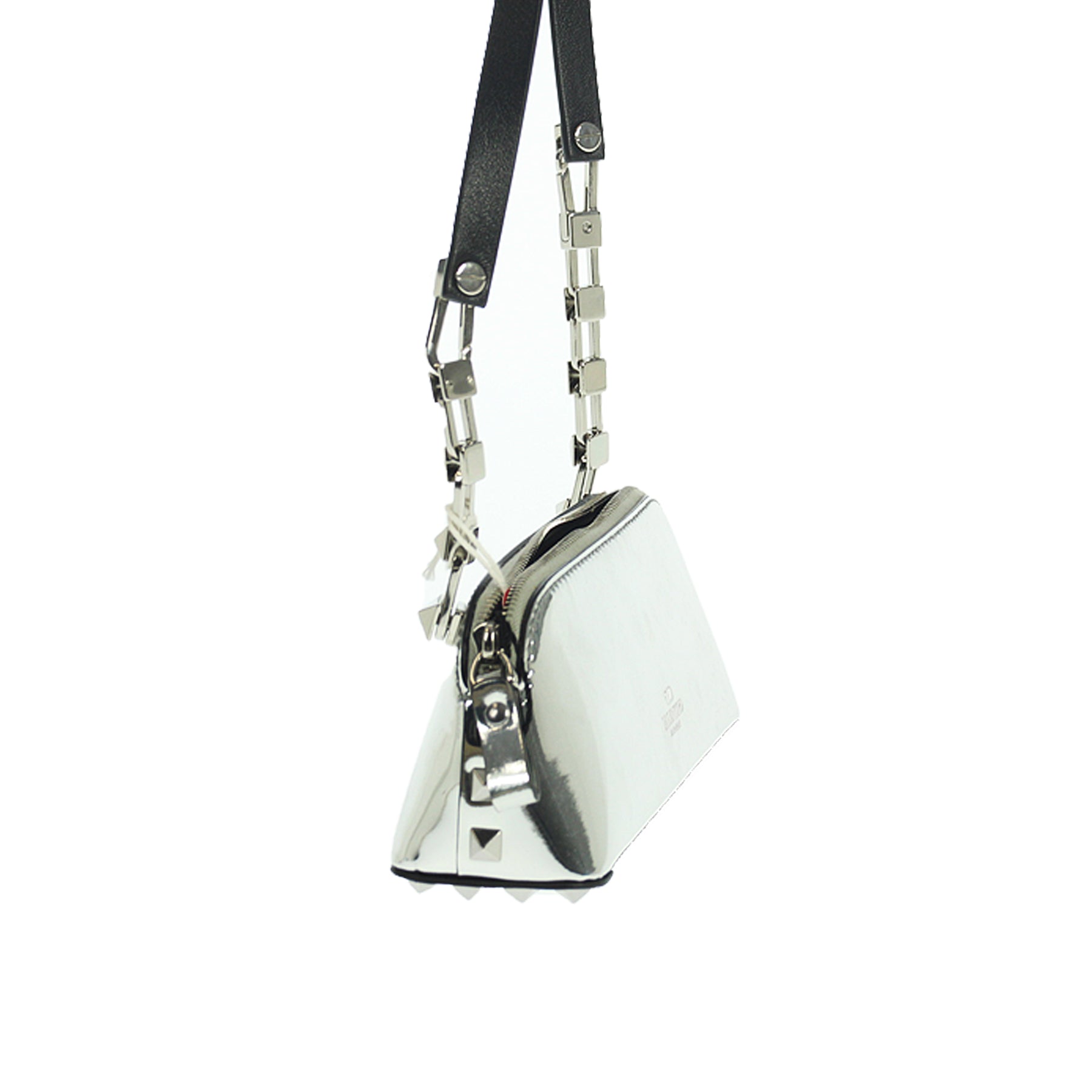 Mini borsa Valentino, in pelle specchiata, colore argento, con borchie, tracollina rimovibile, chiusura con zip, logo impresso sul retro