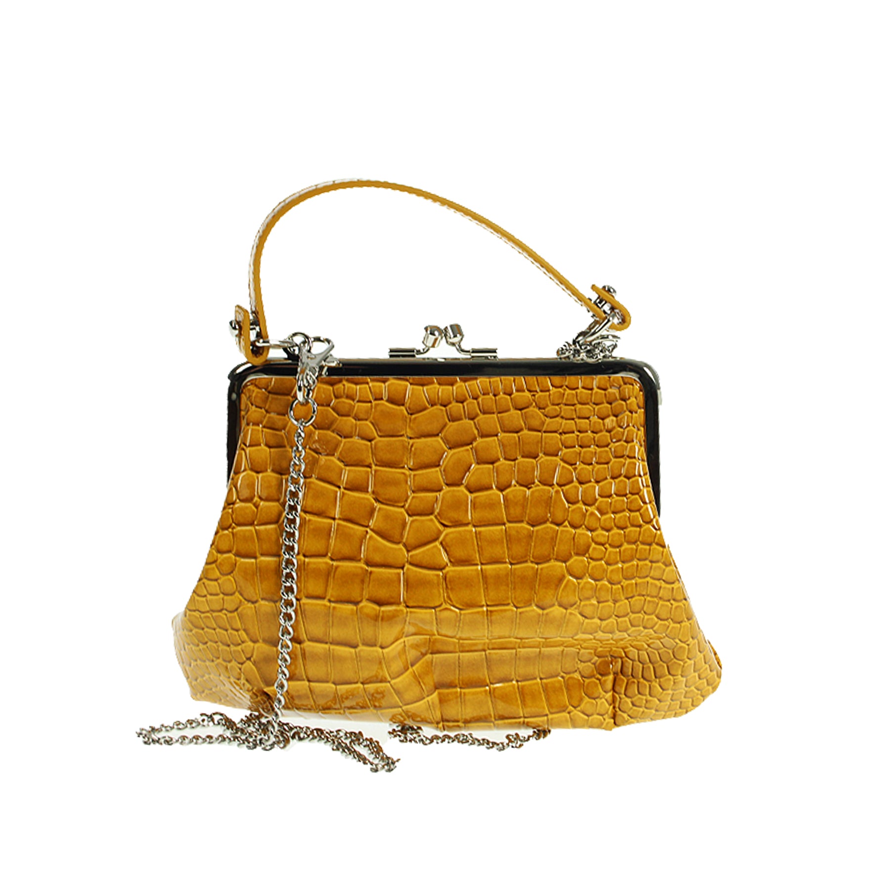Borsa Vivienne Westwood, modello Granny frame, in ecopelle stampa cocco, color senape, logo frontale, chiusura a scatto, tracolla in catena rimovibile