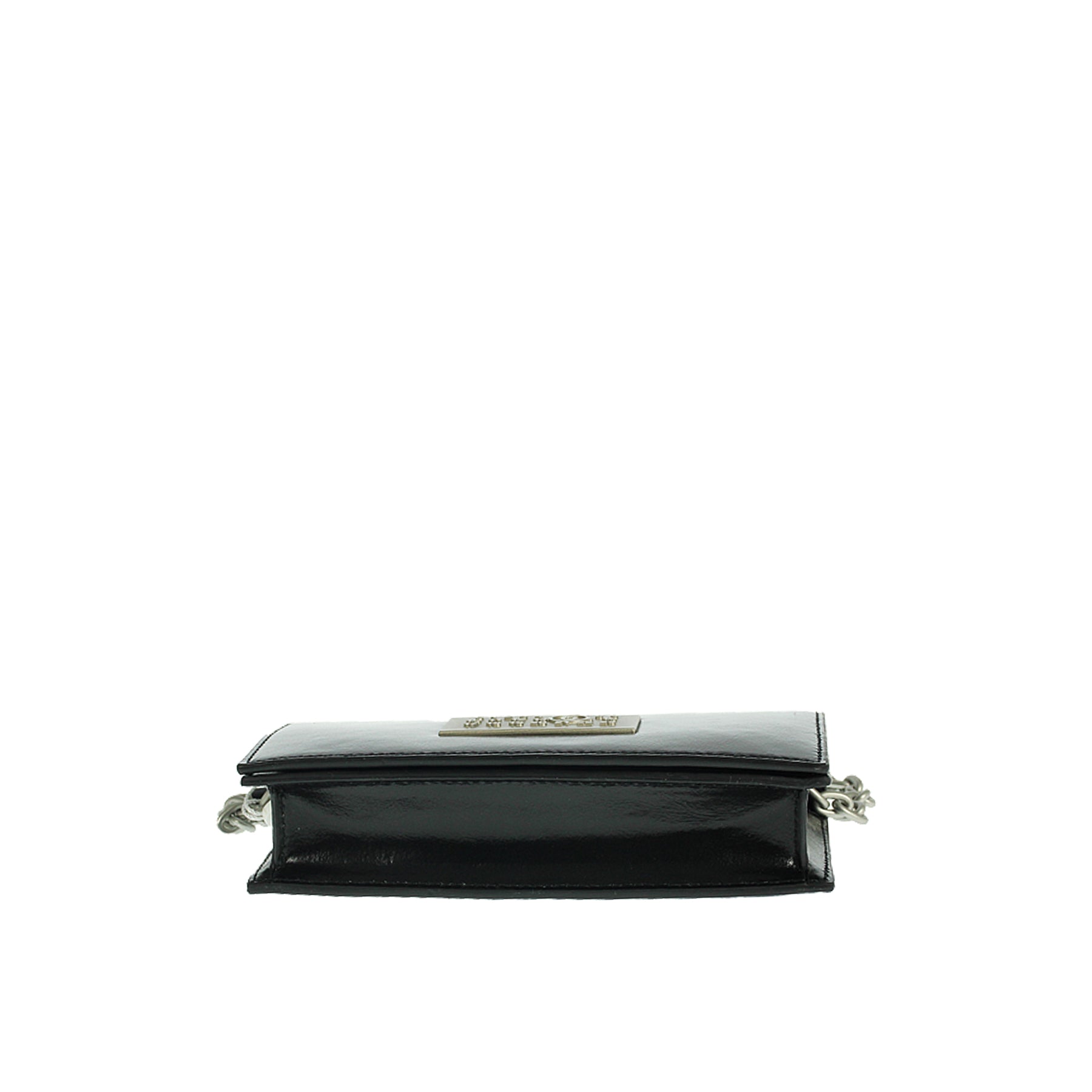 Mini borsa Maison Margiela MM6, in pelle nera, con patta, tracolla in catena argento, logo metallico sul davanti, chiusura con bottone magnetico