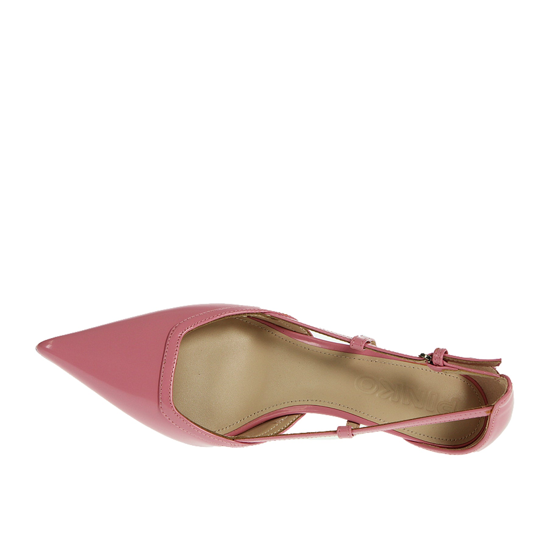 Decolletè Pinko, in vernice rosa, a punta, con tacco kitten, cinturino laterale, suola in gomma, altezza tacco 5 cm