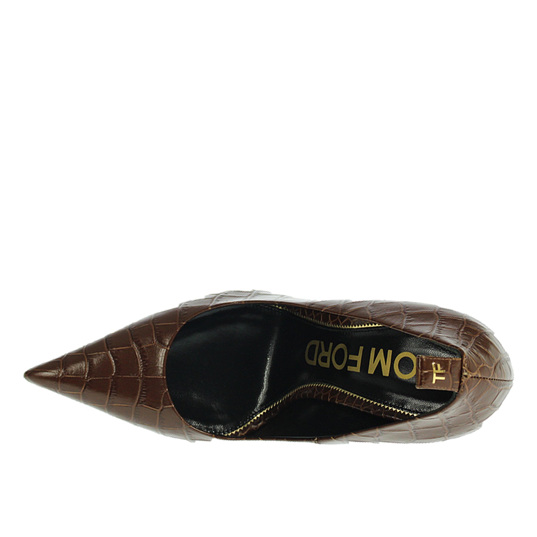 Decolletè Tom Ford, in pelle stampa cocco, colore marrone, a punta, con tacco a cono, con plateau 2,5 cm, suola in vero cuoio, modello iconico della maison, altezza tacco 14, made in italy