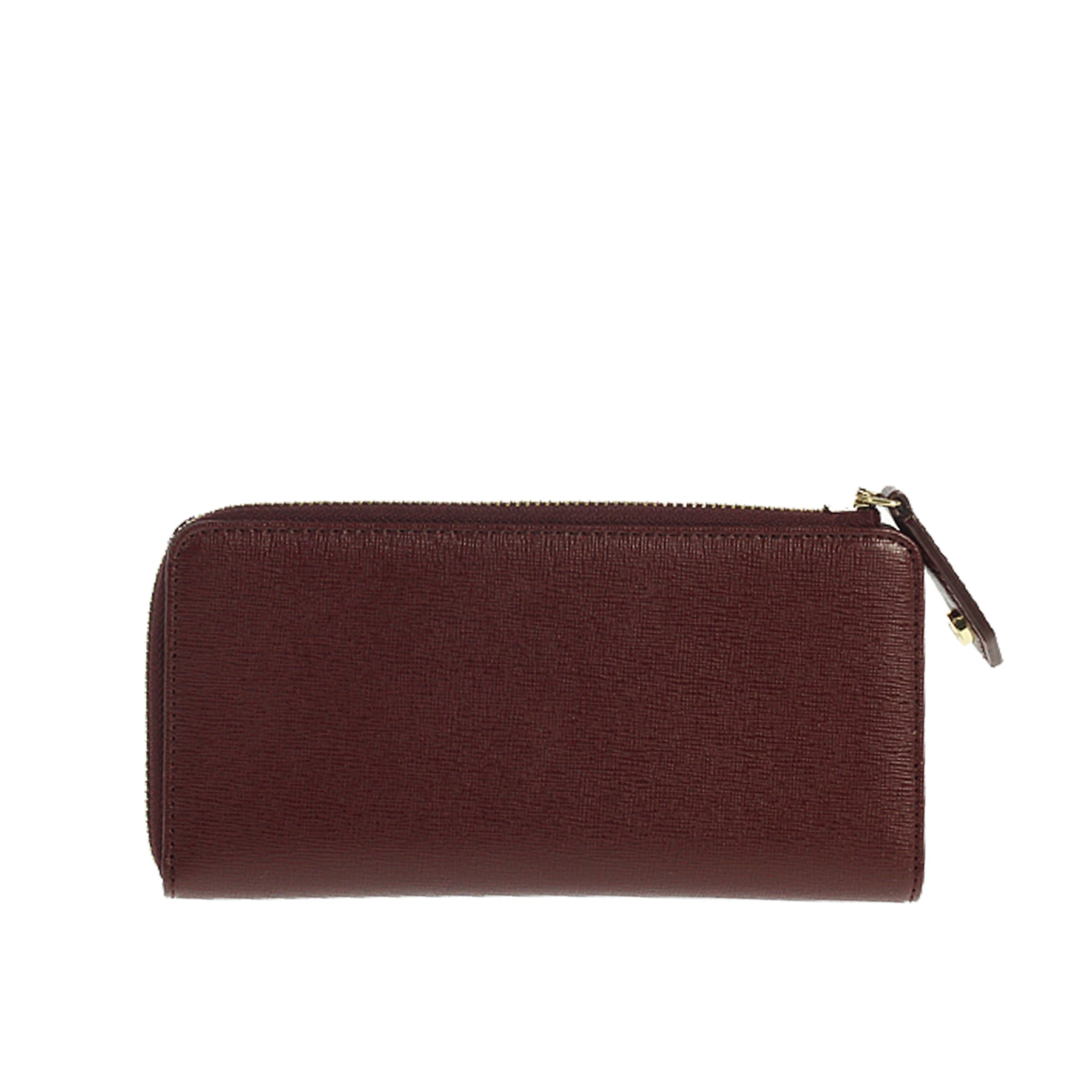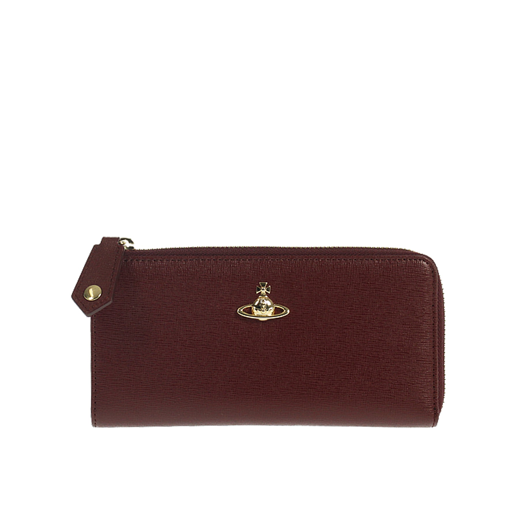 Portafoglio Vivienne Westwood, in pelle butterata, colore bordeaux, chiusura con cerniera, scomparti interni con portacarte, lunghezza cm 19