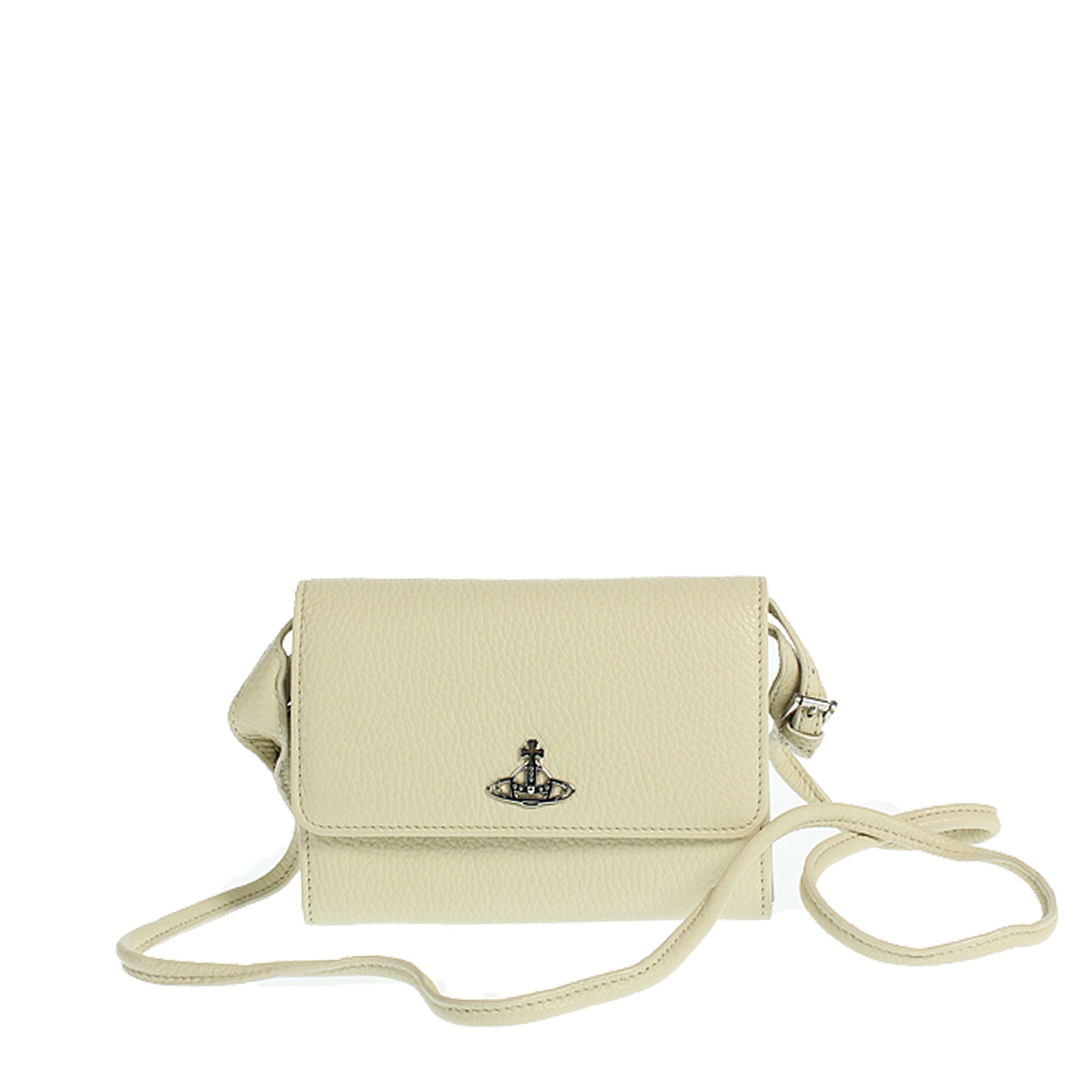 Portafoglio a tracolla Vivienne Westwood, in pelle butterata, colore beige, strobo argento applicato,tracolla allungabile, doppio scomparto, tasca con cerniera, portacarte interno, lunghezza cm 16, retail € 275,00