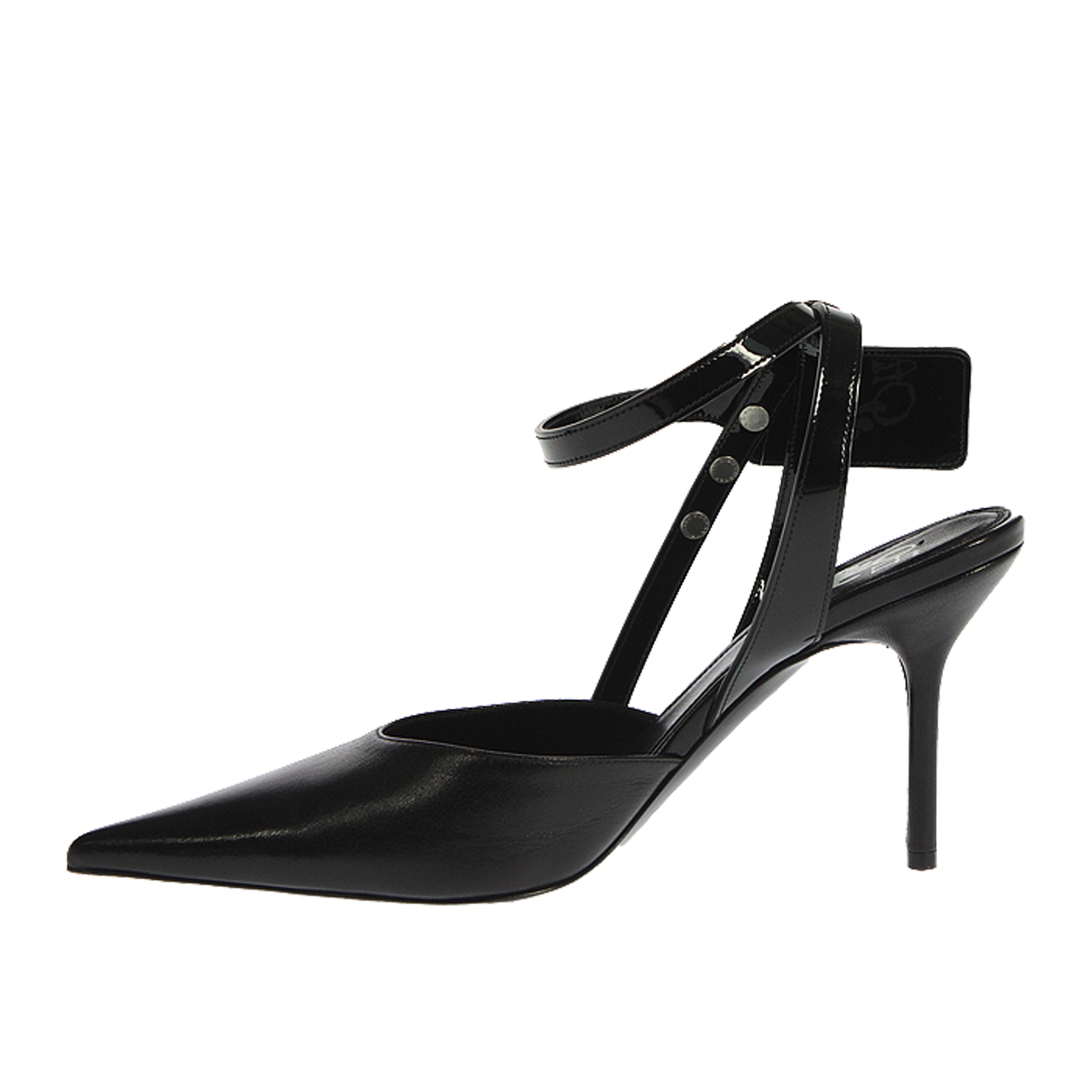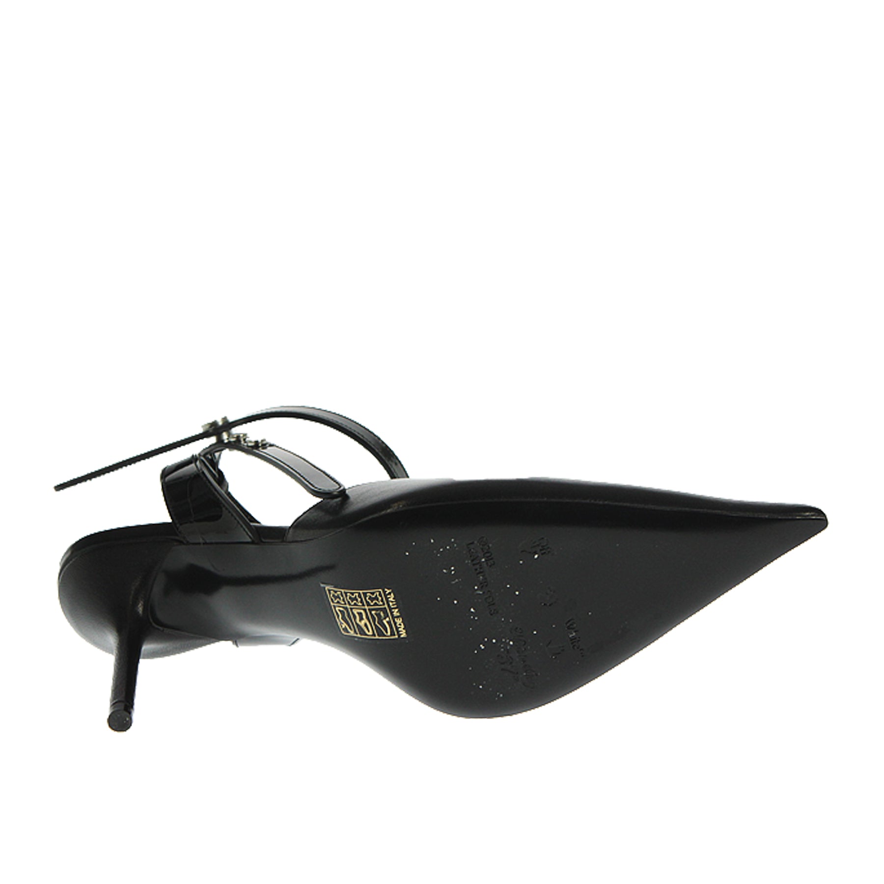 Sandalo Off-White, in pelle nera, a punta, con cinturino in vernice alla caviglia, tacco a spillo, suola in cuoio, altezza tacco 9 cm