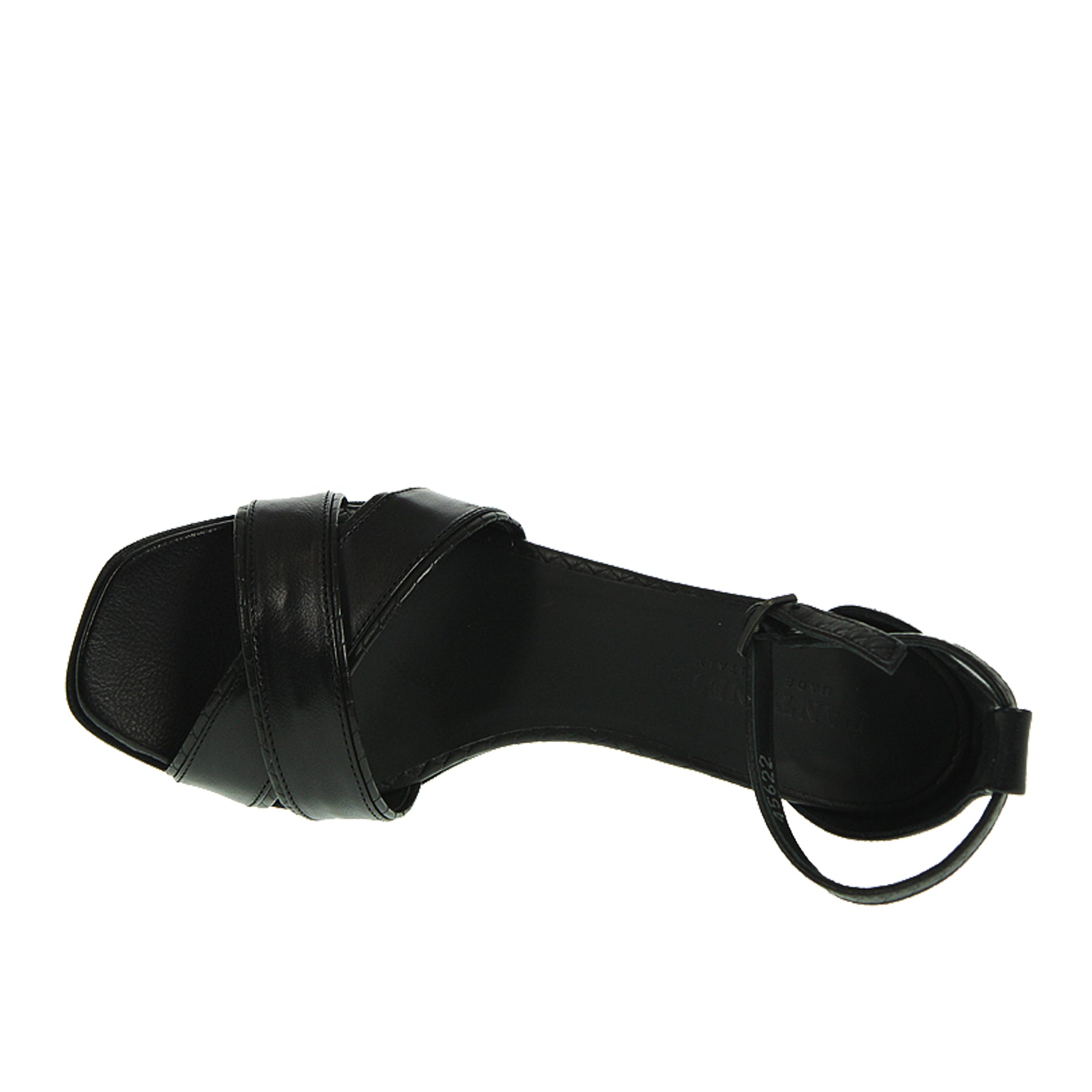 Sandalo Pantanetti, in pelle, colore nero, con fascetta incrociata, cinturino alla caviglia, suola in cuoio, altezza tacco 5,5 cm