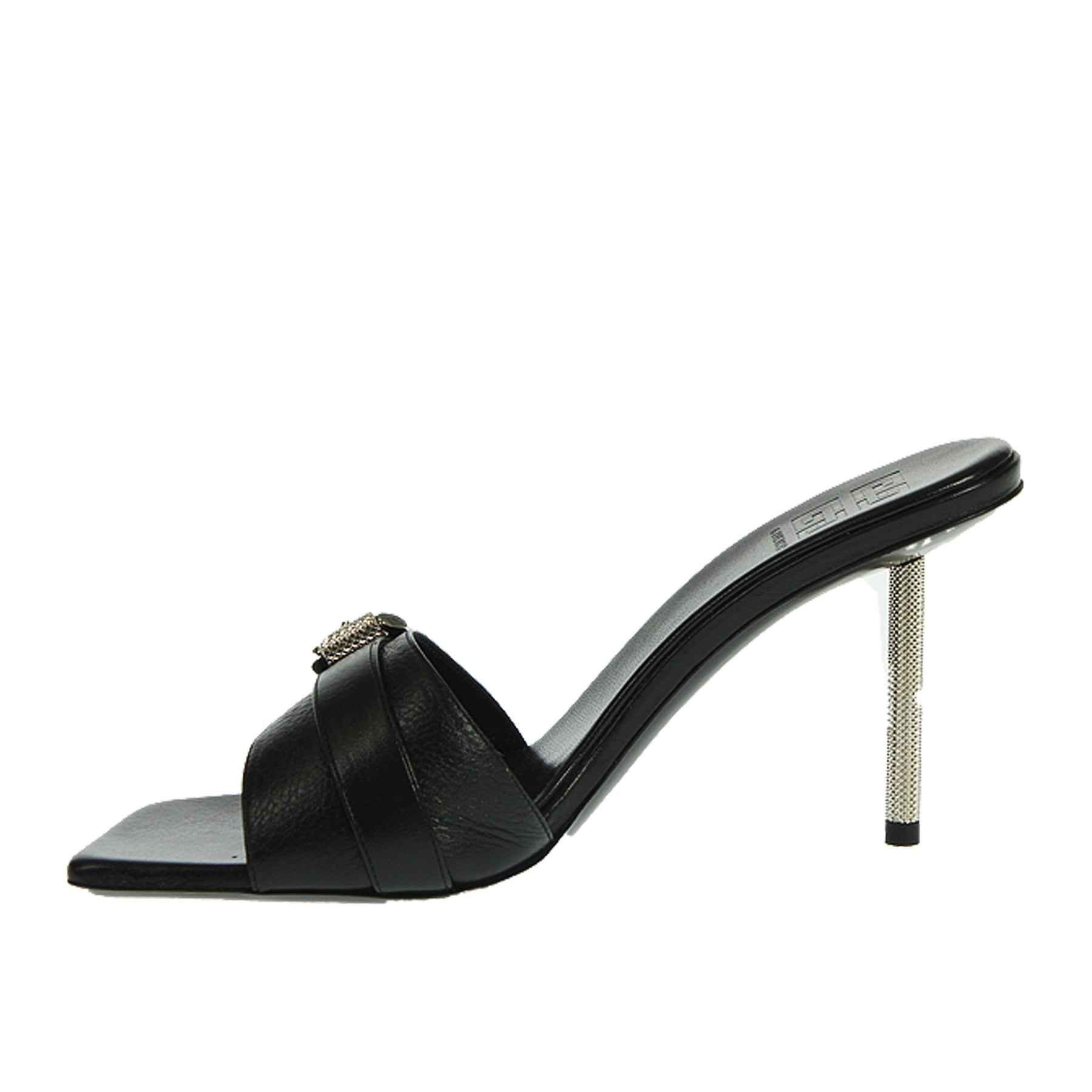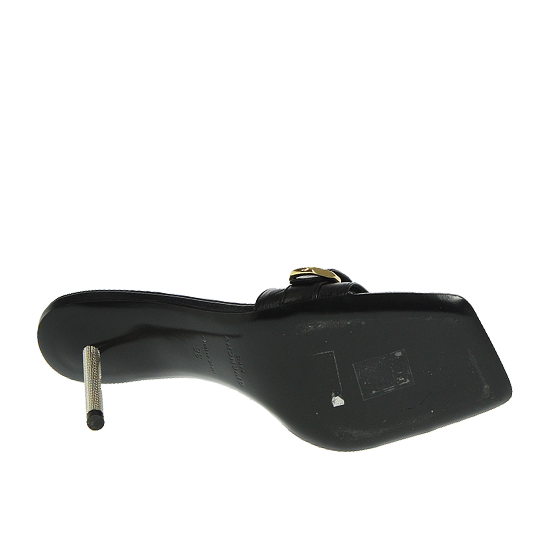 Sandalo Givenchy, in pelle nera, tacco a spillo in metallo argentato, fibbia metallica sul davanti, suola in cuoio, altezza tacco 9 cm