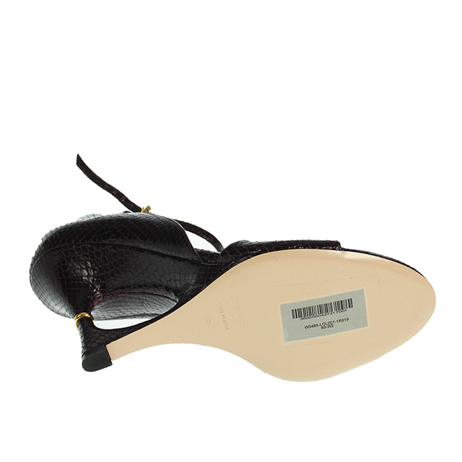 Sandalo Tom Ford, in pelle stampa pitone, colore viola scuro, con tacco sagomato, con fascetta sottile sul davanti, suola in vero cuoio, con cinturino alla caviglia, altezza tacco 11, made in italy