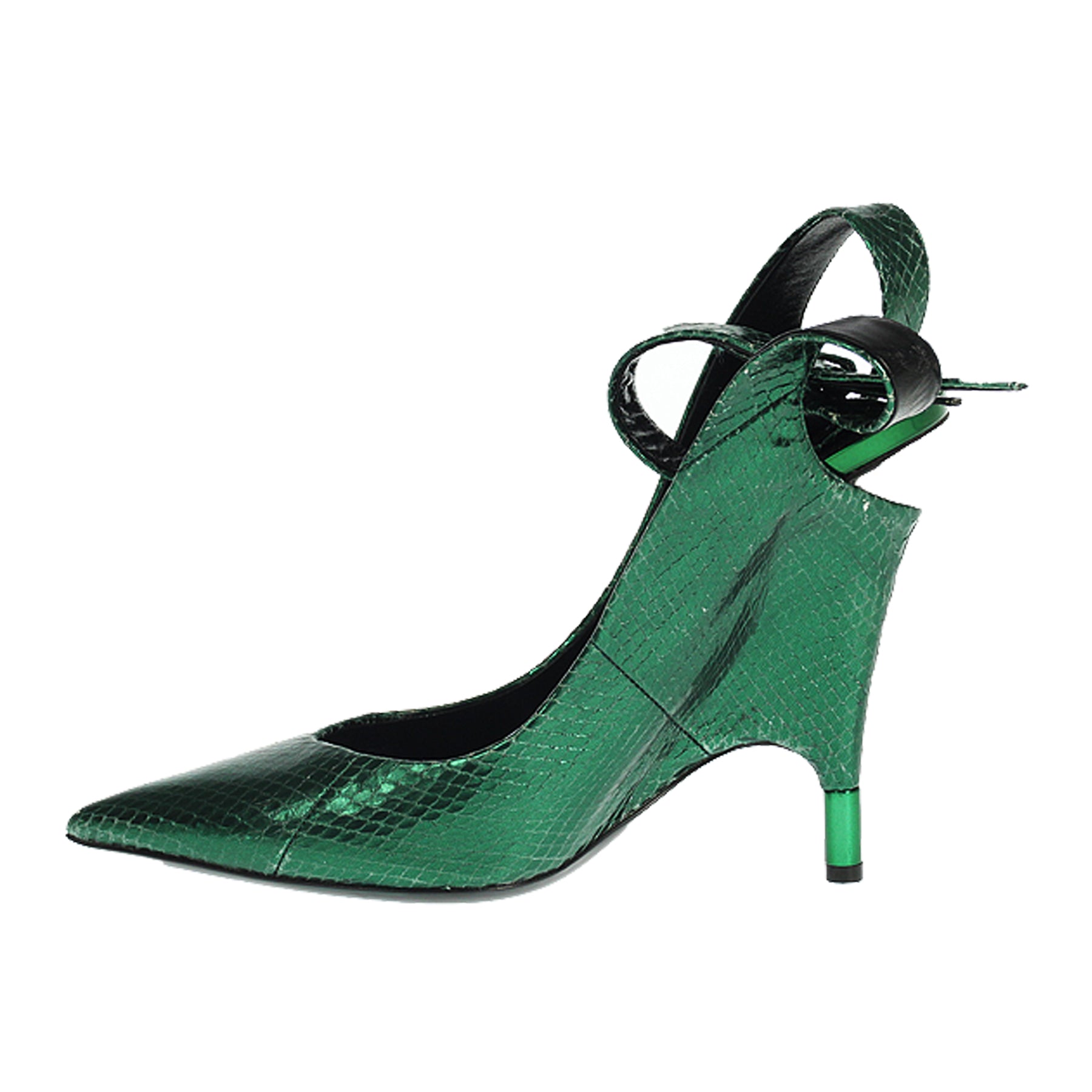 Sling back Tom Ford, in pelle stampa rettile, colore verde, a punta, con tacco platform e a spillo in pelle e acciaio, modello iconico della maison, suola in vero cuoio, chiusura con cinturino alla caviglia, altezza tacco 13 cm, made in italy