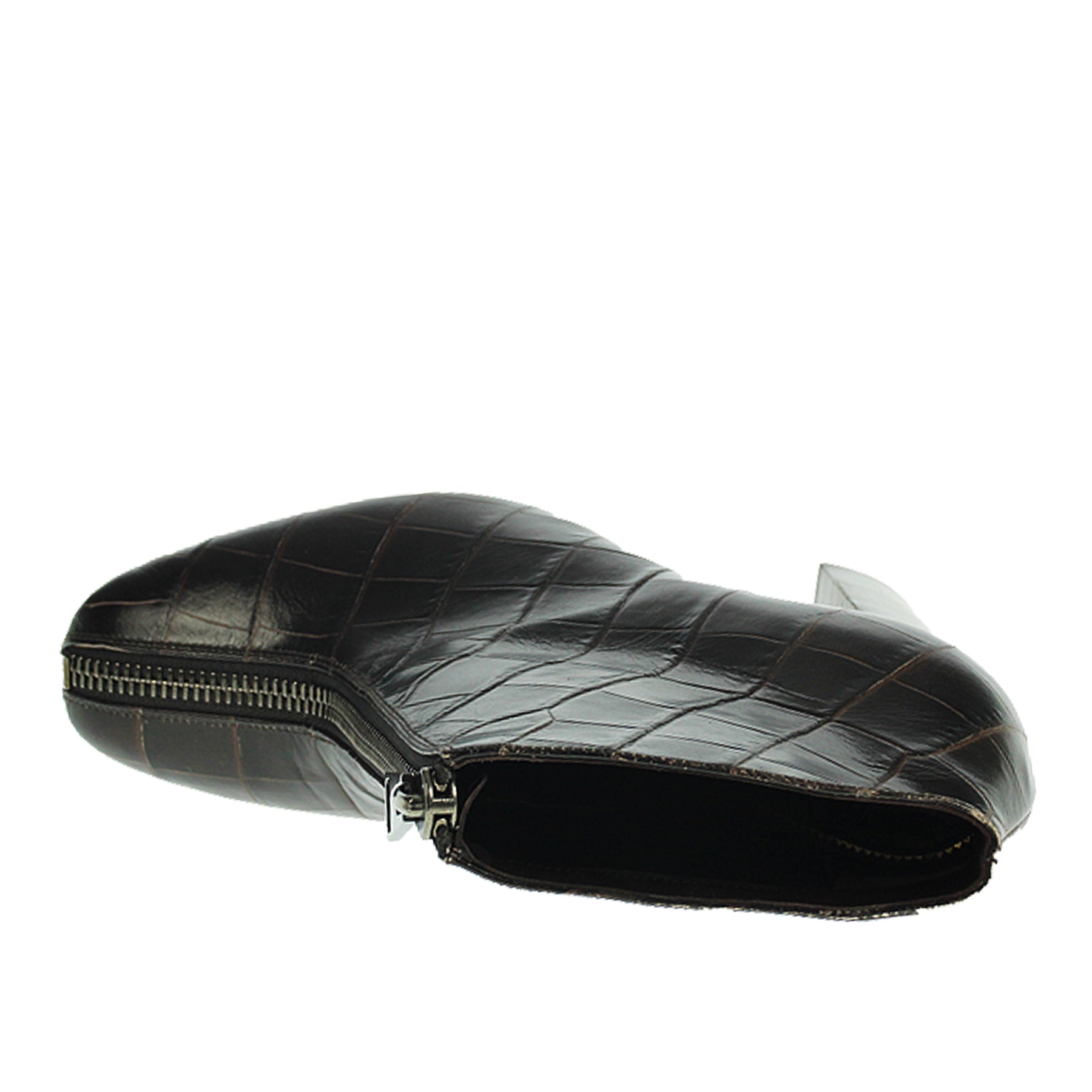 Tronchetto Tom Ford, in pelle stampa cocco, colore marrone, punta arrotondata, con tacco in legno, modello iconico della maison, suola in vero cuoio, chiusura con zip frontale, altezza tacco 11 cm, made in italy