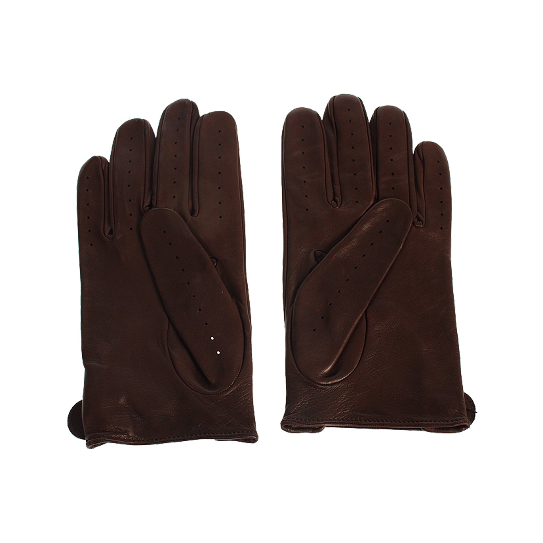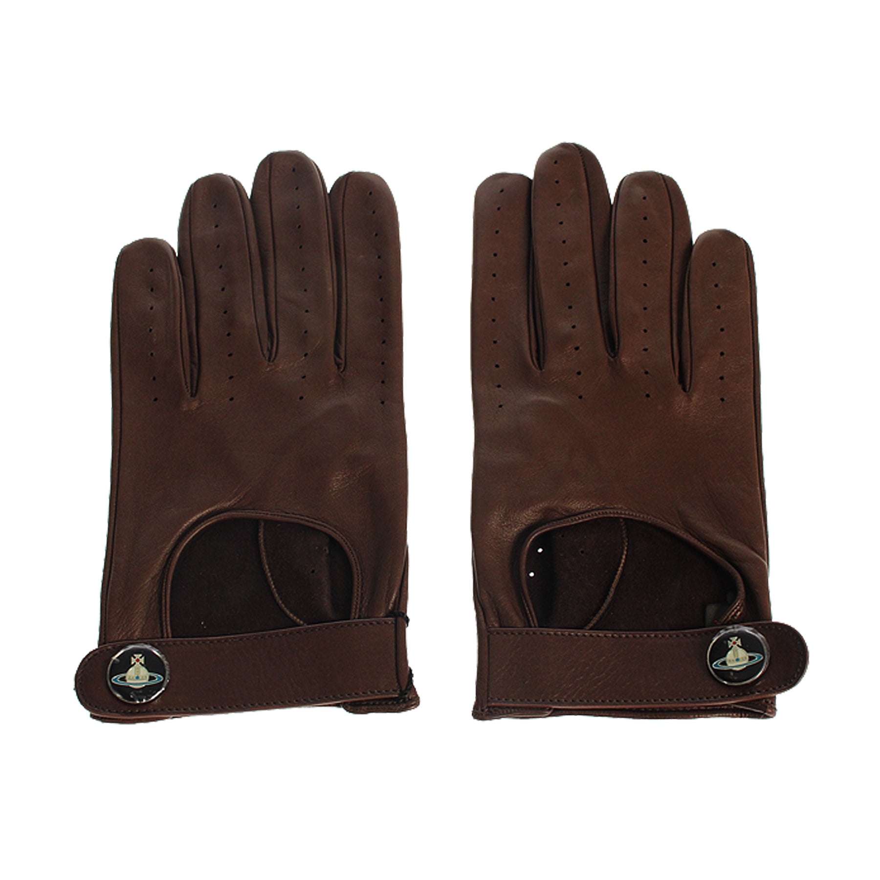 Guanti in pelle Vivienne Westwood, colore marrone, modello da pilota da corsa, impunture sulle dita, chiusura con bottone a pressione sul polso, retail € 225,00