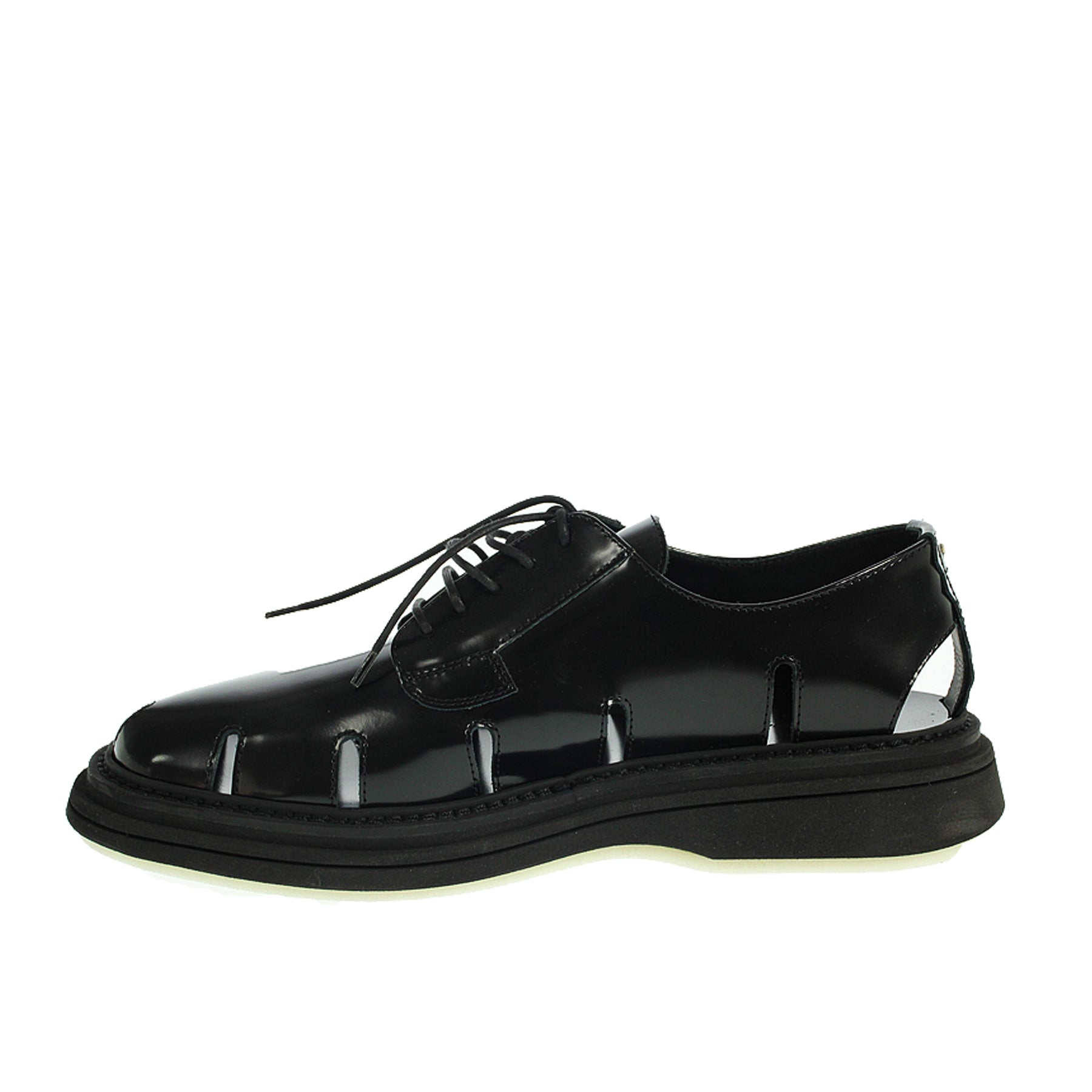 Stringata The-Antipode, in pelle lucida nera, con aperture, suola in gomma