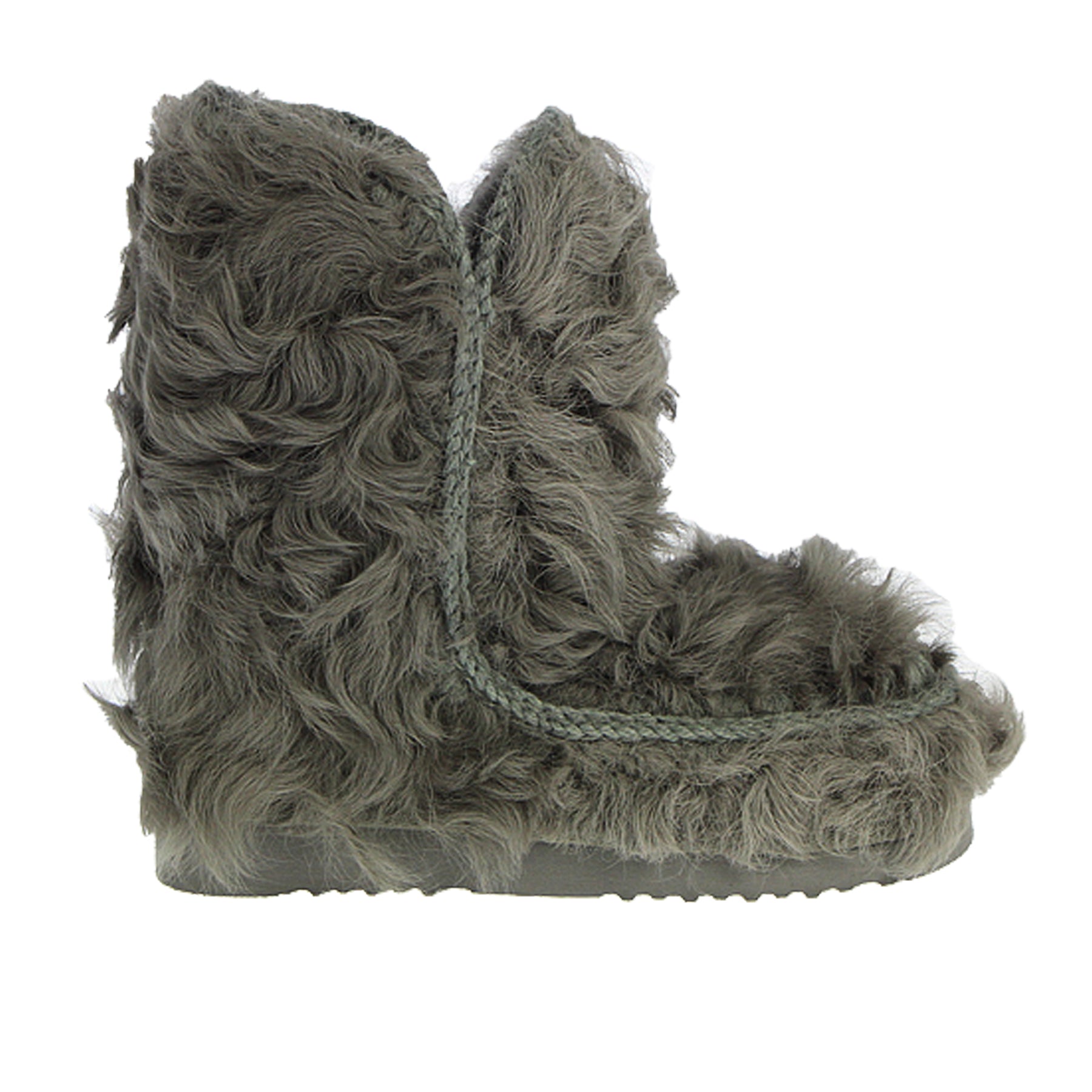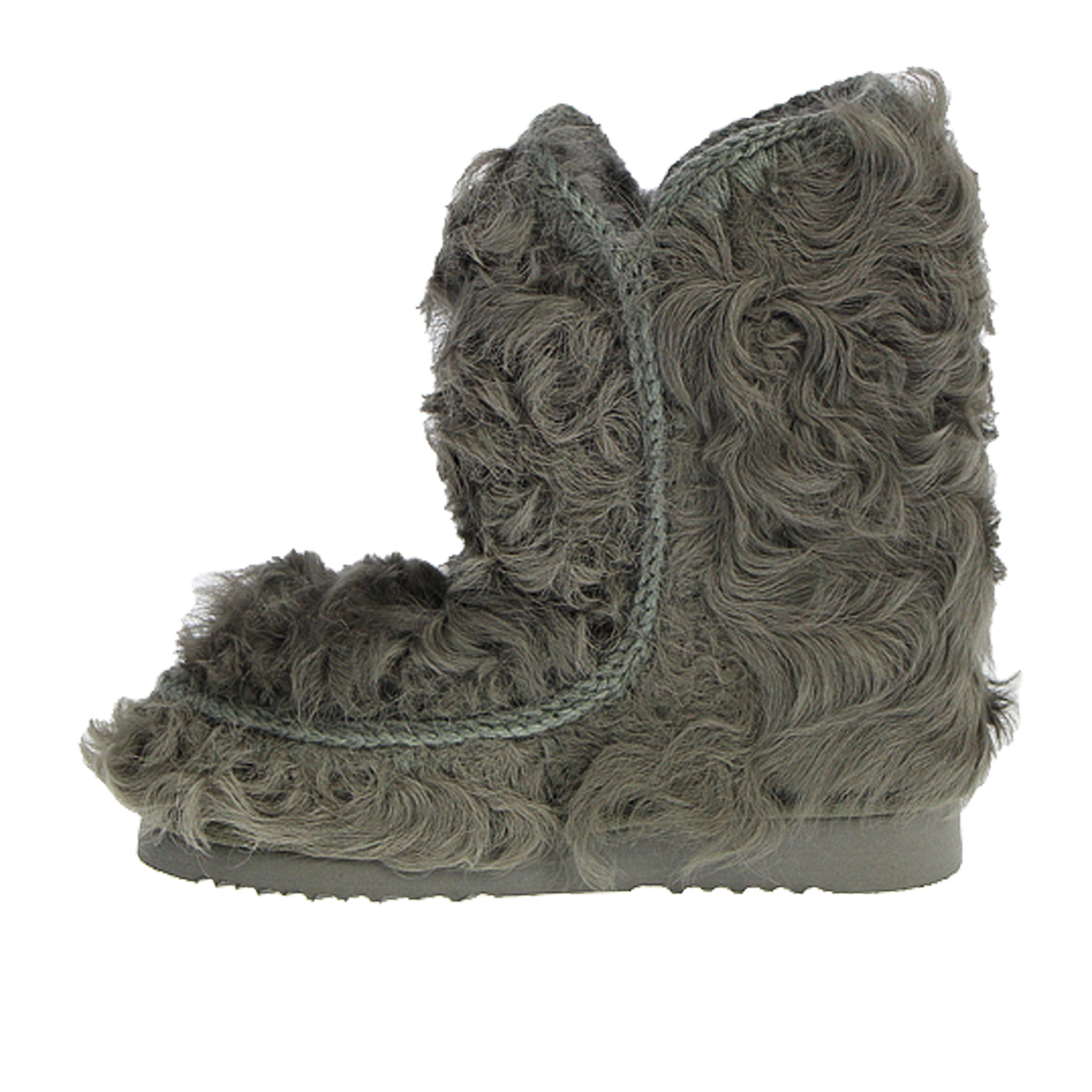 Eskimo Mou, modello 24 chekiang fur, in pelliccia di capra chekiang, con interno in montone, con bordi in lana all'uncinetto, colore grigio, logo metallico sul retro, con suola in gomma, altezza del gambale 24 cm