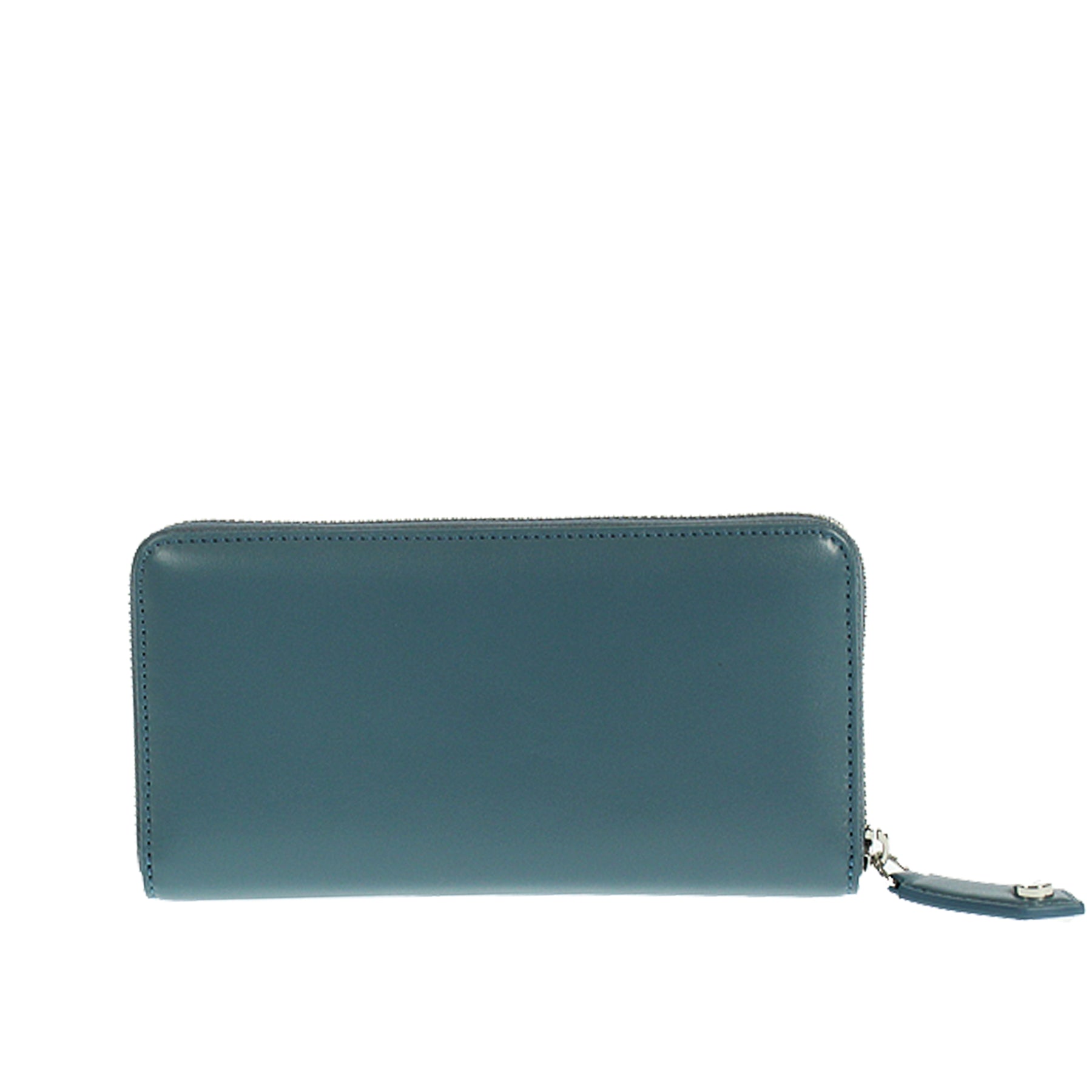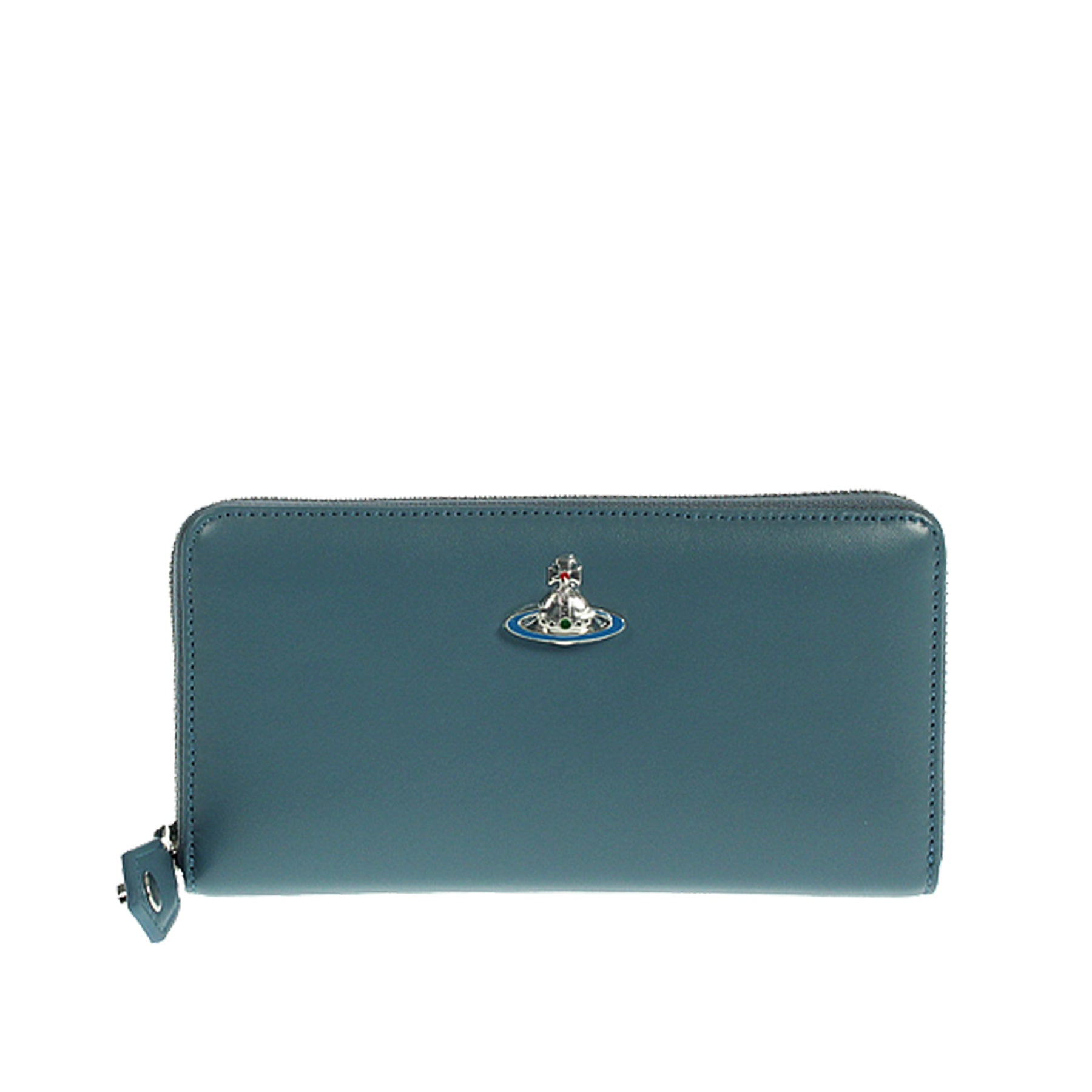 Portafoglio Vivienne Westwood, in pelle, colore avio, chiusura con zip, logo strobo applicato, tastasca interna con zip, scopartimenti vari, taschini portacarte, lughezza cm 19, retail € 220,00