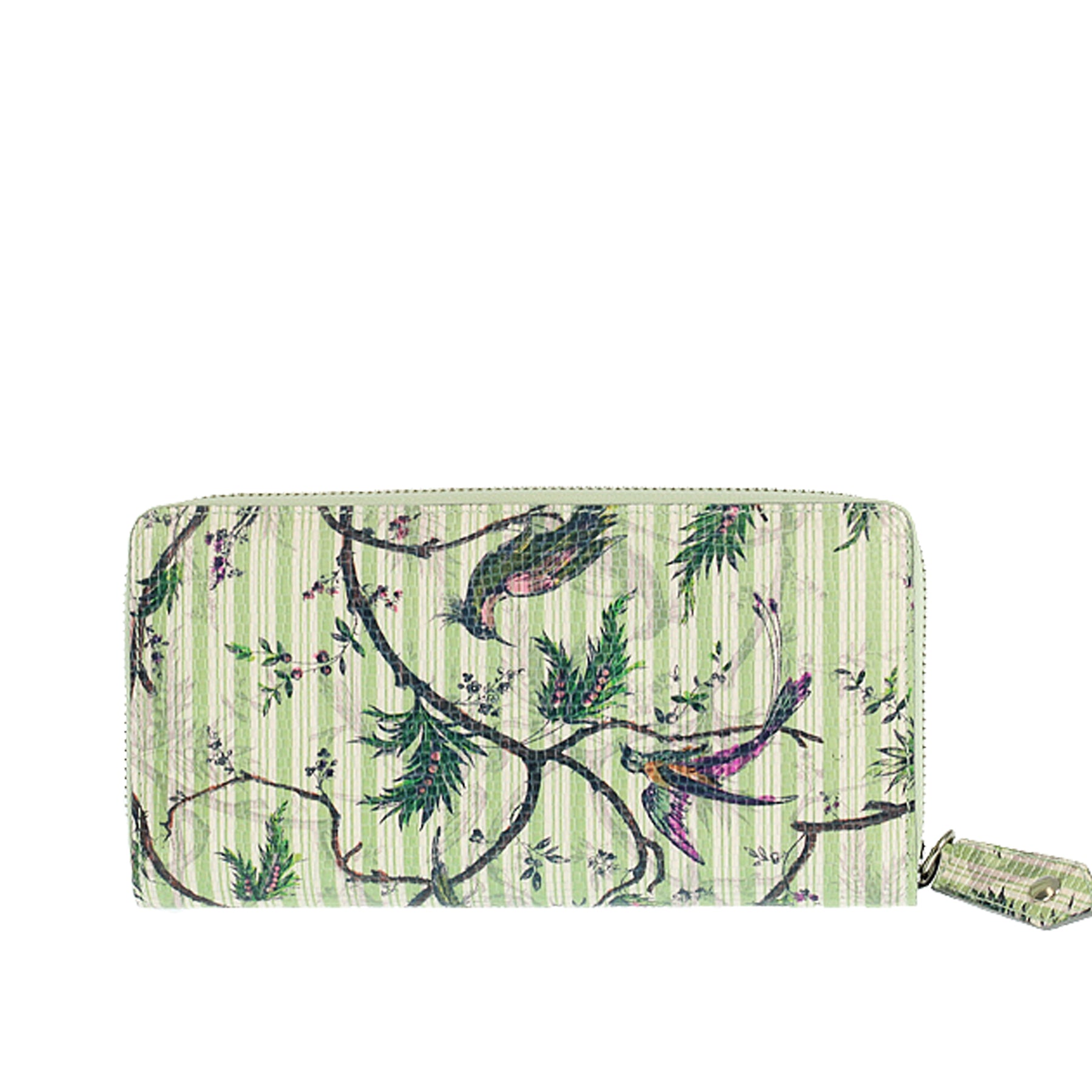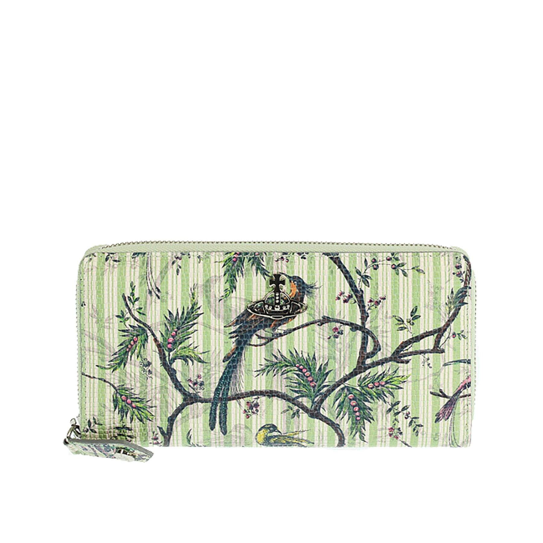 Portafoglio Vivienne Westwood, in saffiano, colore verde con stampa fantasia, logo strobo argento applicato, chiusura con cerniera, tasca interna con cerniera, multiscomparto, tasche portacarte, lunghezza cm 20, retail € 205,00
