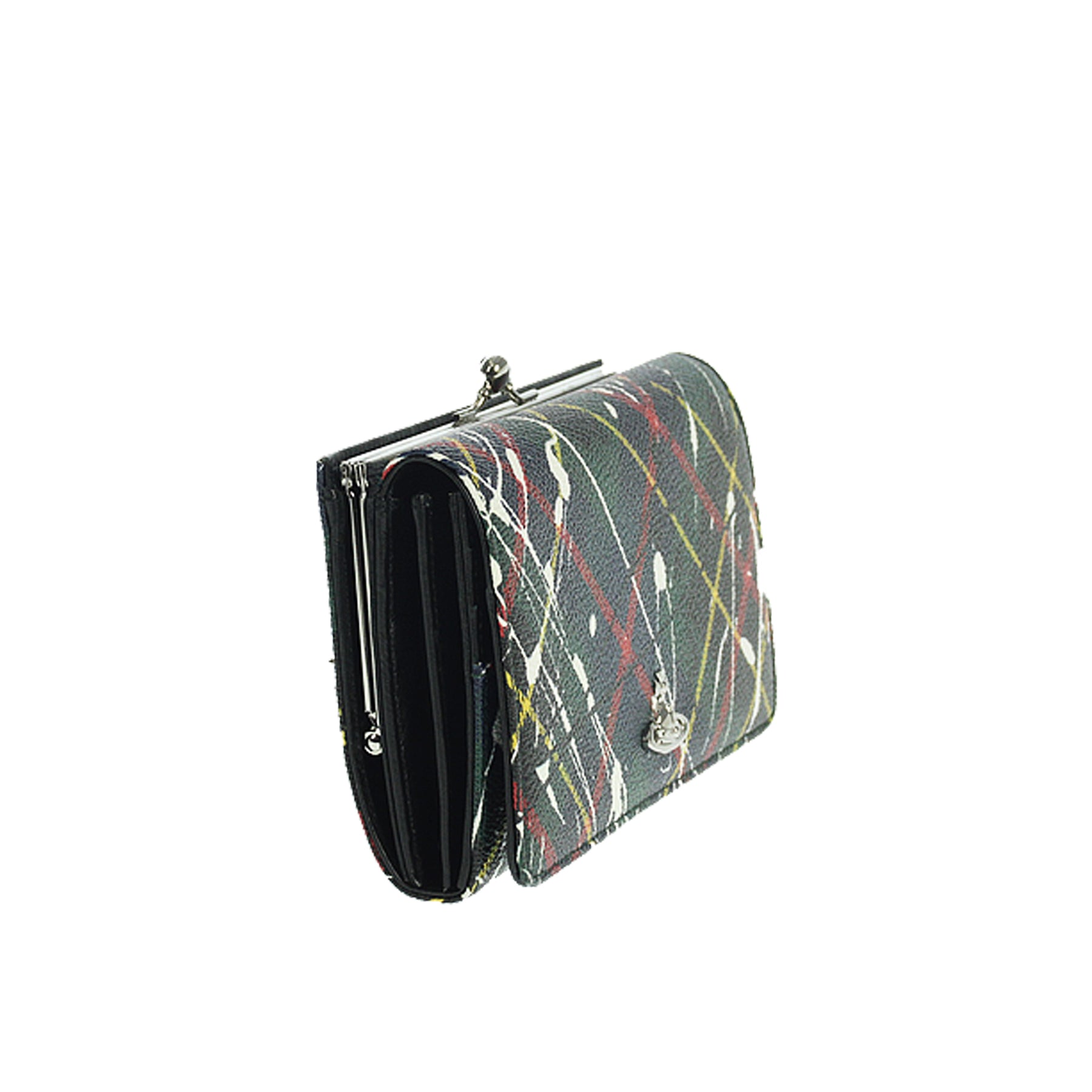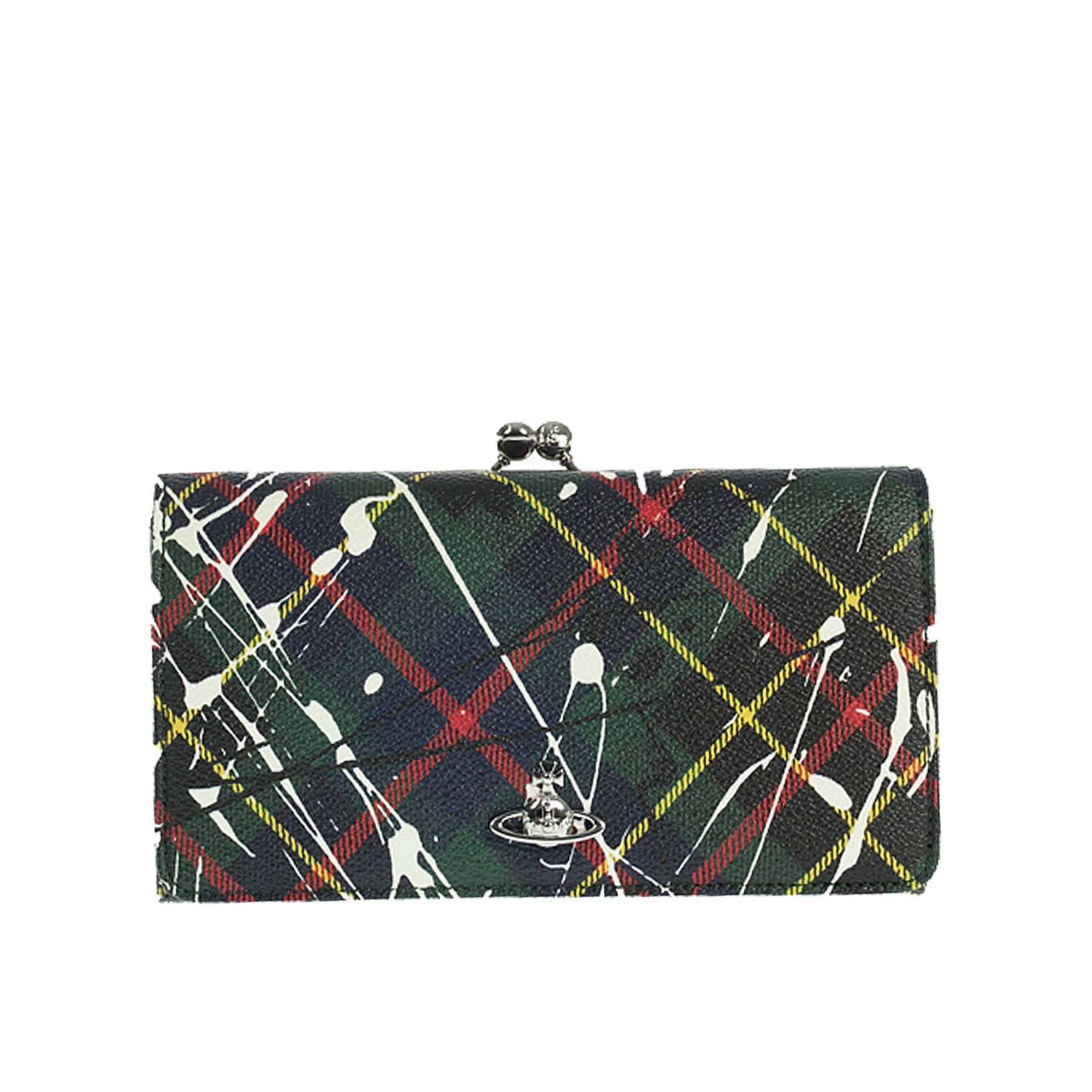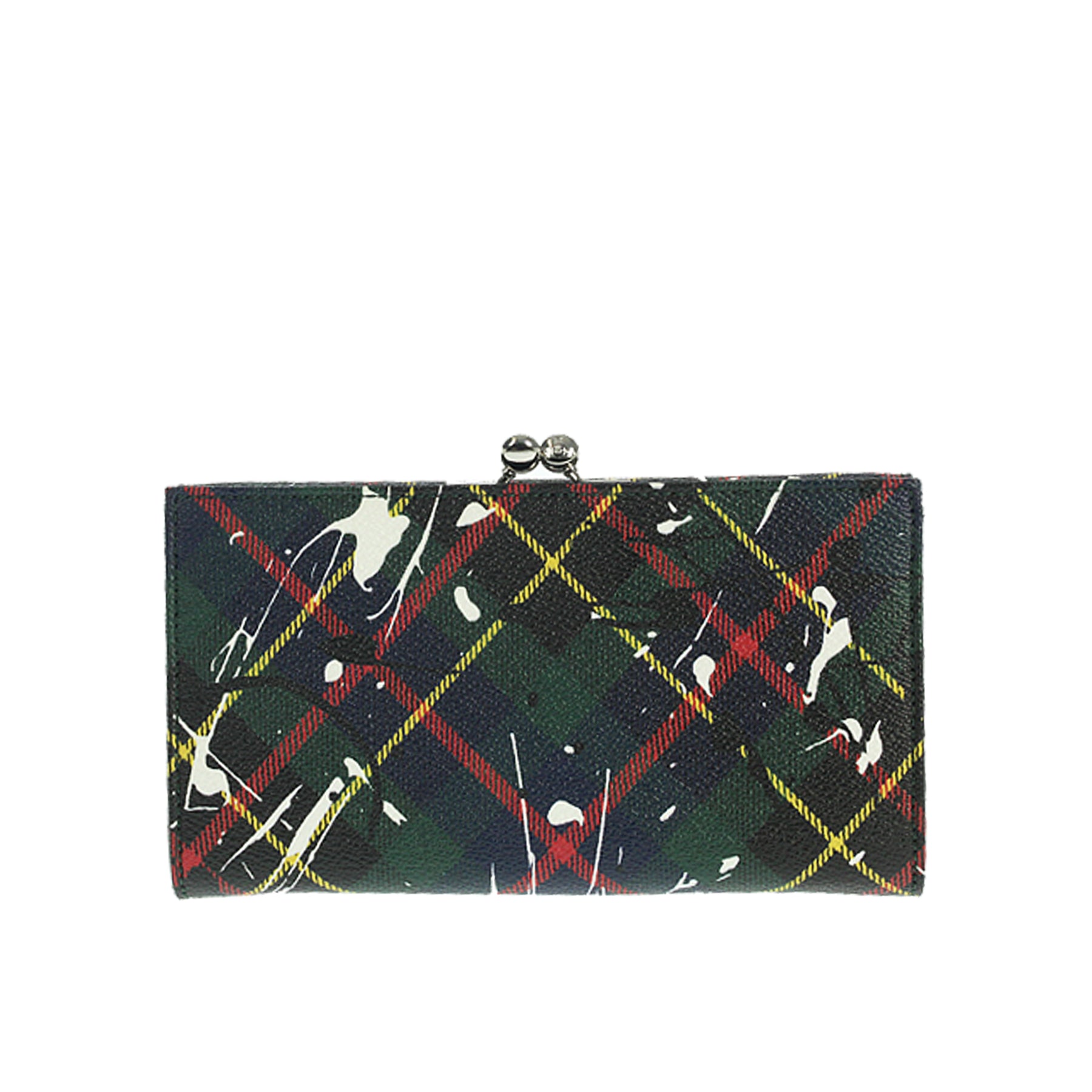 Portafoglio Vivienne Westwood, in saffiano, tartan astratto, chiusura con bottone a pressione e bottone a clips, multicpomparto, portacarte vari, lunghezza cm 20, retail € 285,00
