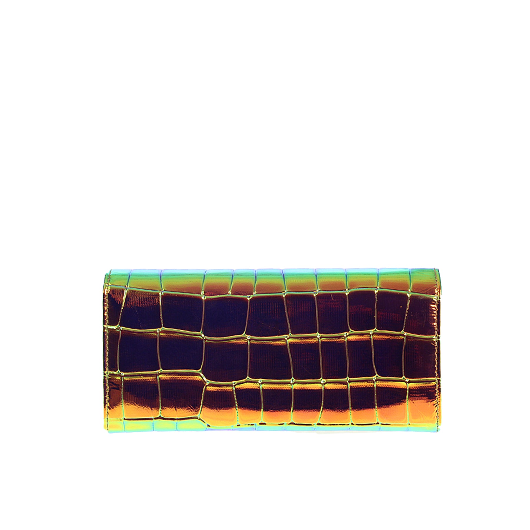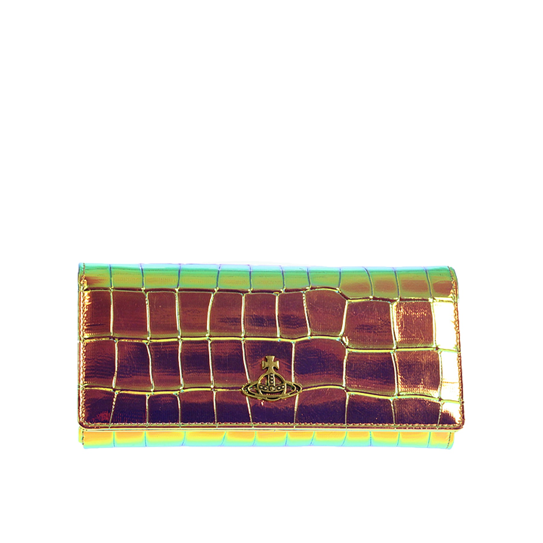 Portafoglio vivienne Westwood, in pelle effetto cocco, lurex, logo strobo oro applicato, chiusura con doppio bottone a pressione tasca interna con cerniera, multicsomparto, tasche portacarte, lunghezza cm 19, retail € 220,00