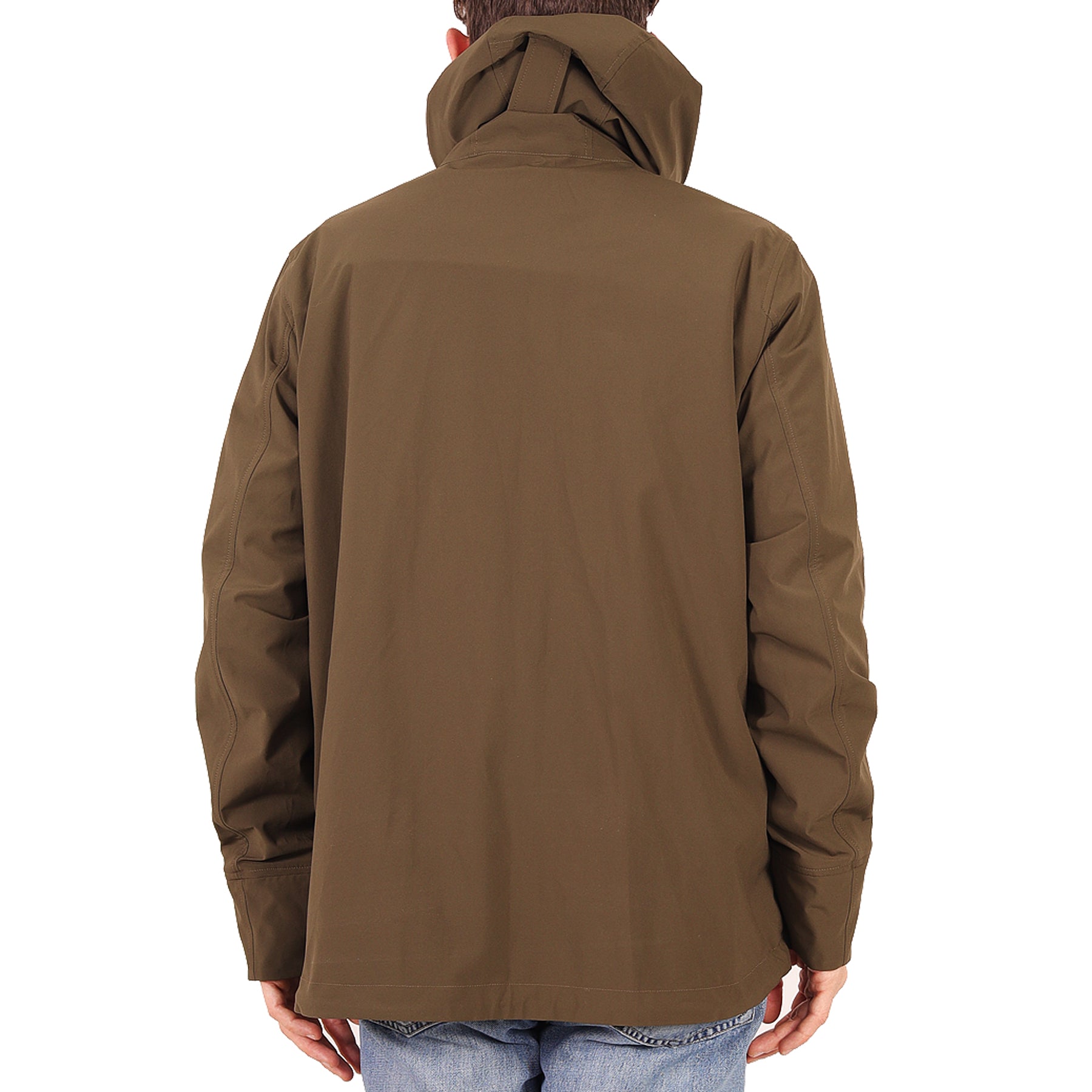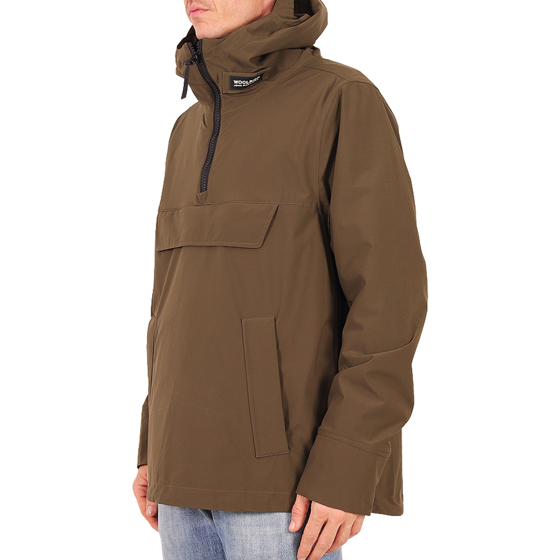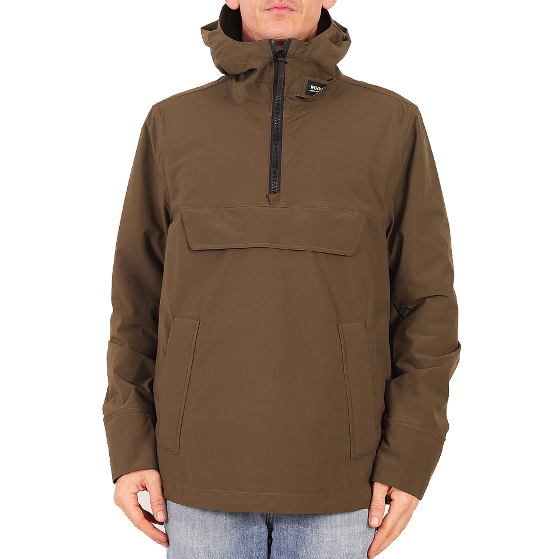 Giacca impermeabile Woolrich, colore verde militare, con tasche, chiusura con mezza zip, con cappuccio, presenta micro imperfezioni