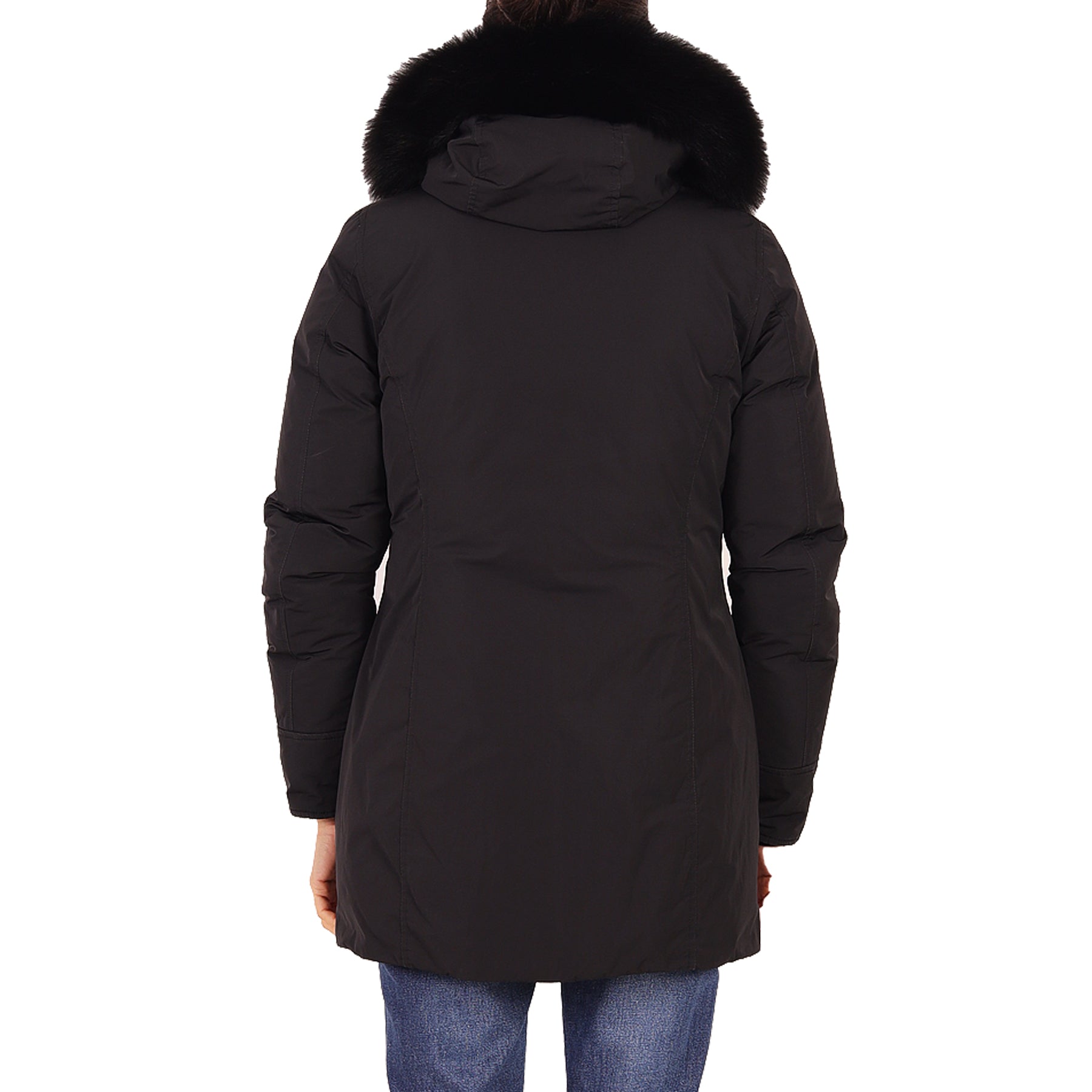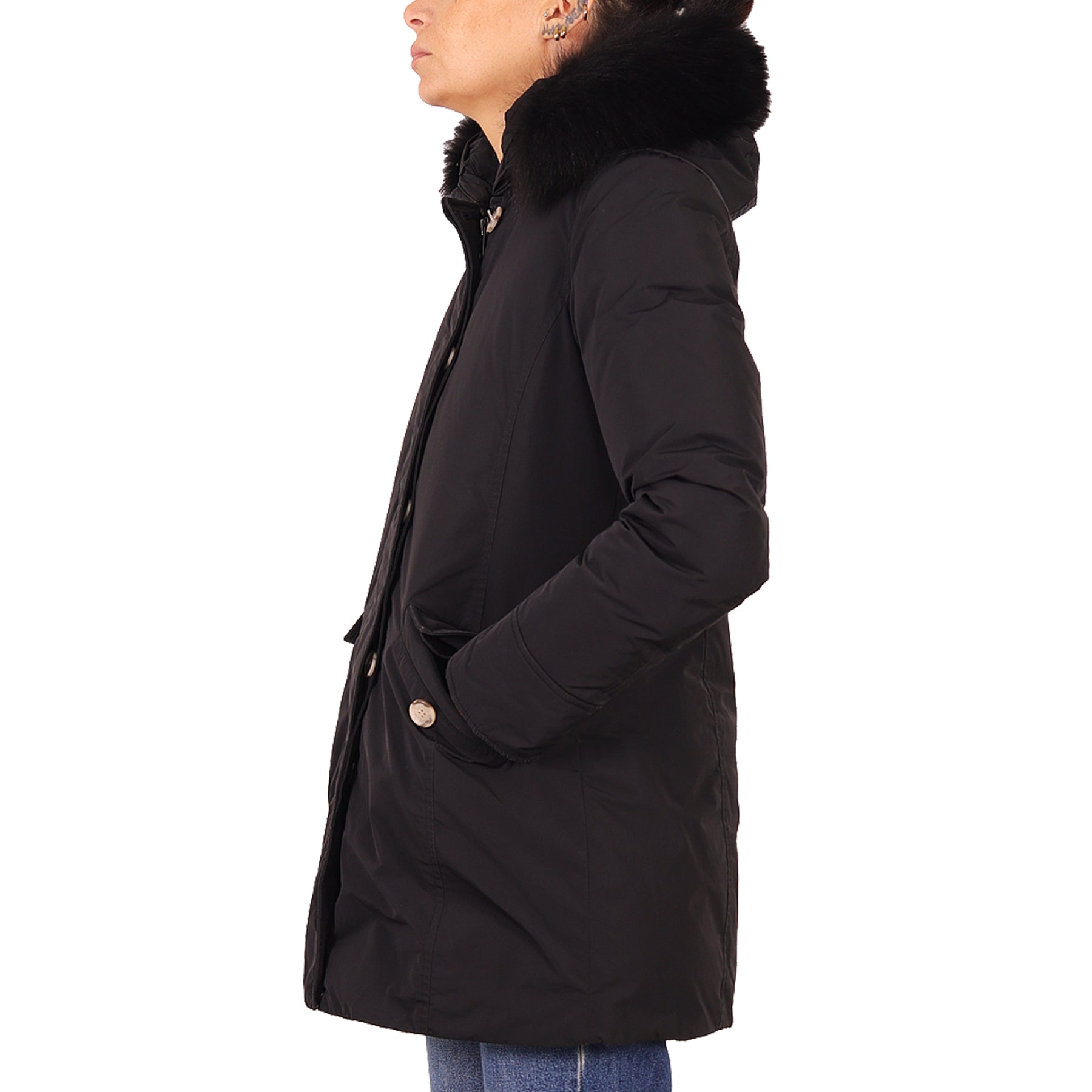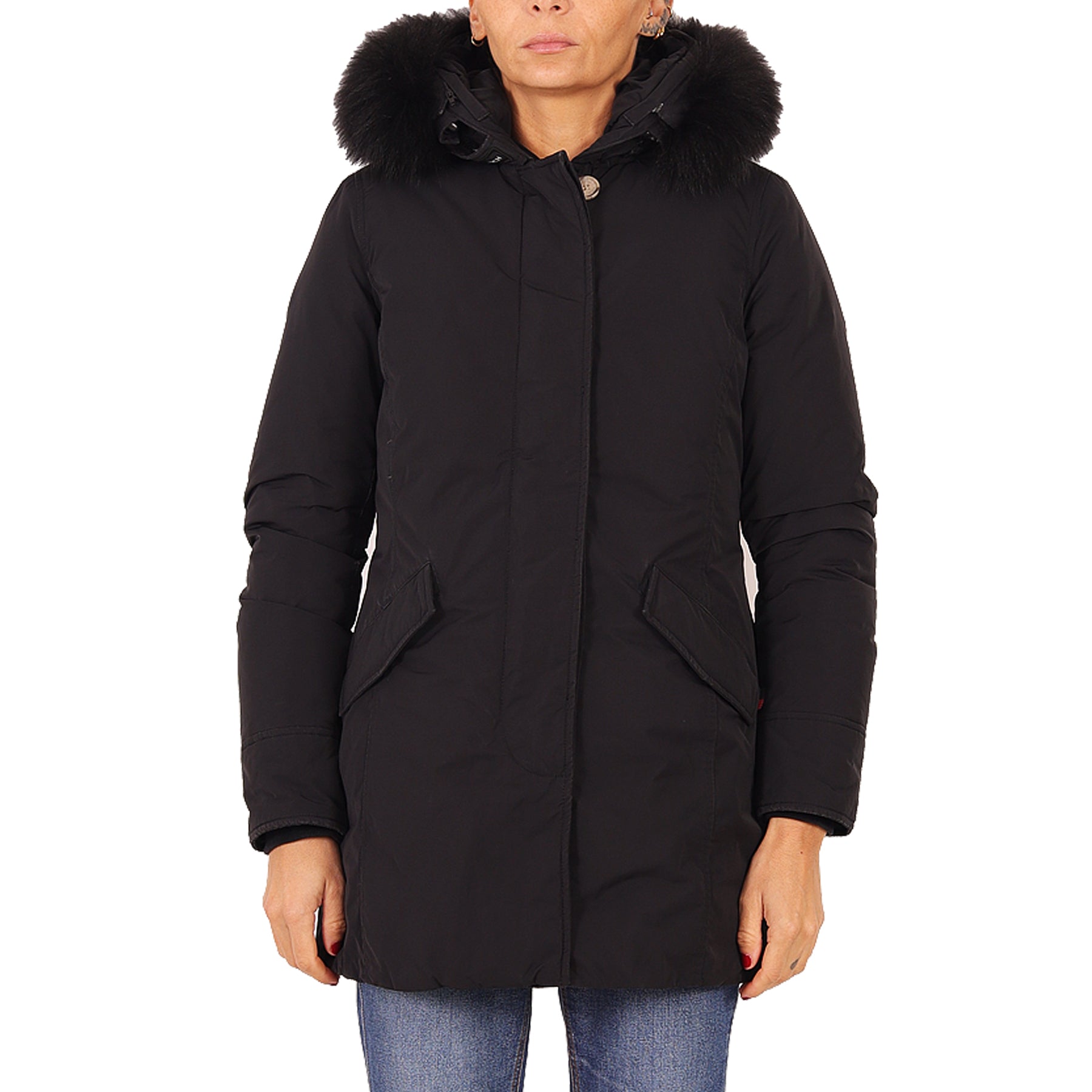 Piumino parka Woolrich, in tessuto impermeabile, colore nero, con tasche, chiusura con zip e bottoni nascosti, con cappuccio bordato in pelliccia nera rimovibile, con imbottitura in piuma, presenta micro imperfezioni