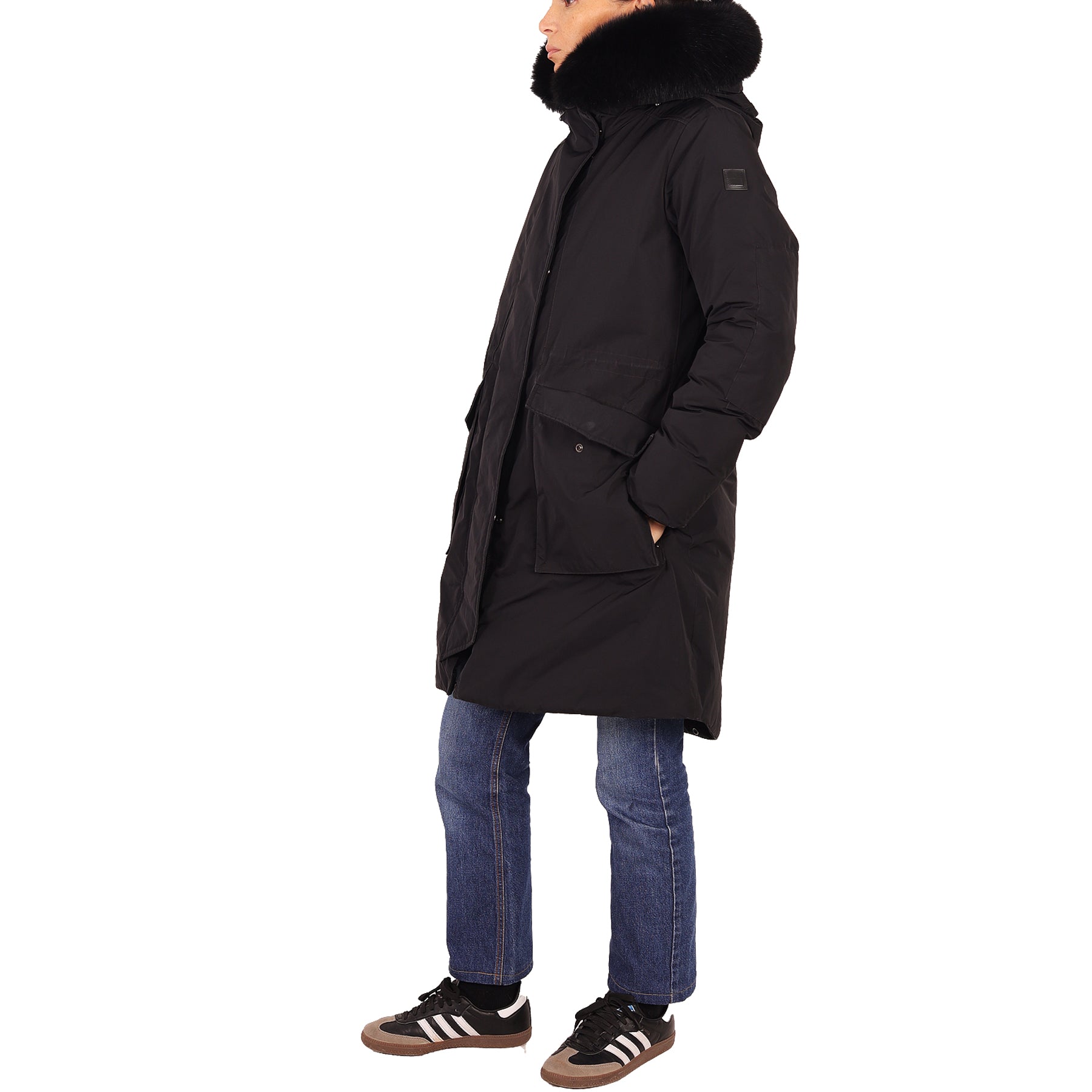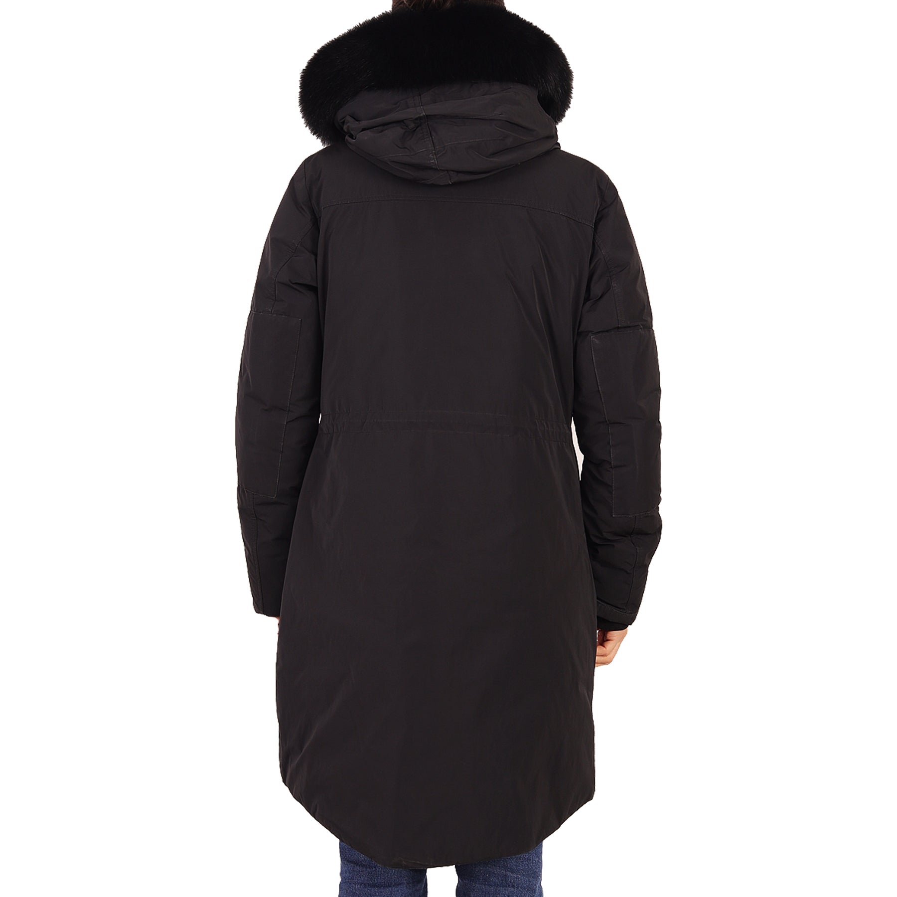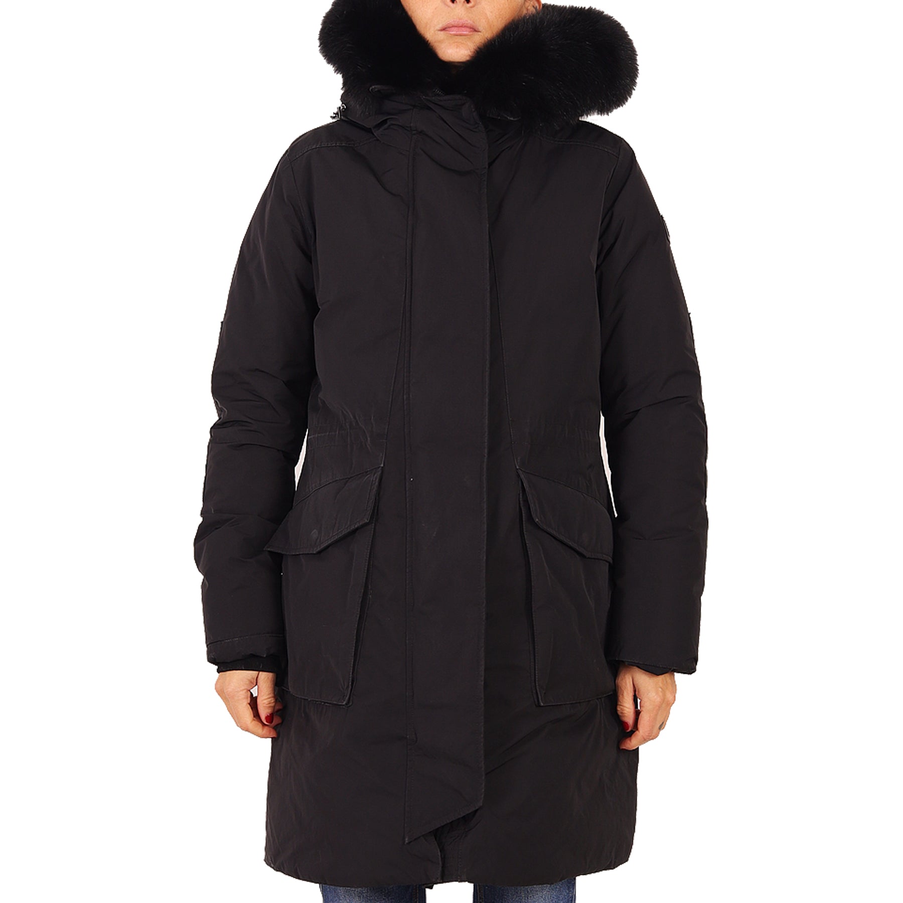 Piumino parka Woolrich, in tessuto impermeabile, colore nero, con tasche, chiusura con zip e bottoni nascosti, con cappuccio bordato in pelliccia nera rimovibile, con imbottitura in piuma, presenta micro imperfezioni