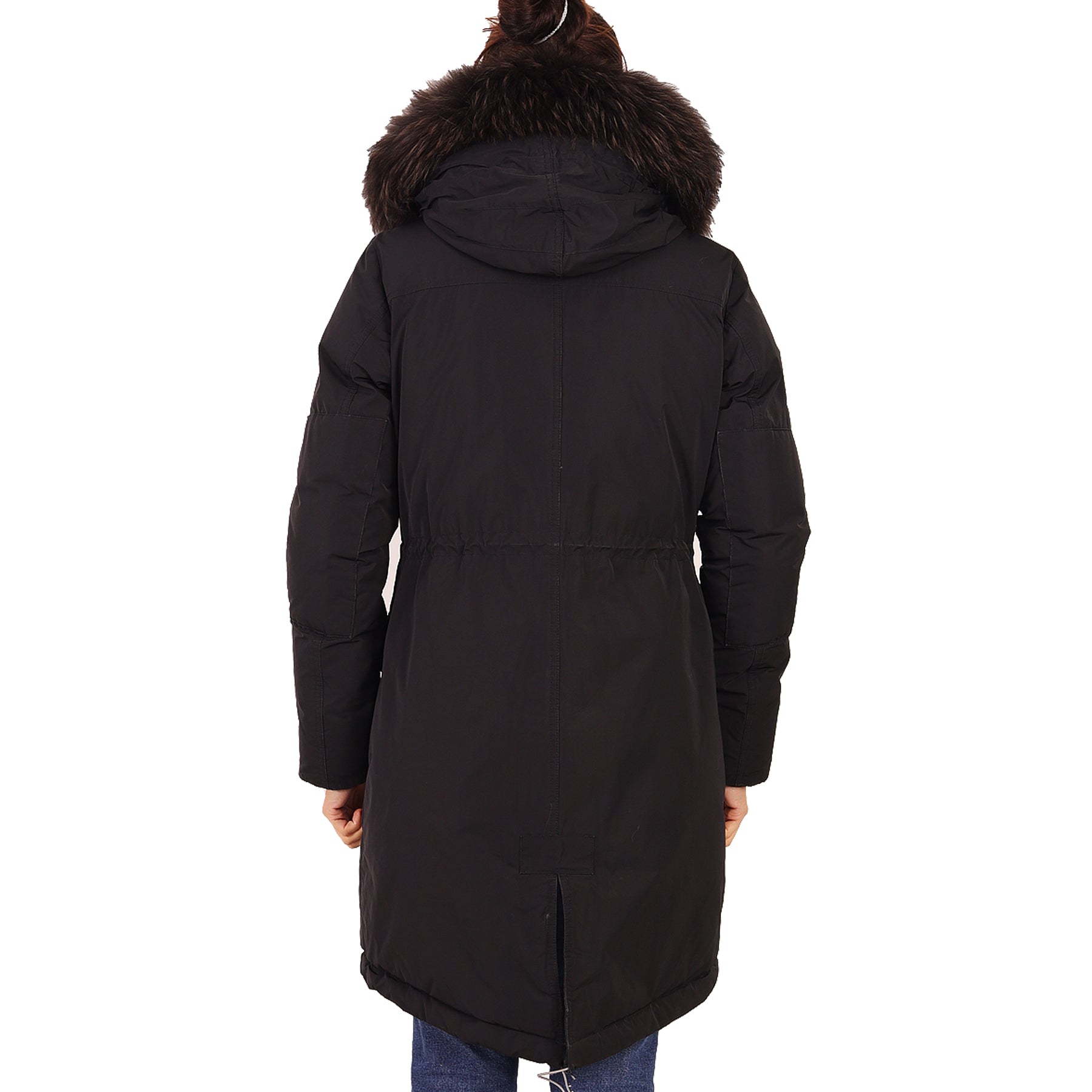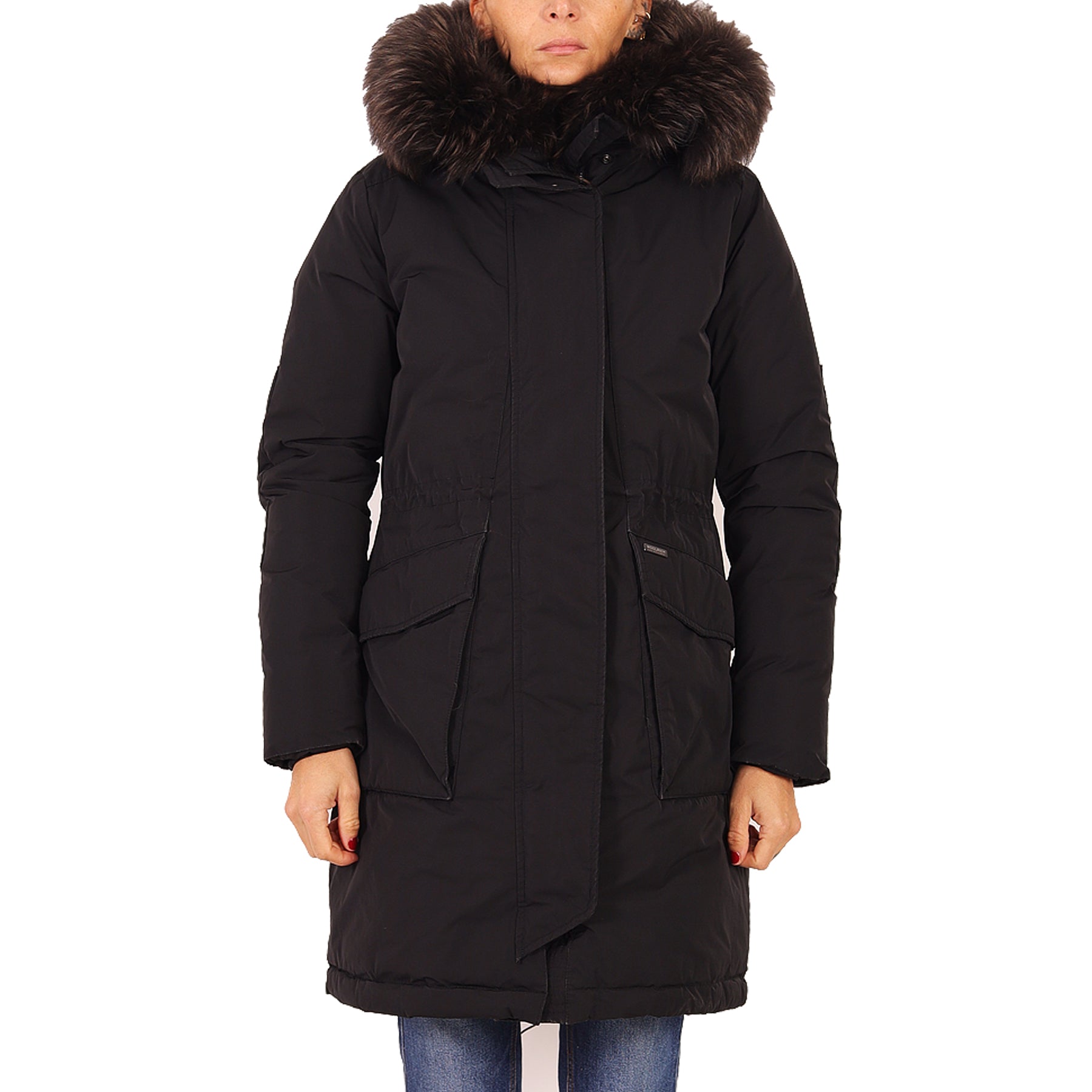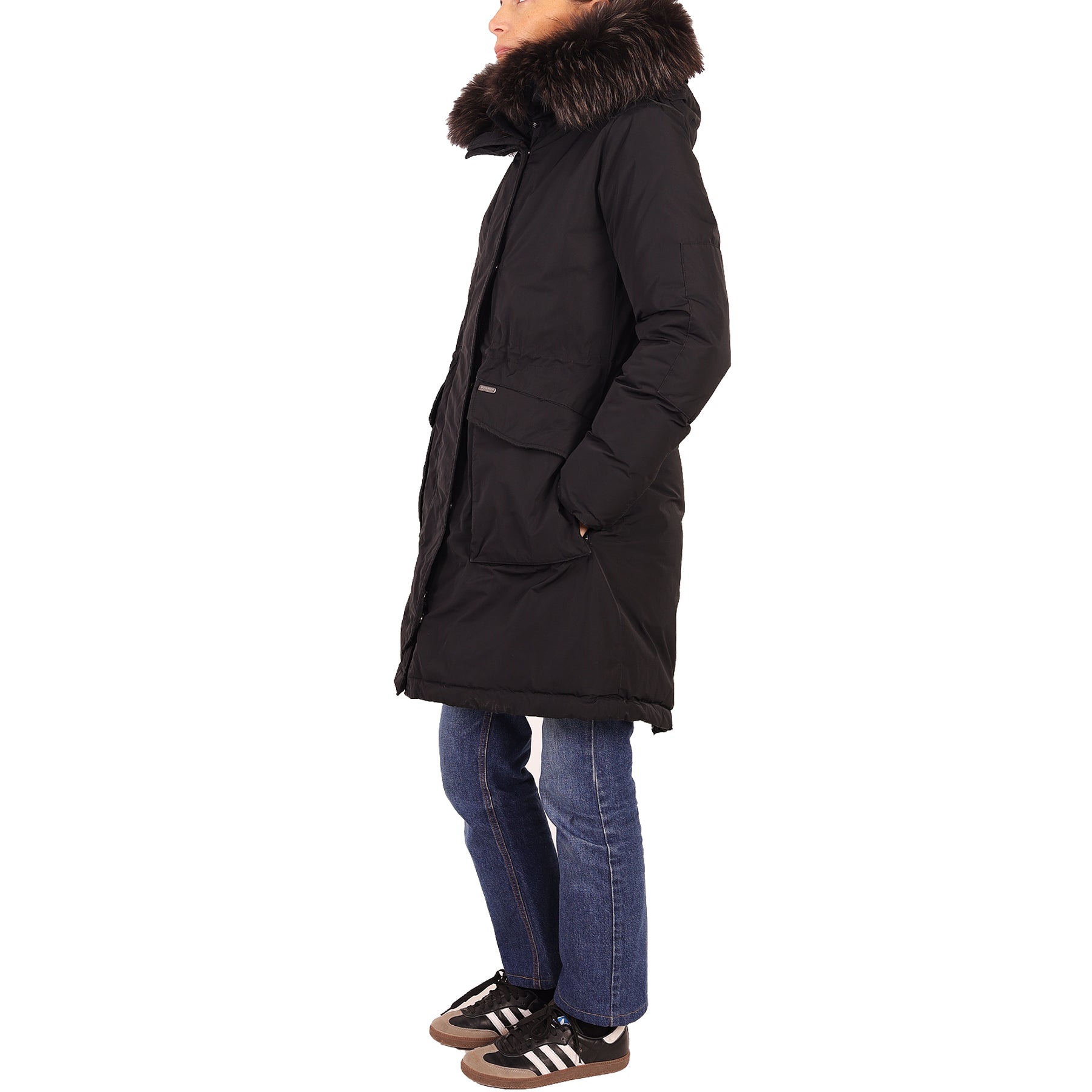 Piumino parka Woolrich, lungo, in tessuto, colore nero, con coulisse in vita, chiusura con zip e bottoni, con cappuccio, bordato in pelliccia, con tasche, imbottitura in piuma, presenta micro imperfezioni