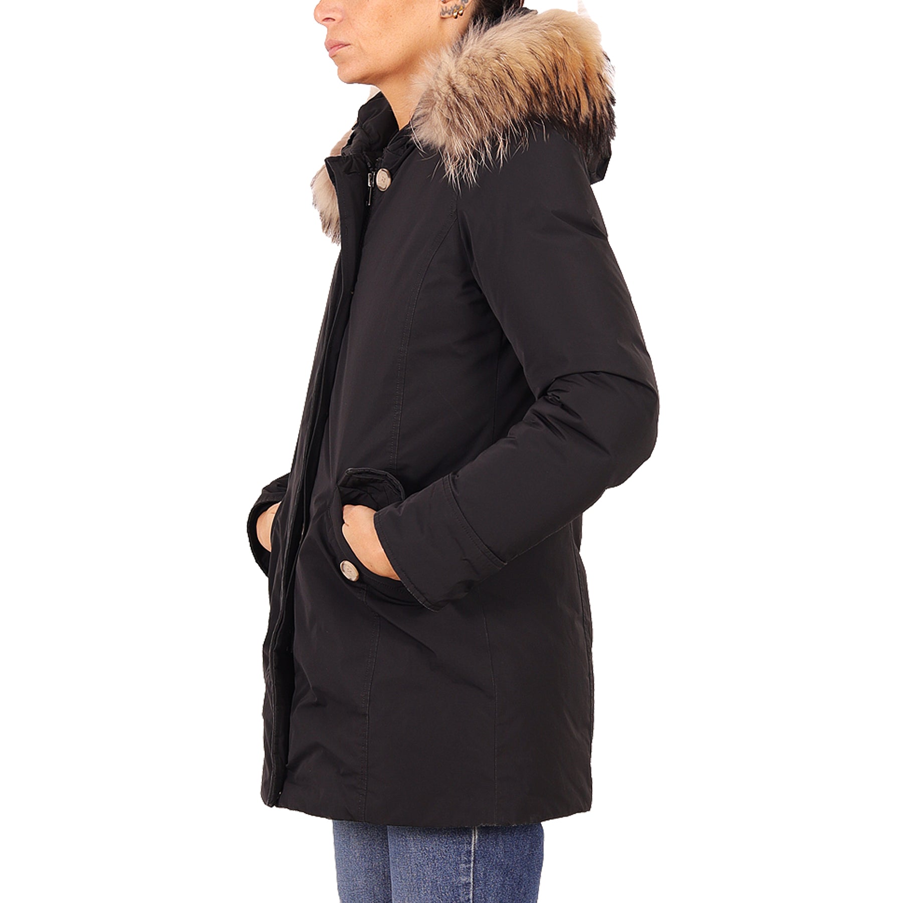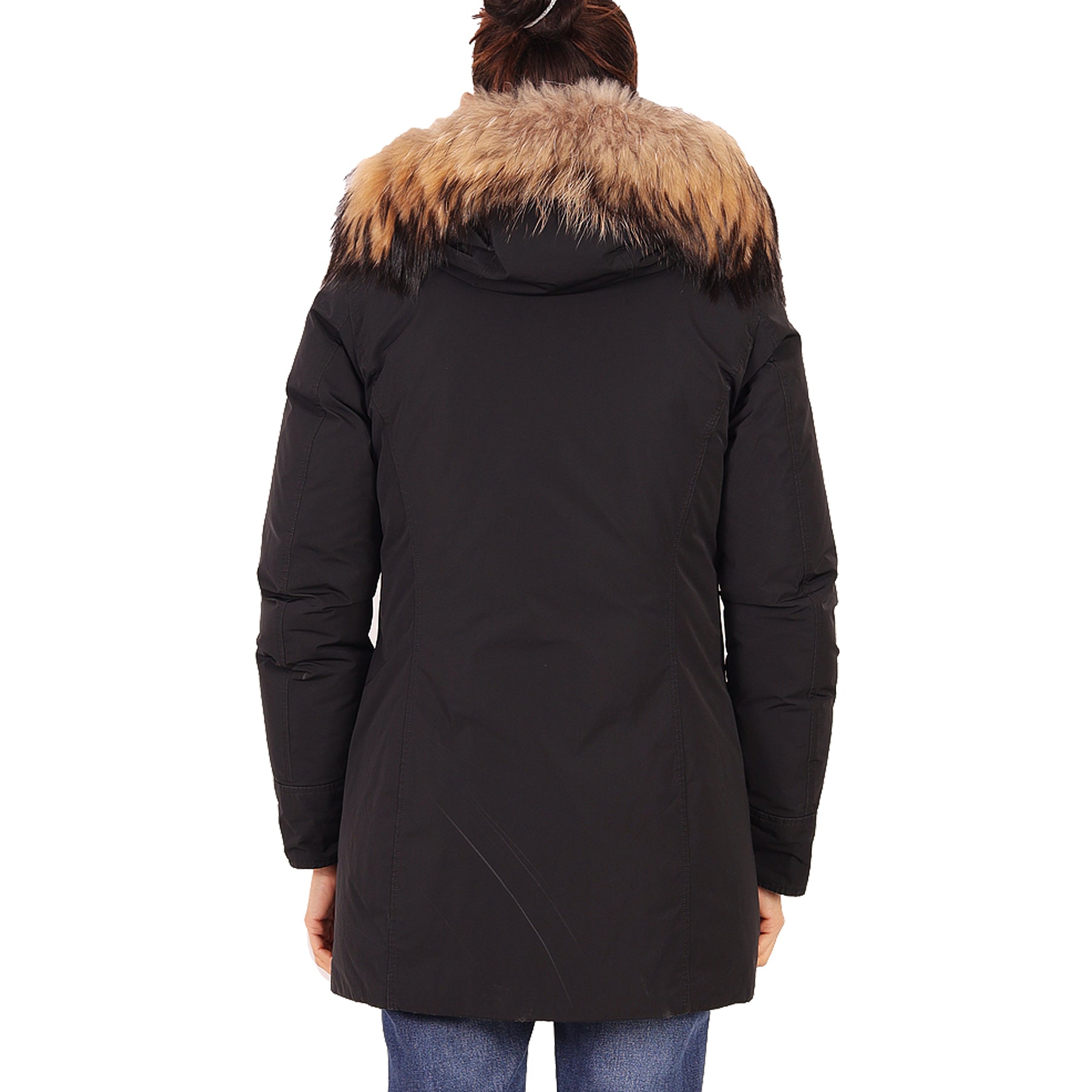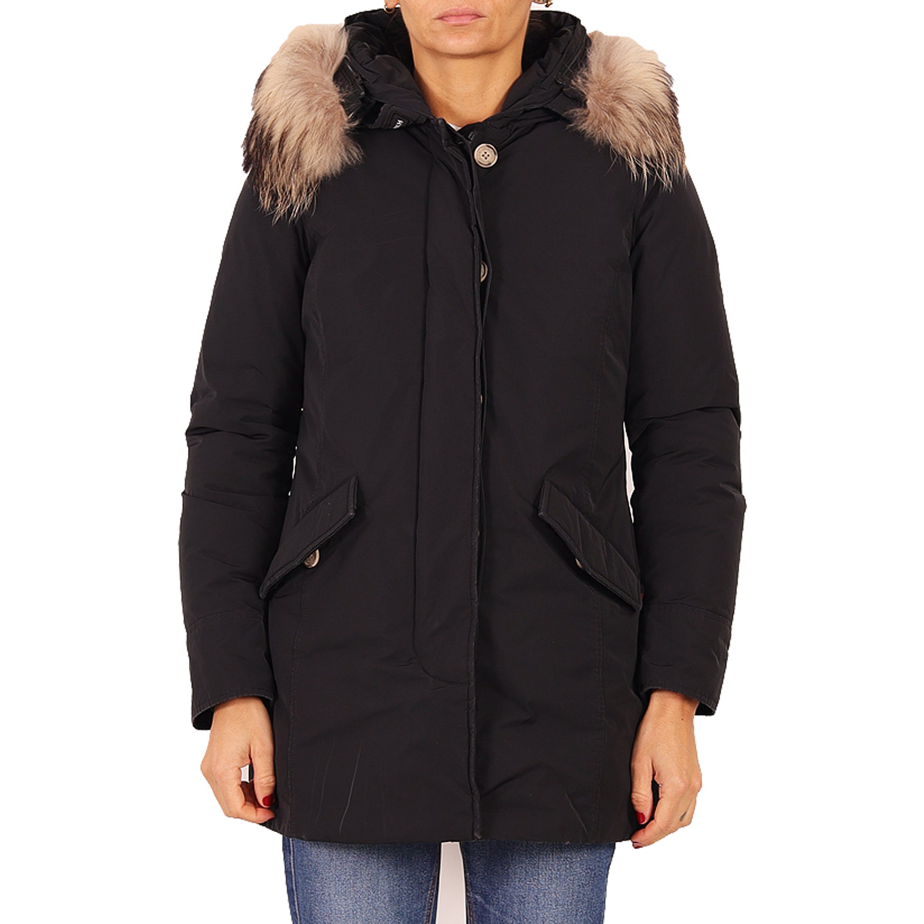 Piumino Woolrich, in tessuto, colore nero, sfiancato, chiusura con zip e bottoni, con cappuccio bordato in pelliccia, con tasche, imbottitura in piuma, presenta micro imperfezioni