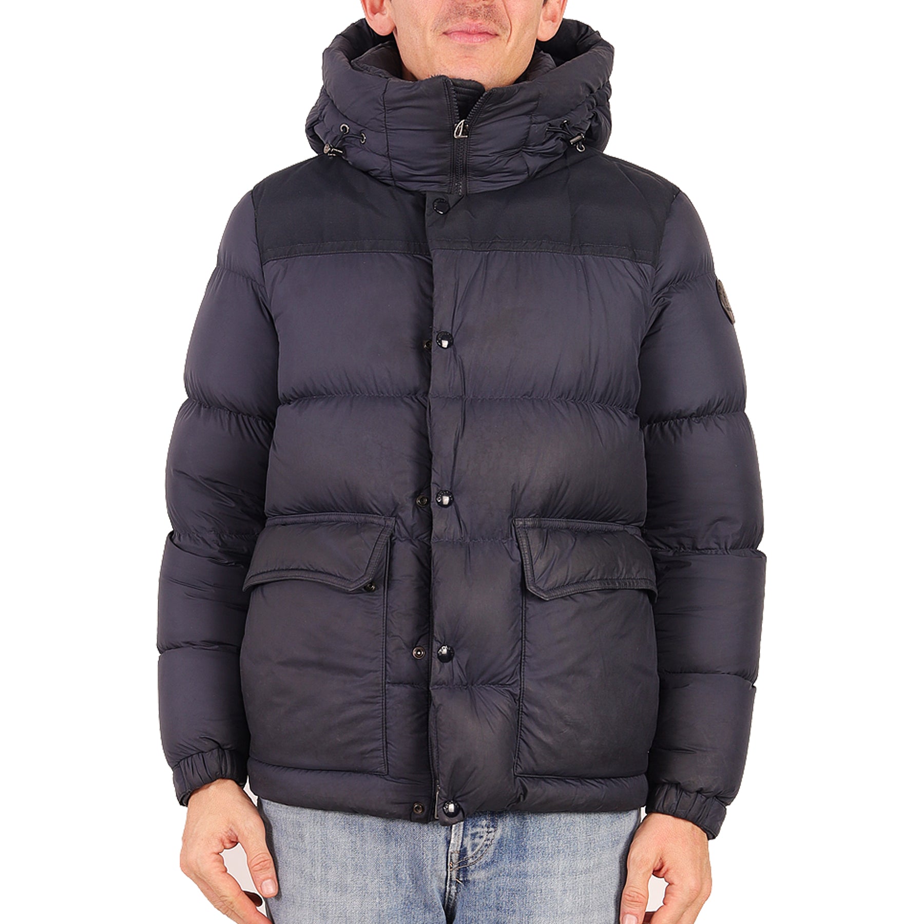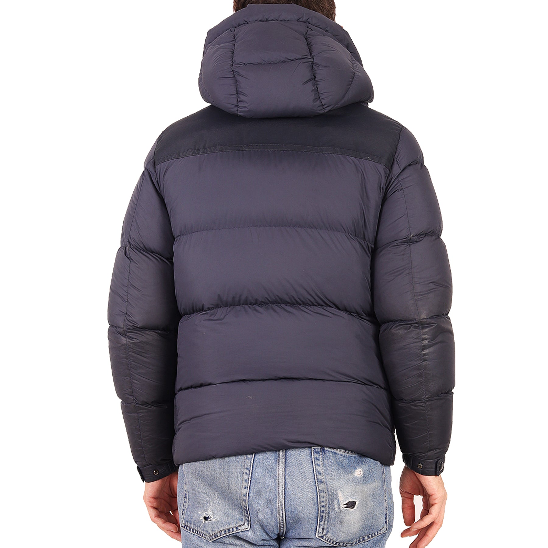 Piumino Woolrich, colore blu, con tasche, chiusura con zip e bottoni, con cappuccio, imbottitura interna in piuma d'oca, presenta micro imperfezioni