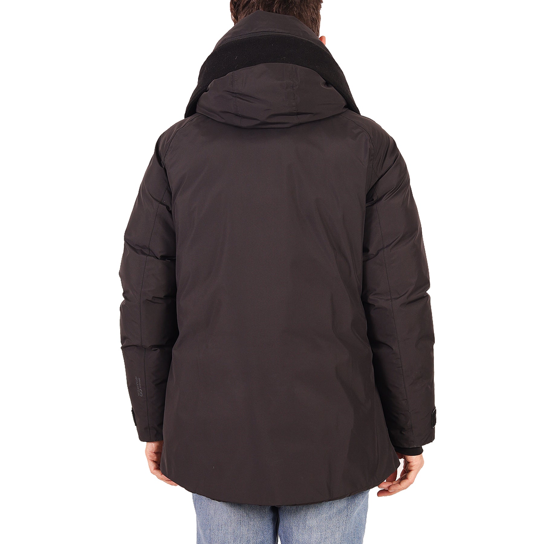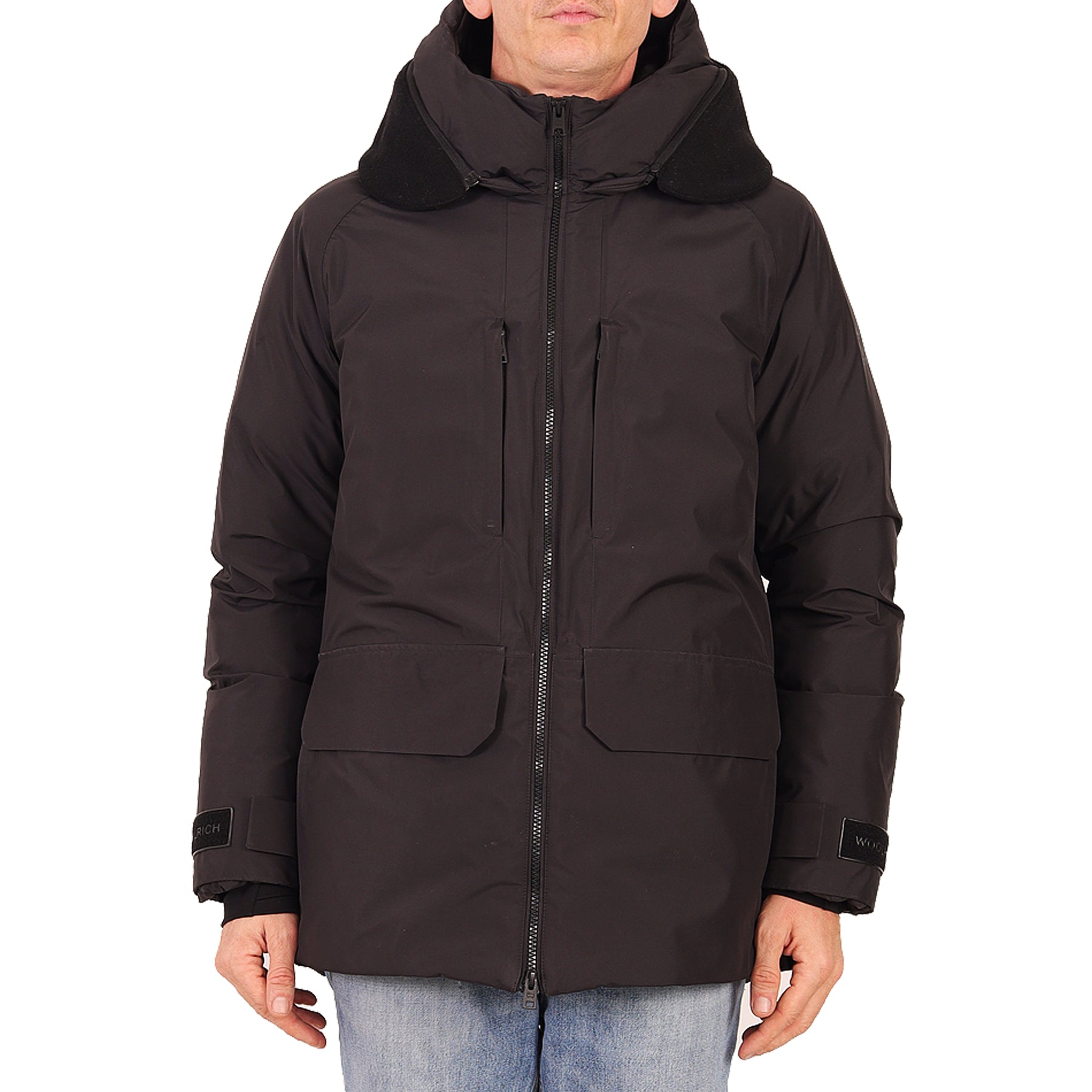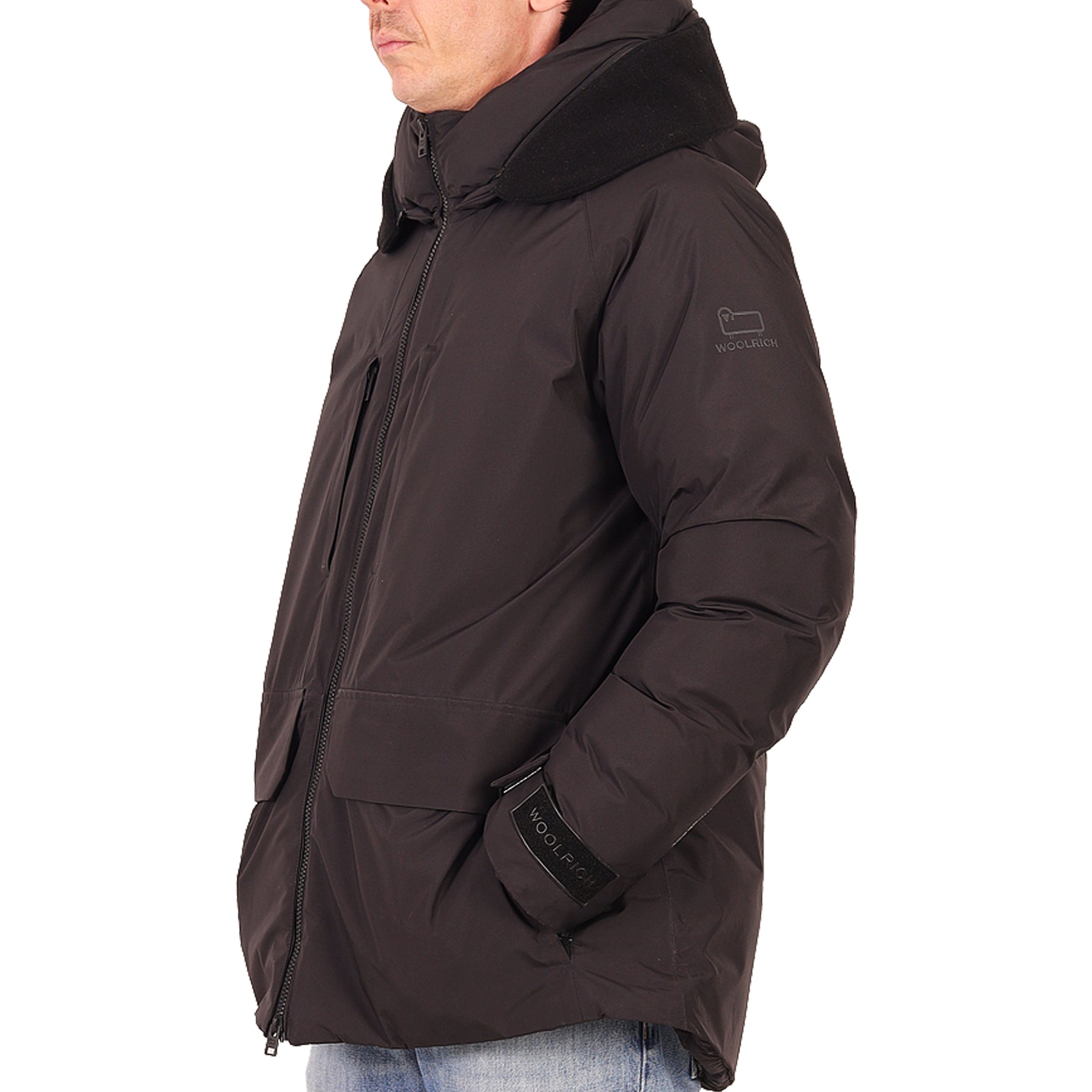 Piumino Woolrich, colore nero, con tasche, chiusura con zip, con cappuccio, imbottitura interna in piuma d'oca, presenta micro imperfezioni