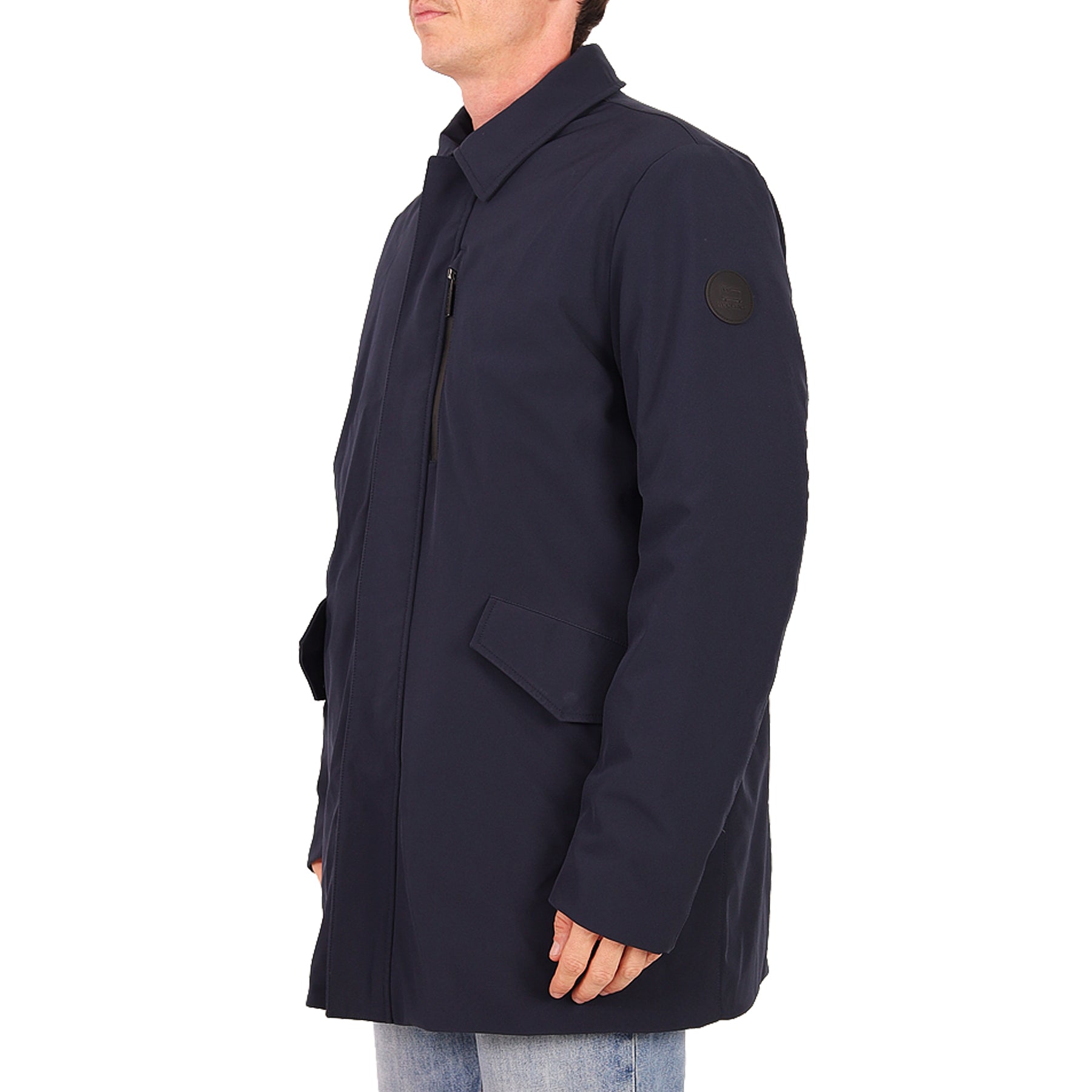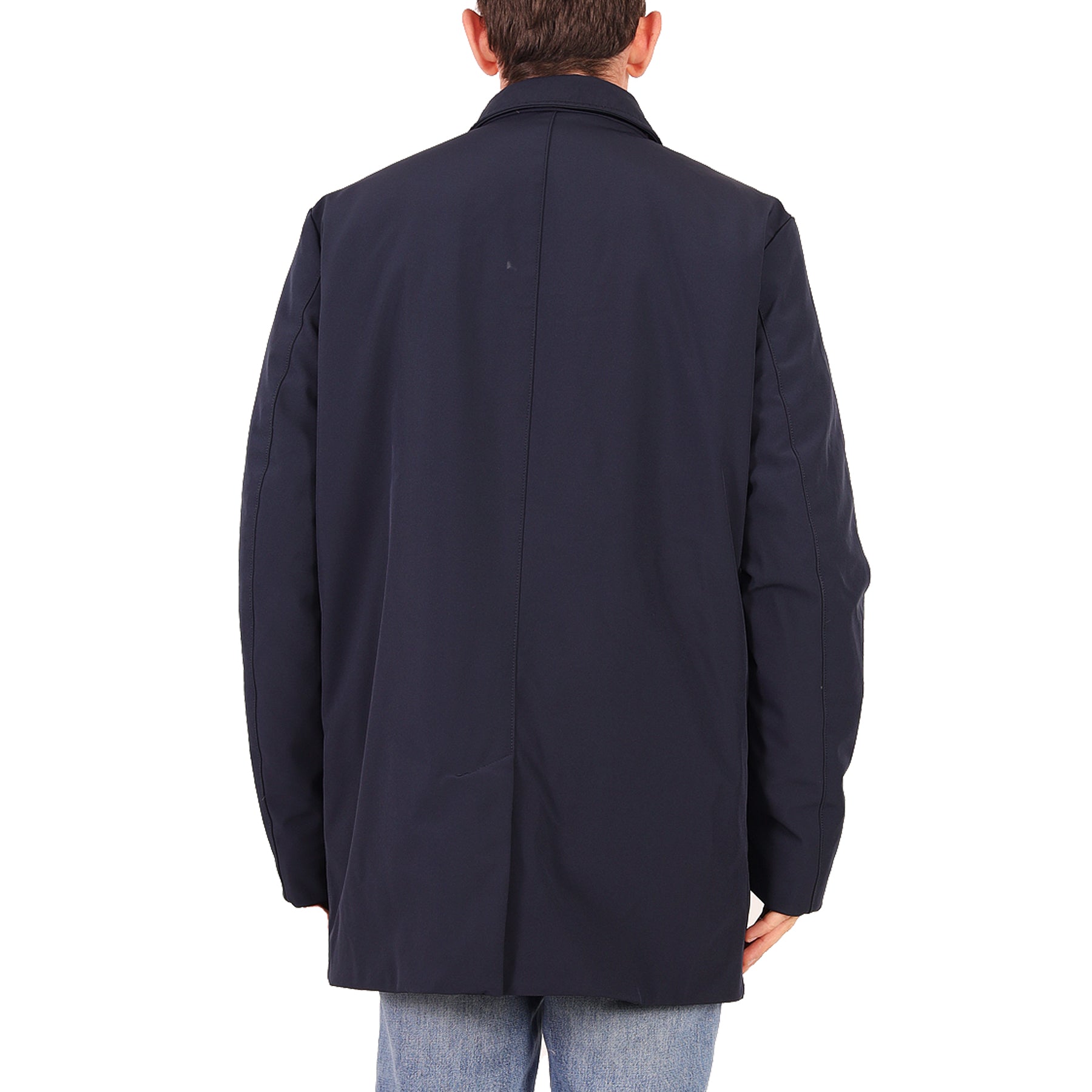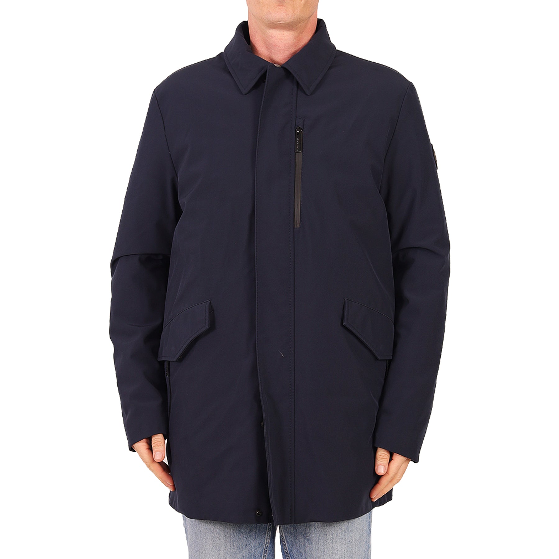 Piumino Woolrich, colore blu, con imbottitura in piuma, chiusura con zip e bottoni, con doppie tasche, presenta micro imperfezioni