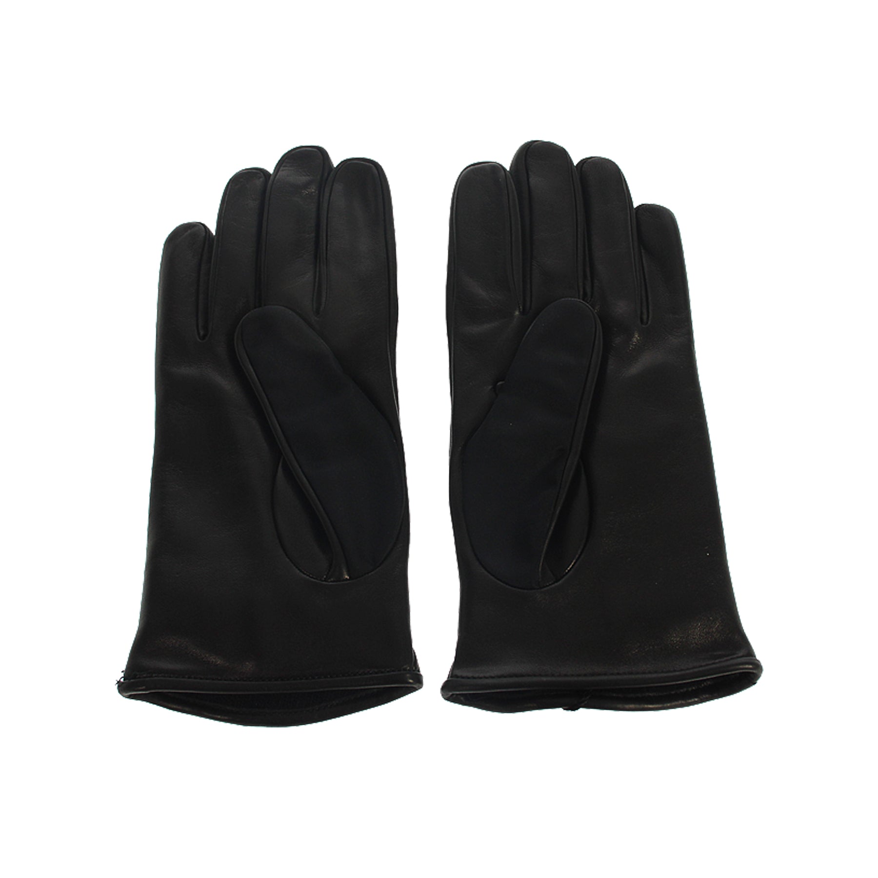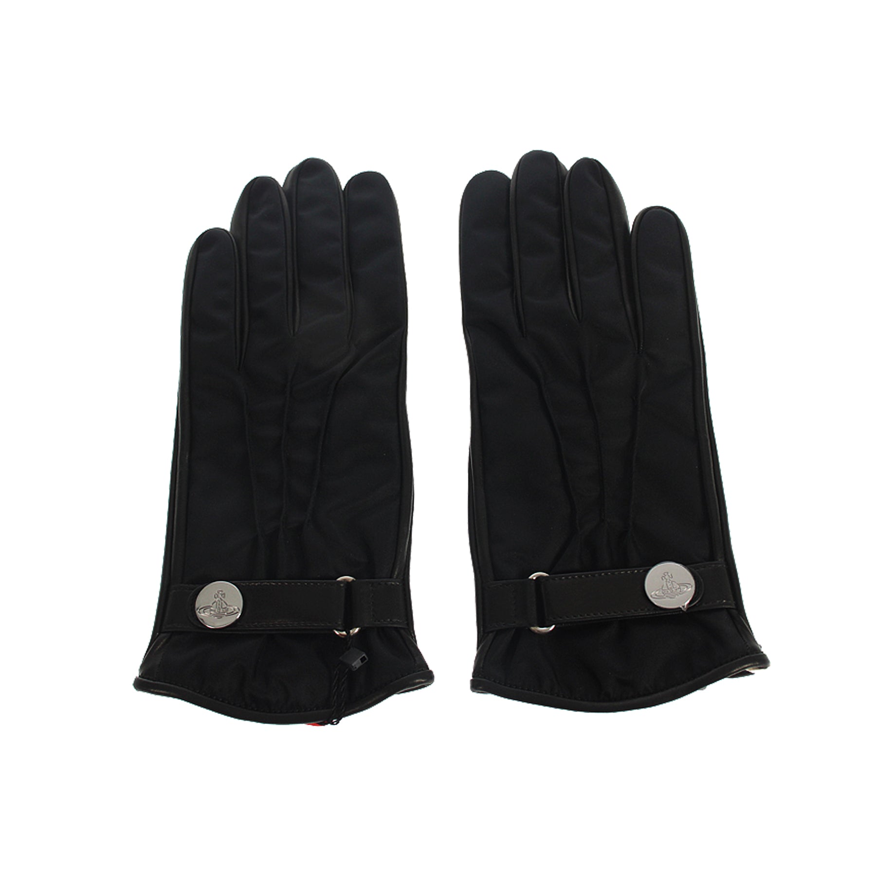 Guanti Vivienne Westwood, in pelle e tessuto, colore nero, interno in lana, chiusura con bottone a pressione sul dorso, retail € 405,00