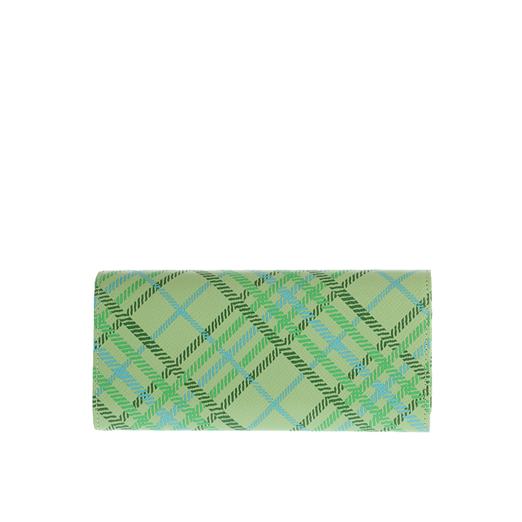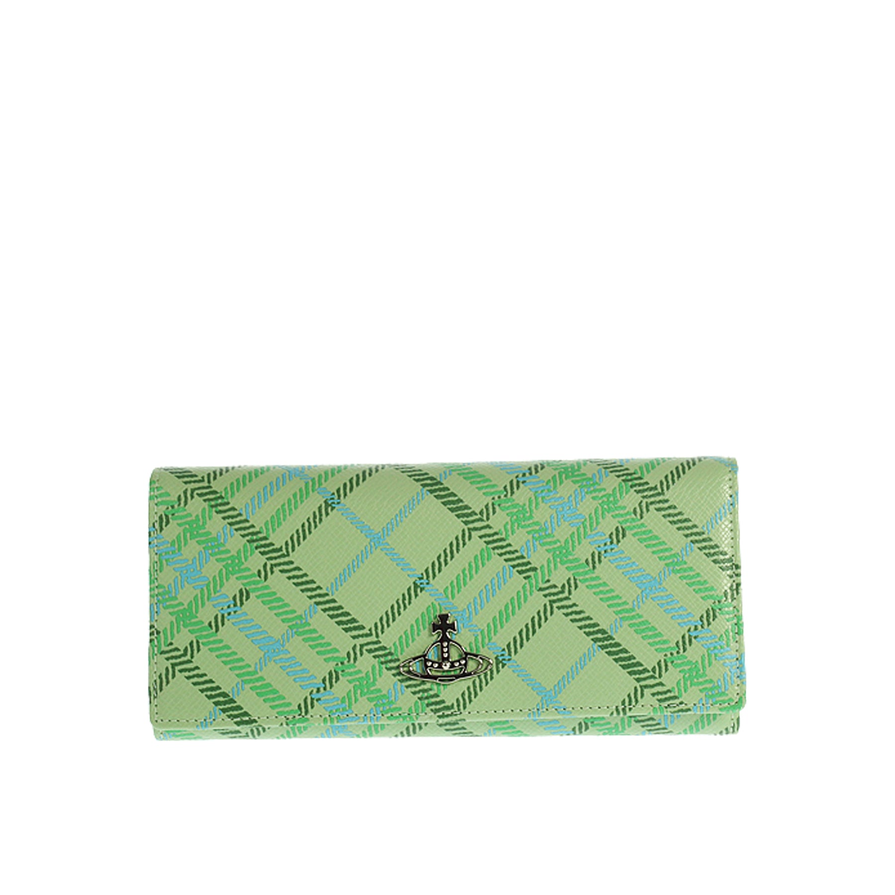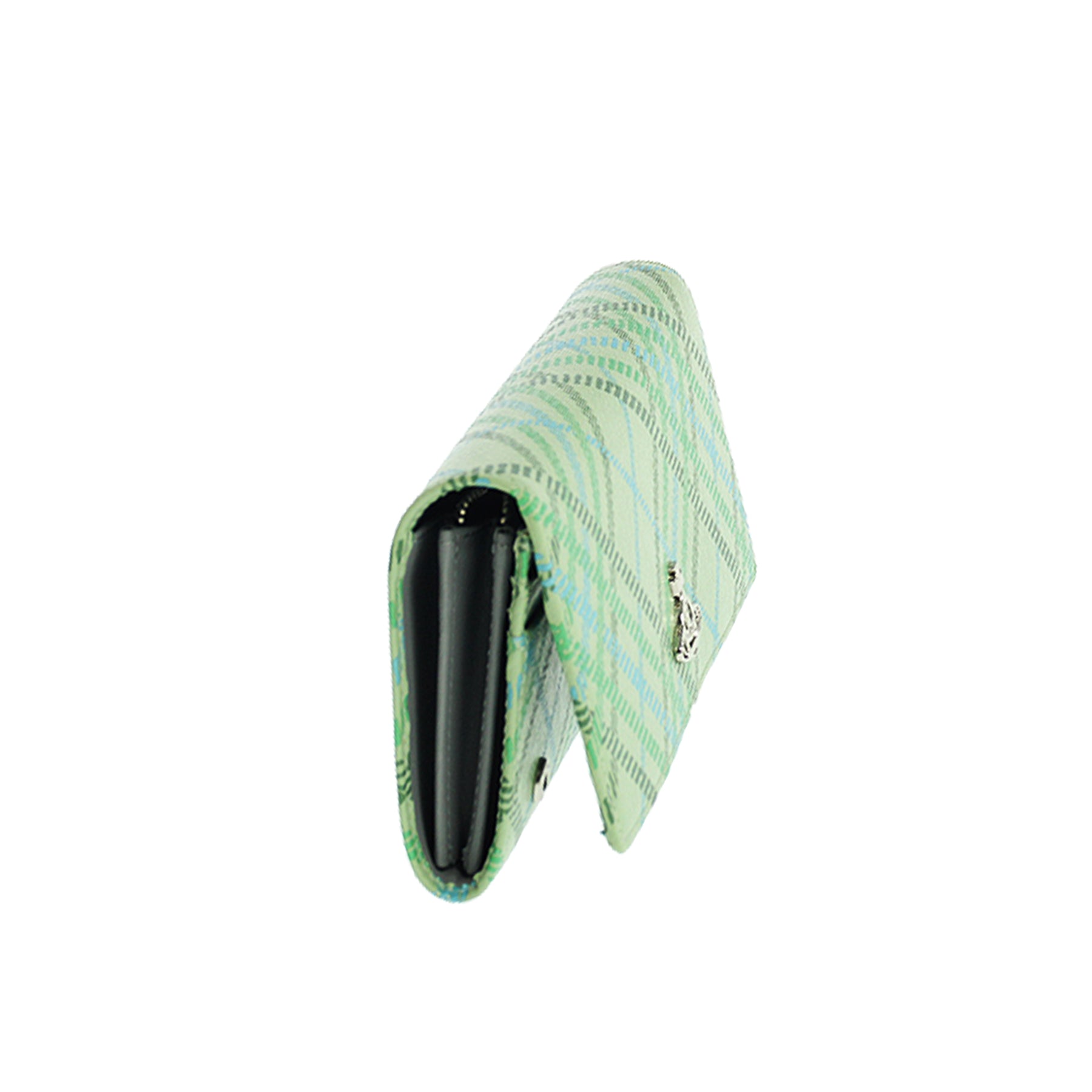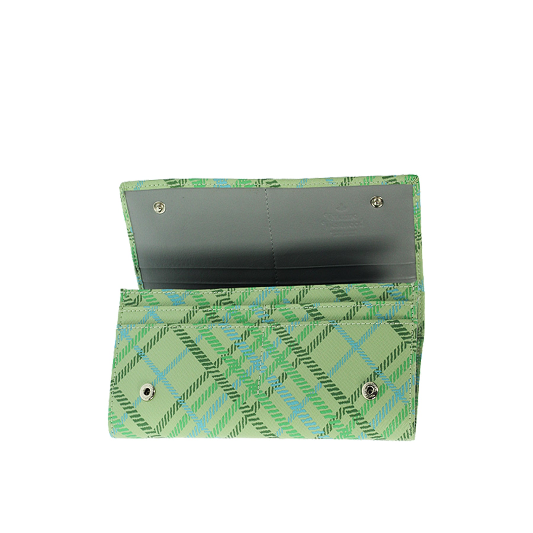 Portafoglio Vivienne Westwood, in pelle butterata, colore verde con righe, chusura con doppio bottone a pressione, tasca interna con cernier, scomparti interni, taschini portacarte, lunghezza cm 19, retail € 185,00