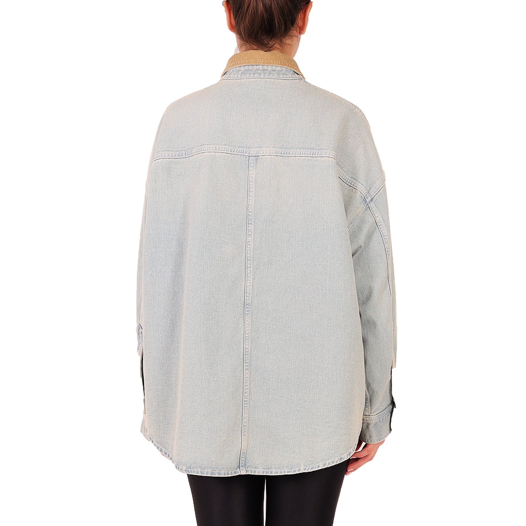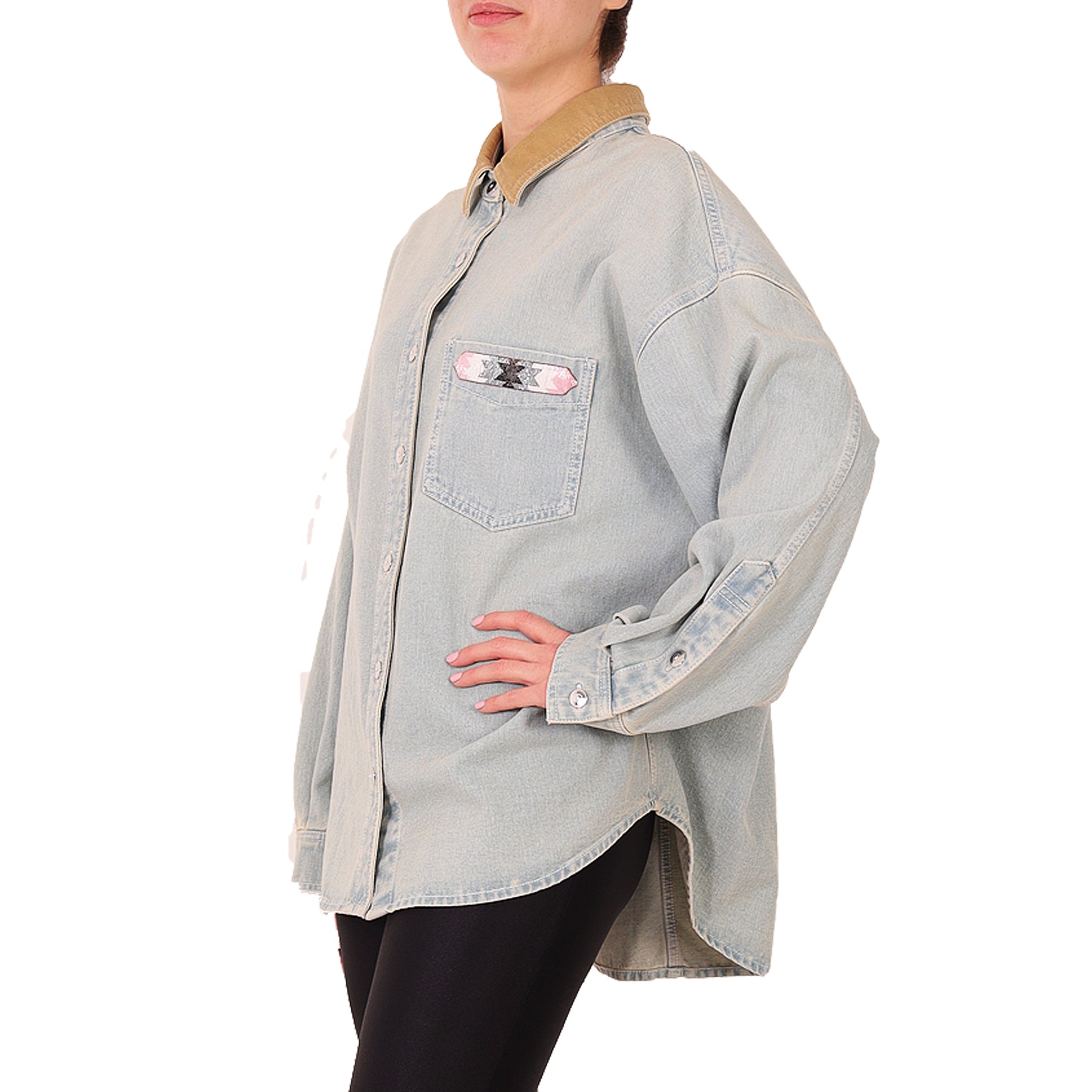 Bazar Deluxe shirt, in denim, light blue, with silver buttons, contrasting velvet collar, chest pocket with bead embroidery, long sleeves, cotton, made in Italy, contact specialized laundries