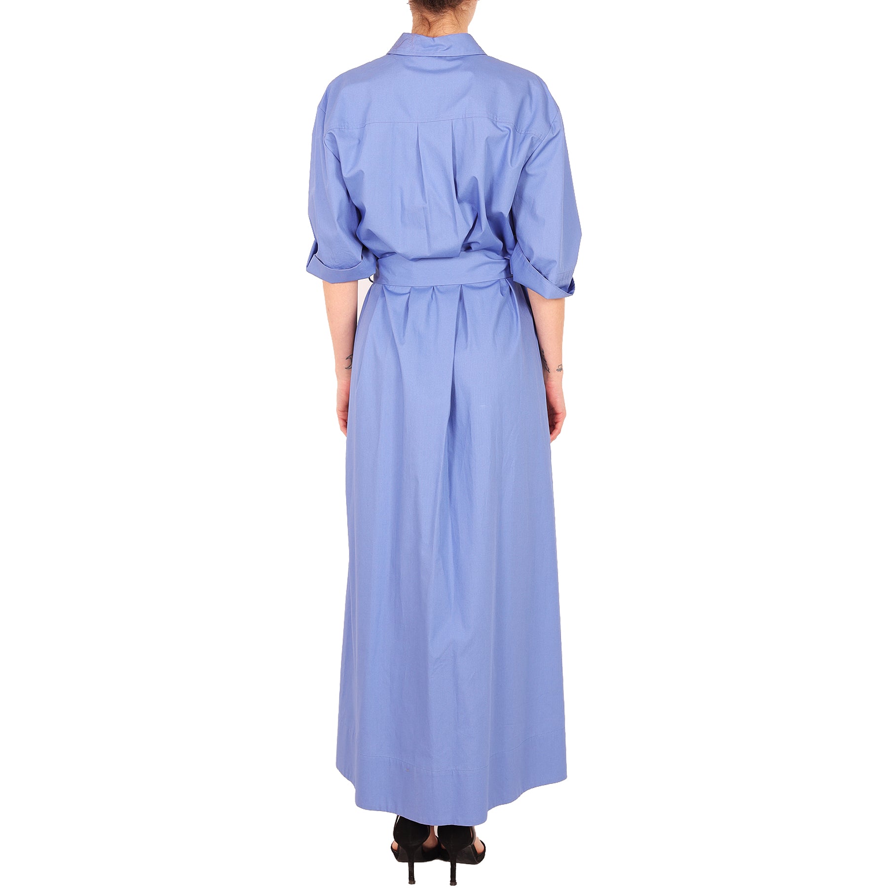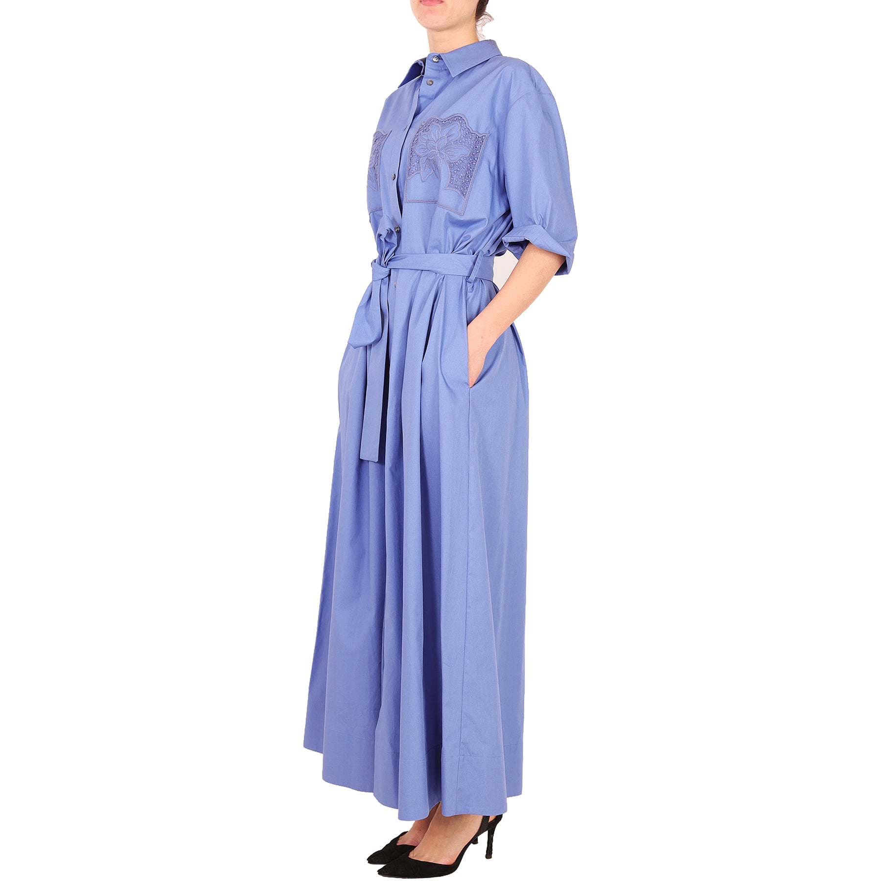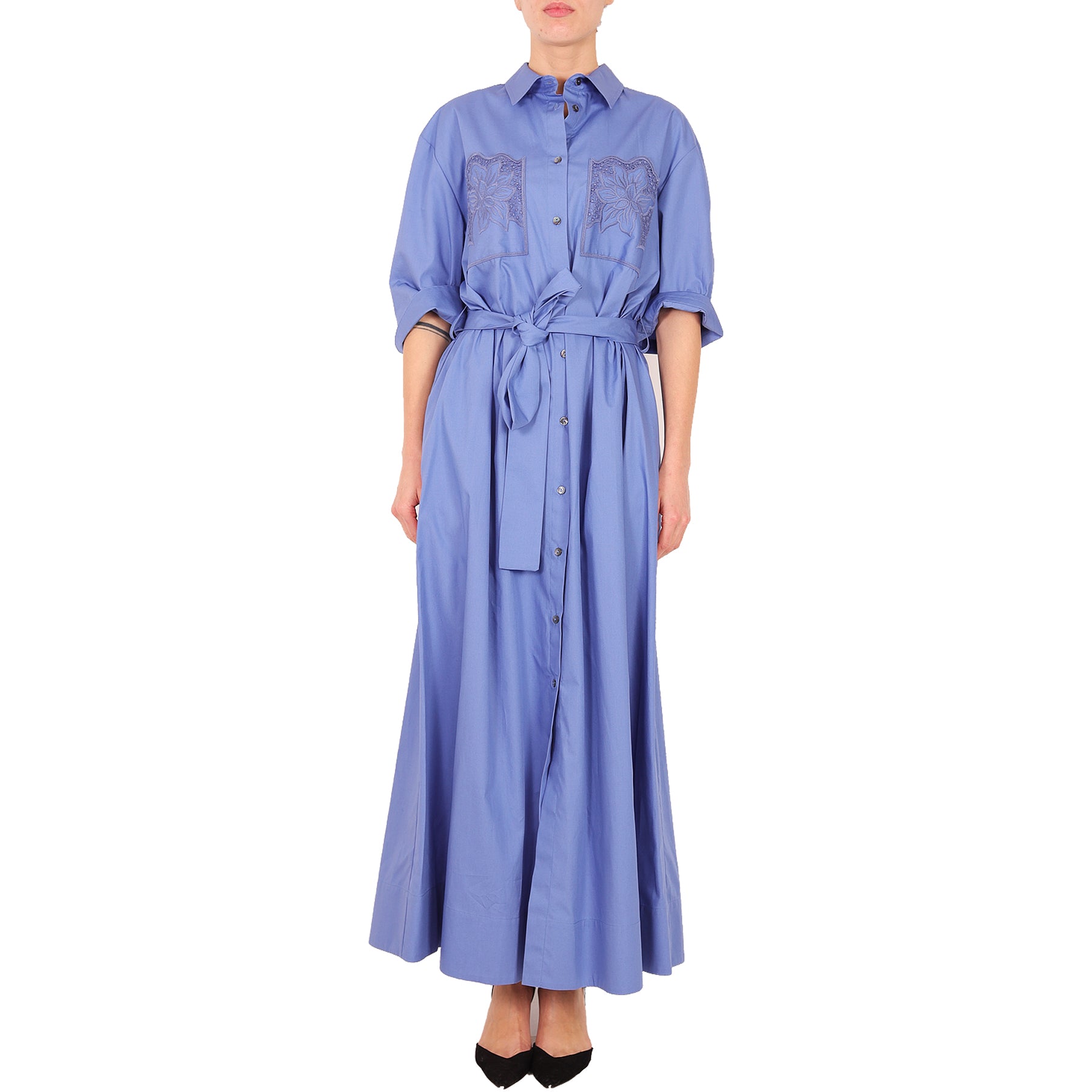 Parosh long dress, blue, short sleeves, with buttons, lace inserts, belt at the waist, with pockets