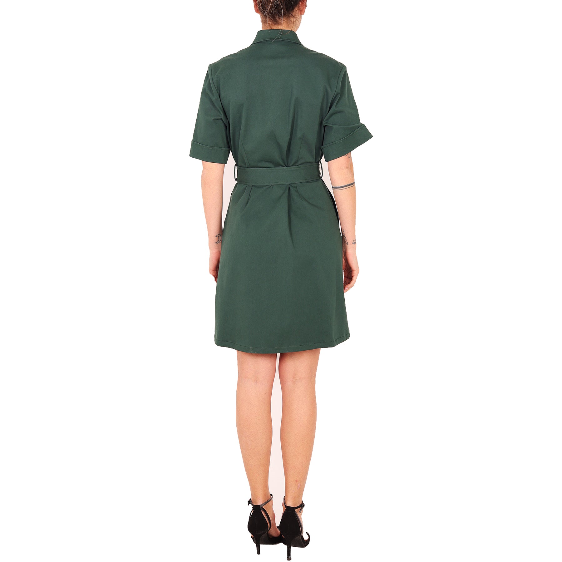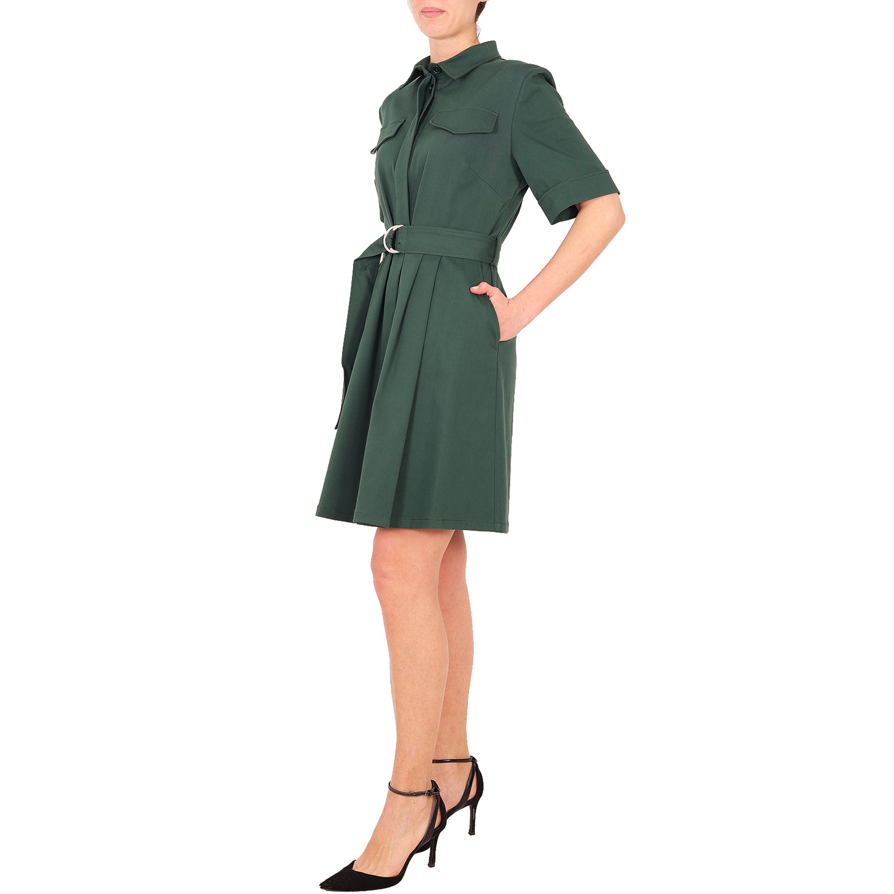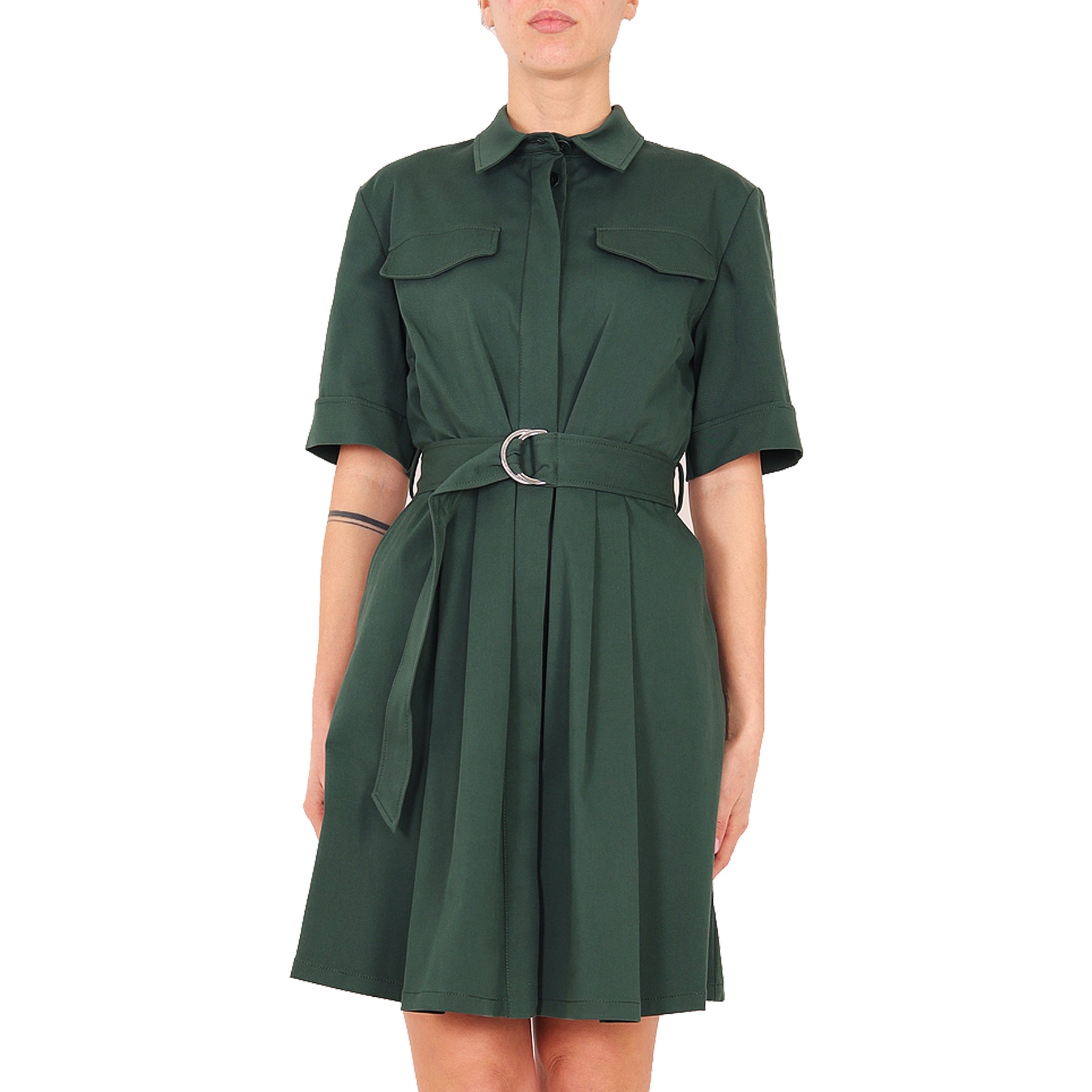 Parosh dress, dark green, short sleeves, with hidden buttons, belted waist, with pockets, in cotton
