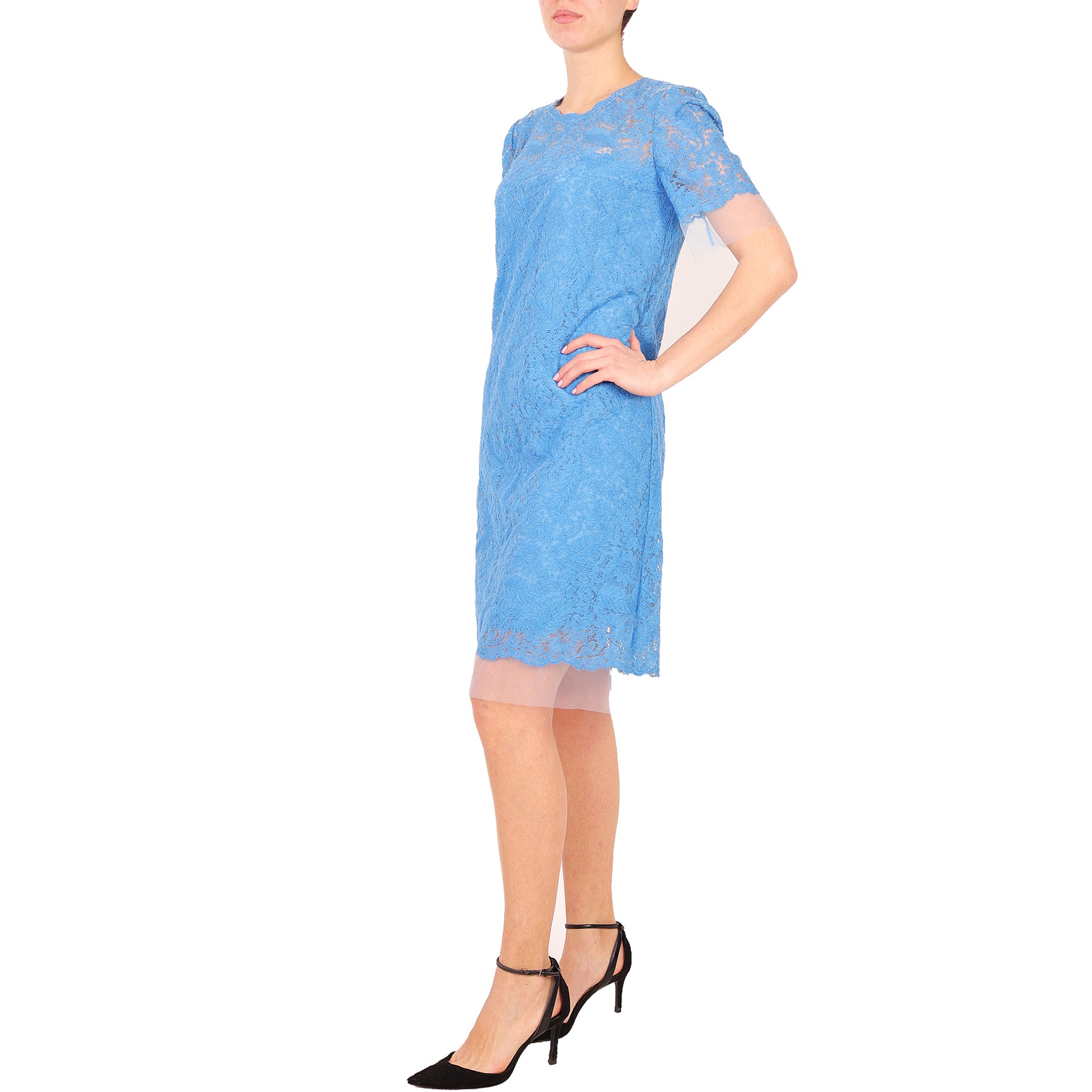 Ermanno Scervino dress, in lace, blue, short sleeves, zip on the back, internal lining