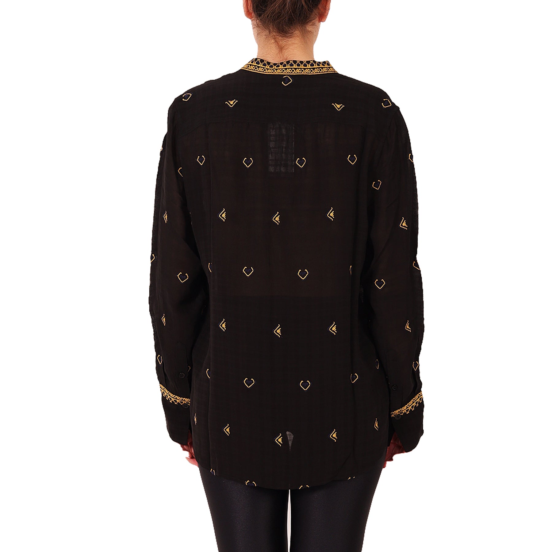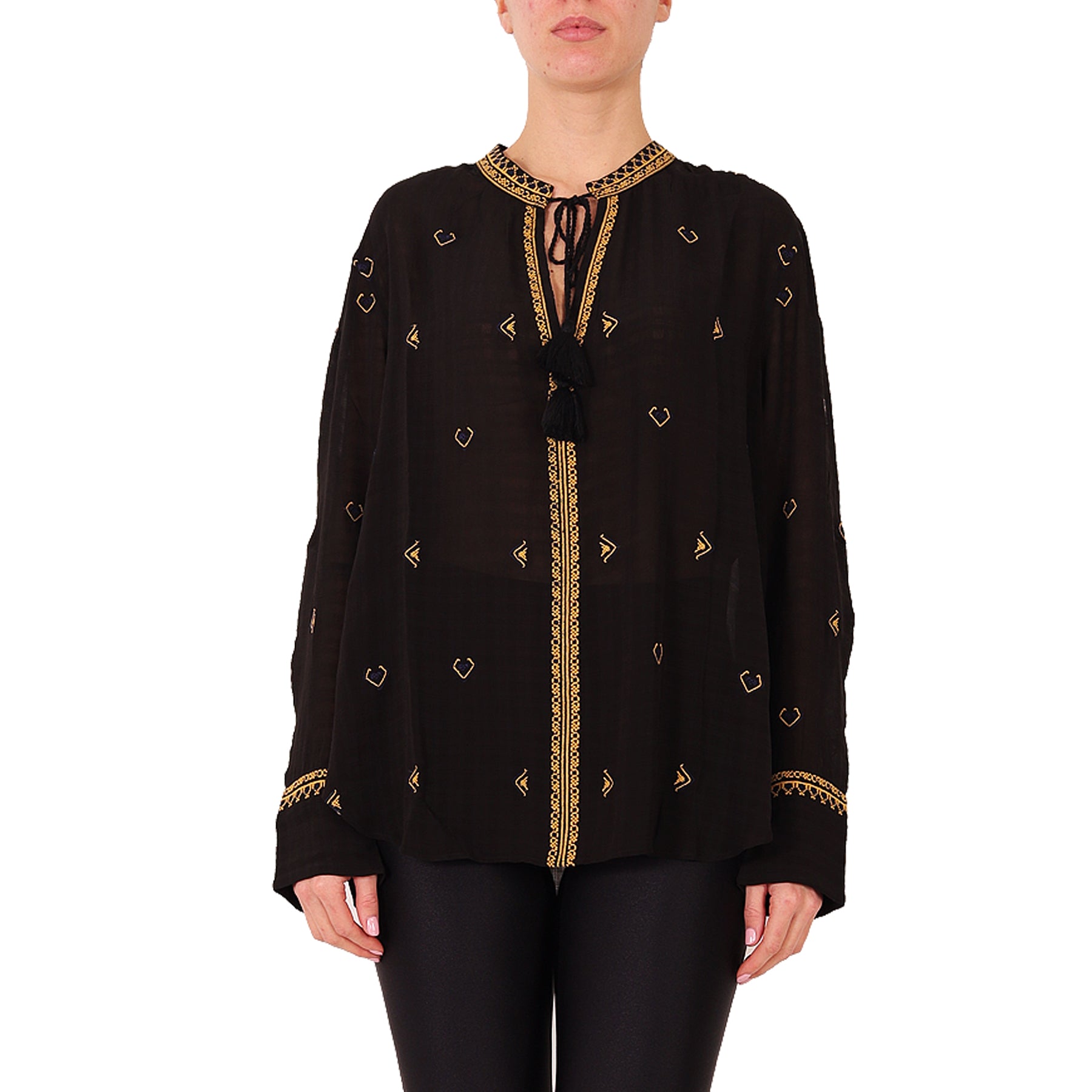 Vanessa Bruno blouse, black, with gold embroidery, V-neck, tie at the neck, long sleeves, side slits, viscose, made in India, hand wash