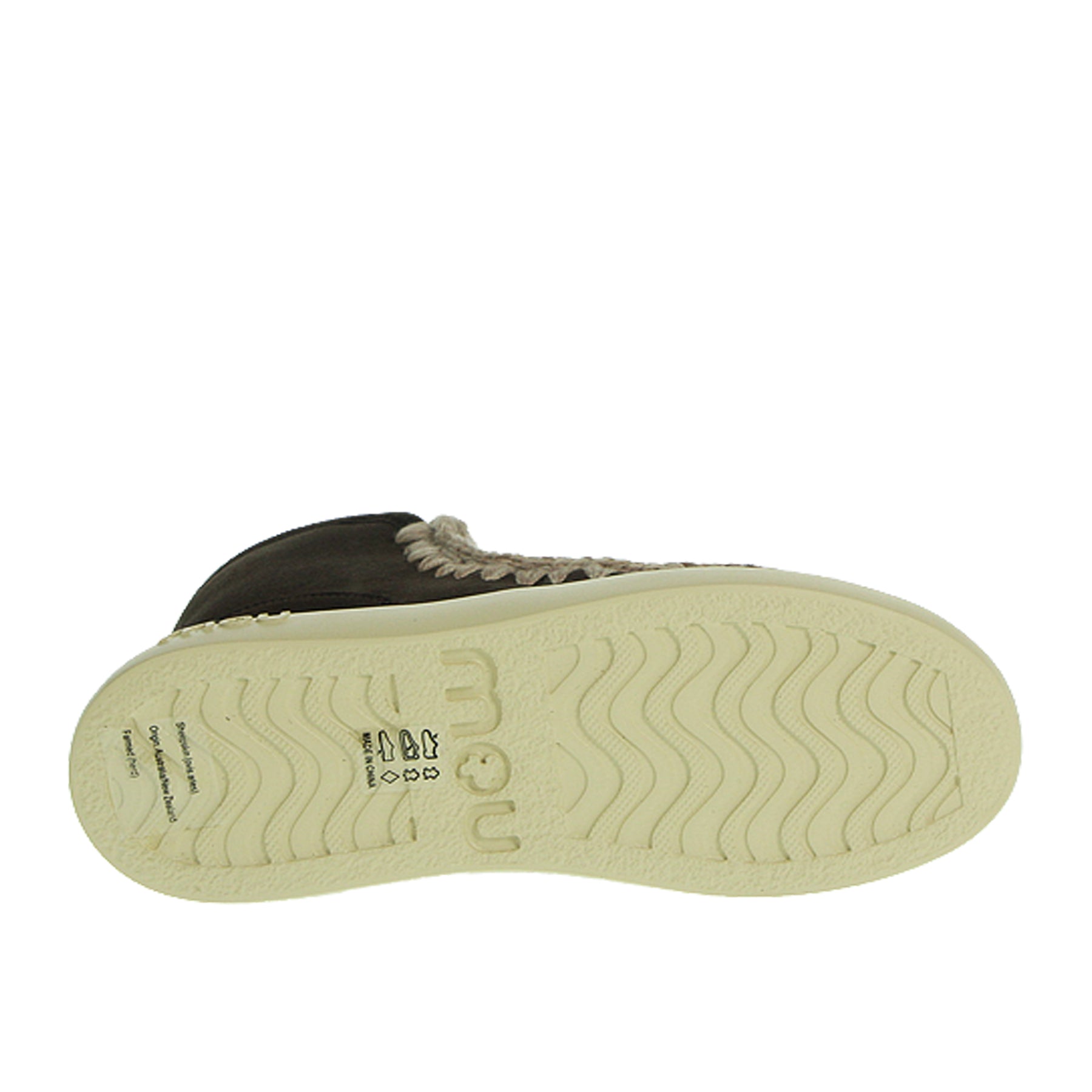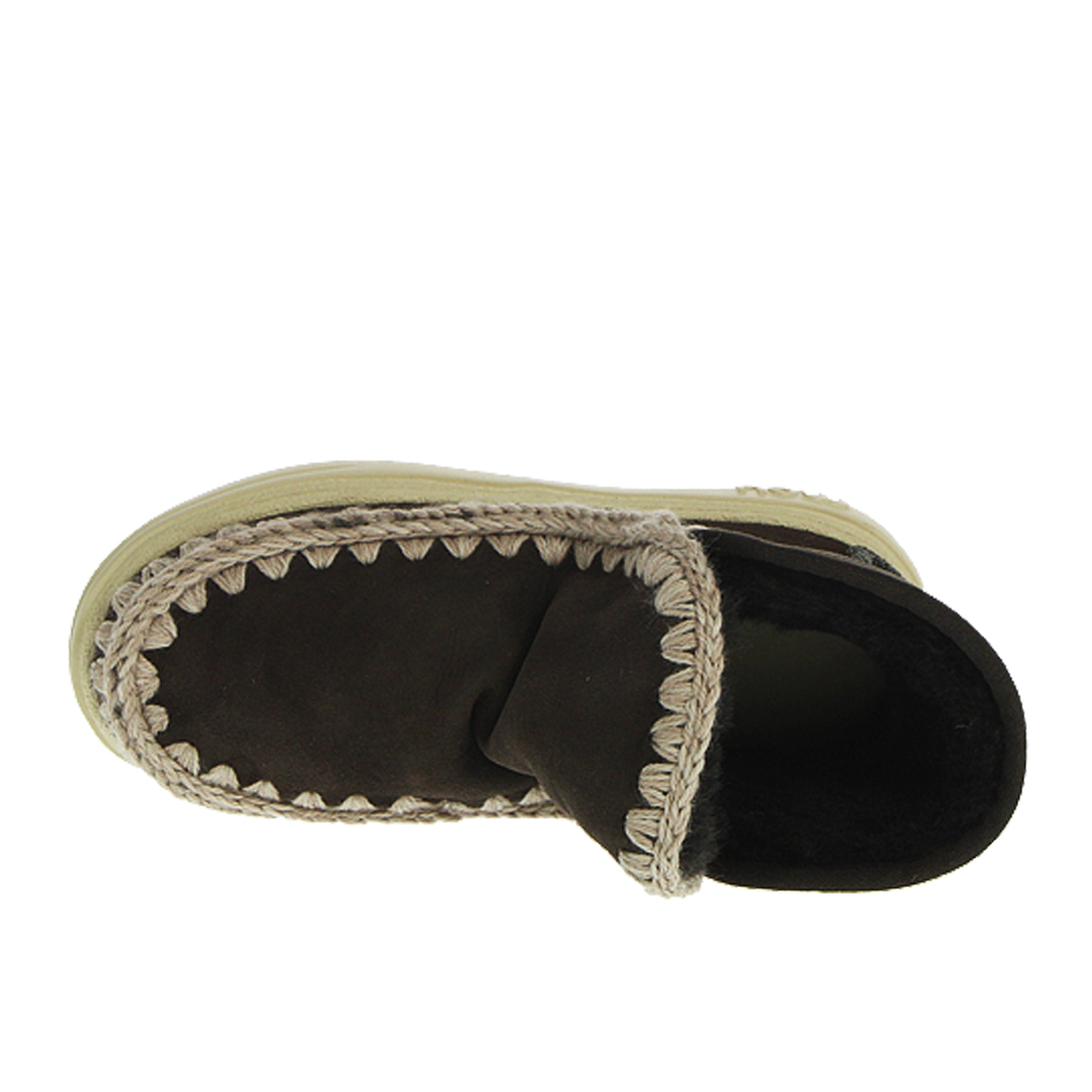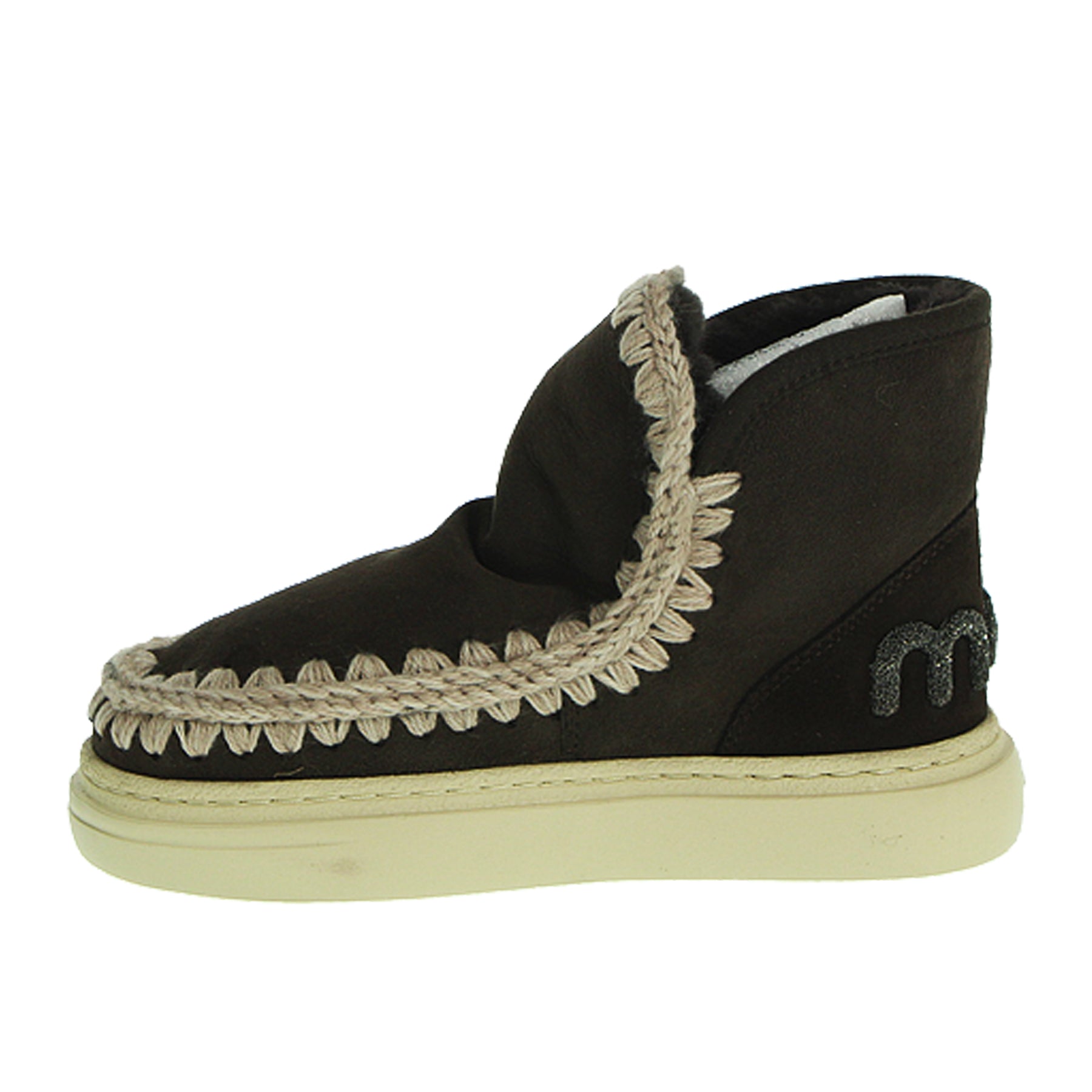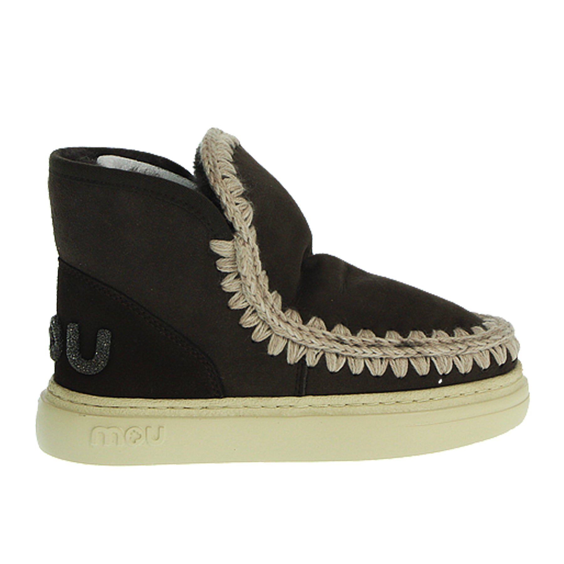 Eskimo Mou, modello Sneak Bold Glitter logo, in montone, con bordi in lana all'uncinetto, colore marrone scuro, logo glitter sul retro, con suola in gomma