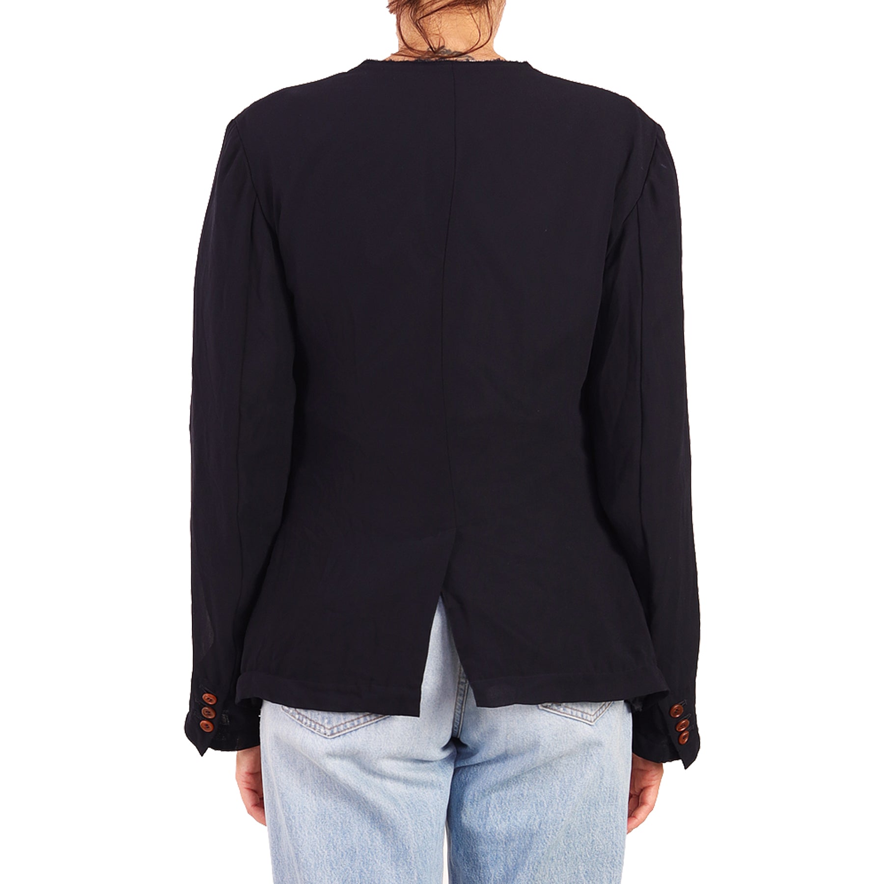 Des Garçons-style jacket, in polyester, blue, frayed edges, with pockets, 1-button closure