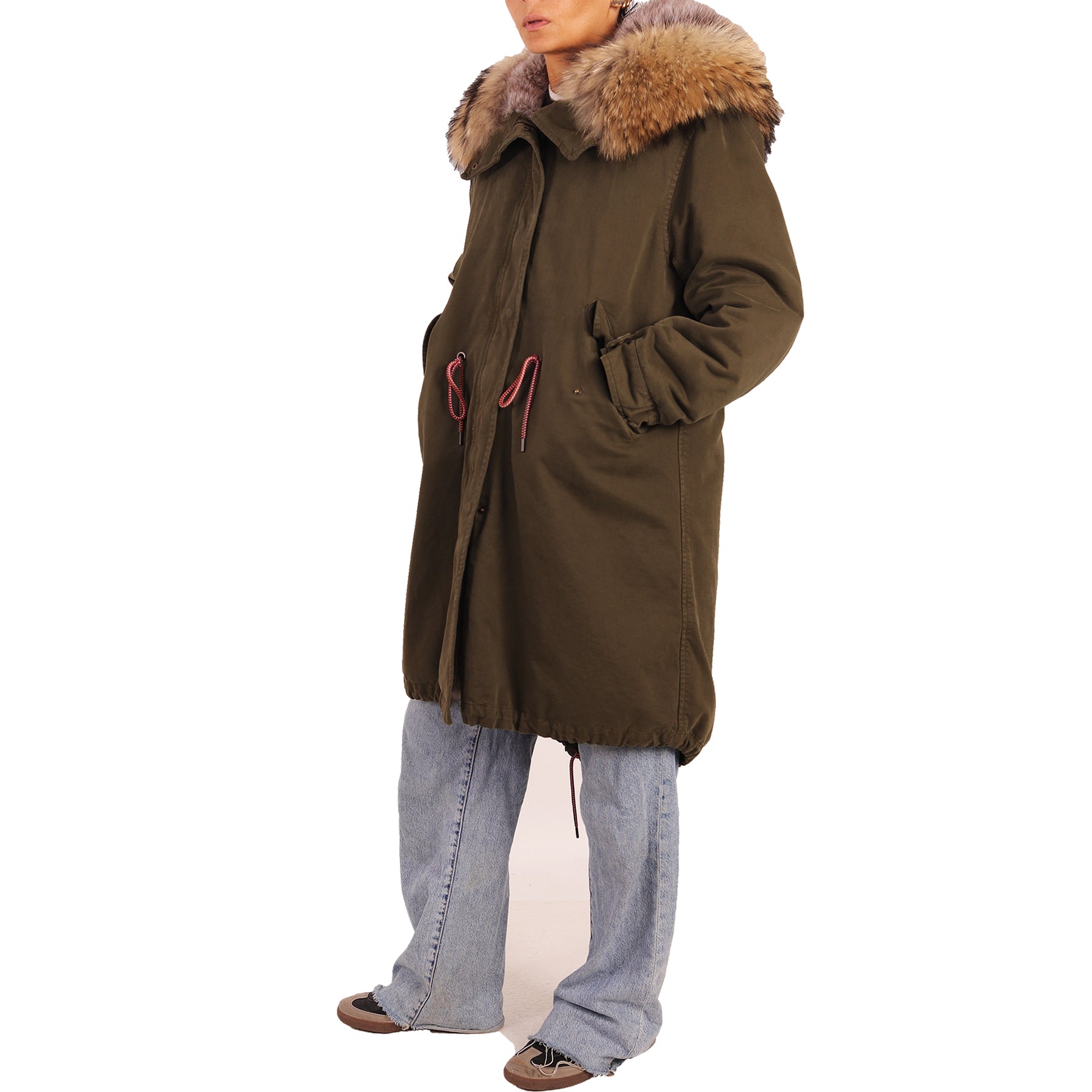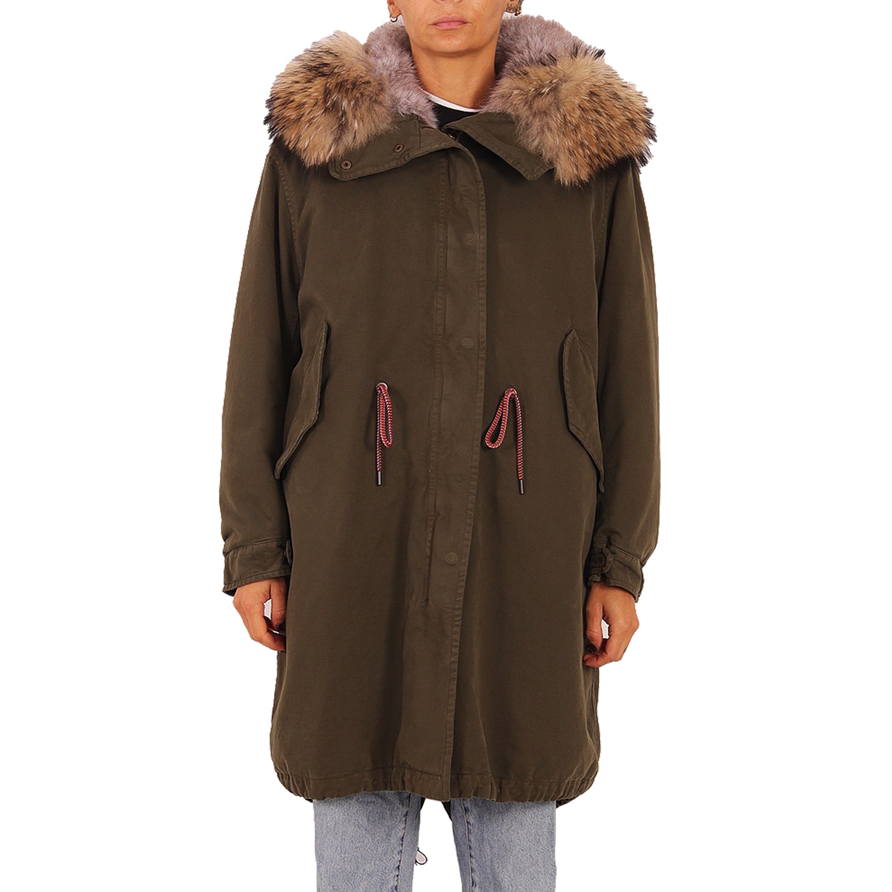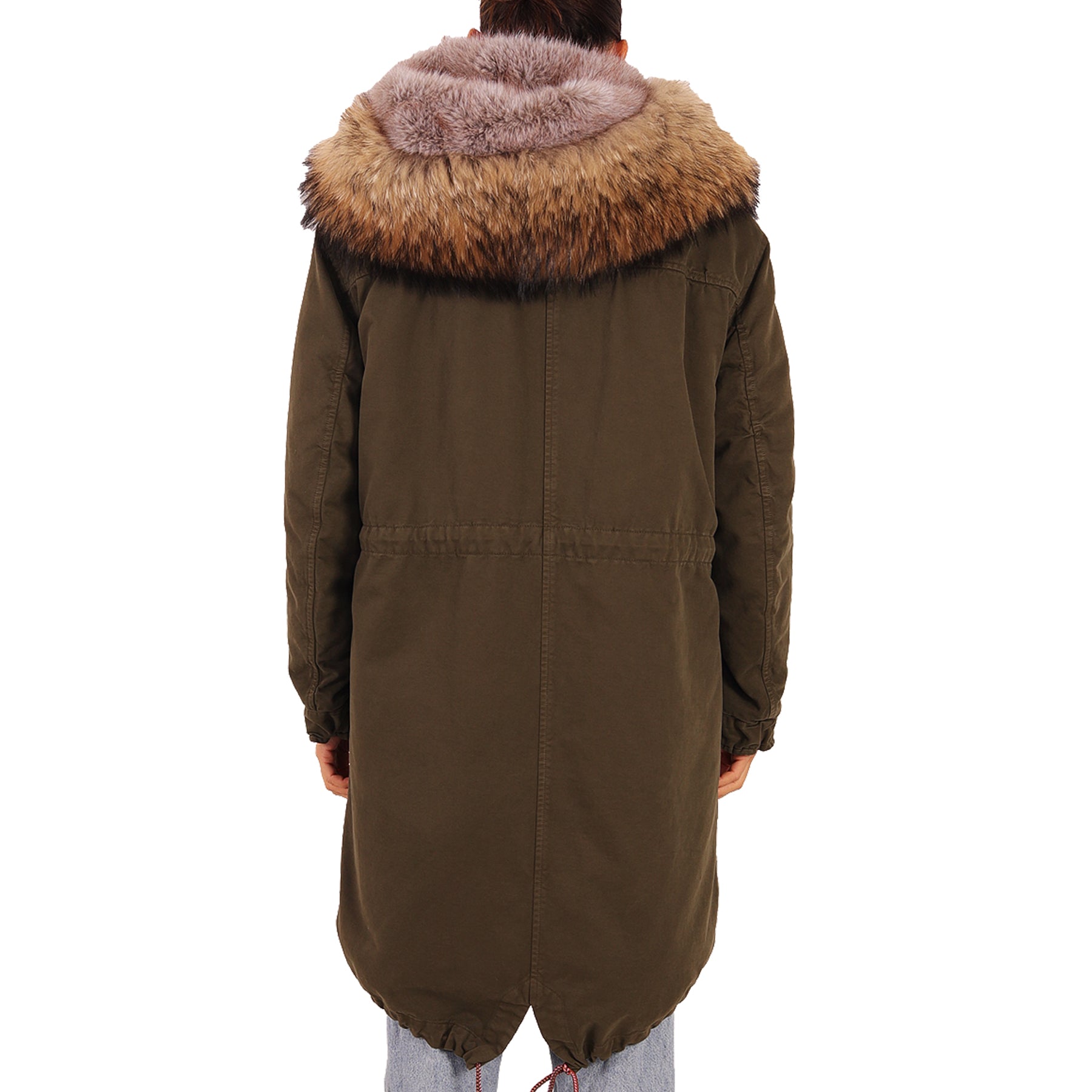 Giaccone con cappuccio, con collo in pelliccia, in cotone, in terno in pelliccia, con tasche, chiusura con bottoni e cerniera