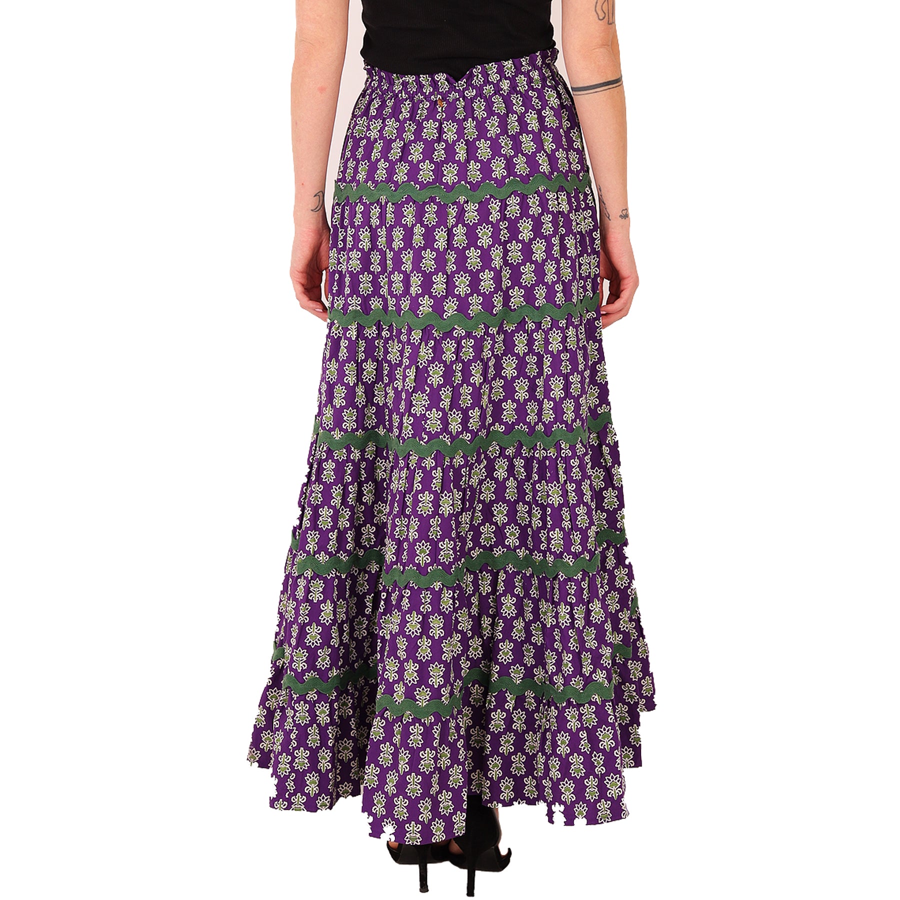 Long skirt in an ethnic pattern with ruffles, purple, button closure on the front, elastic waist, cotton, perfect for summer, hand wash, made in India
