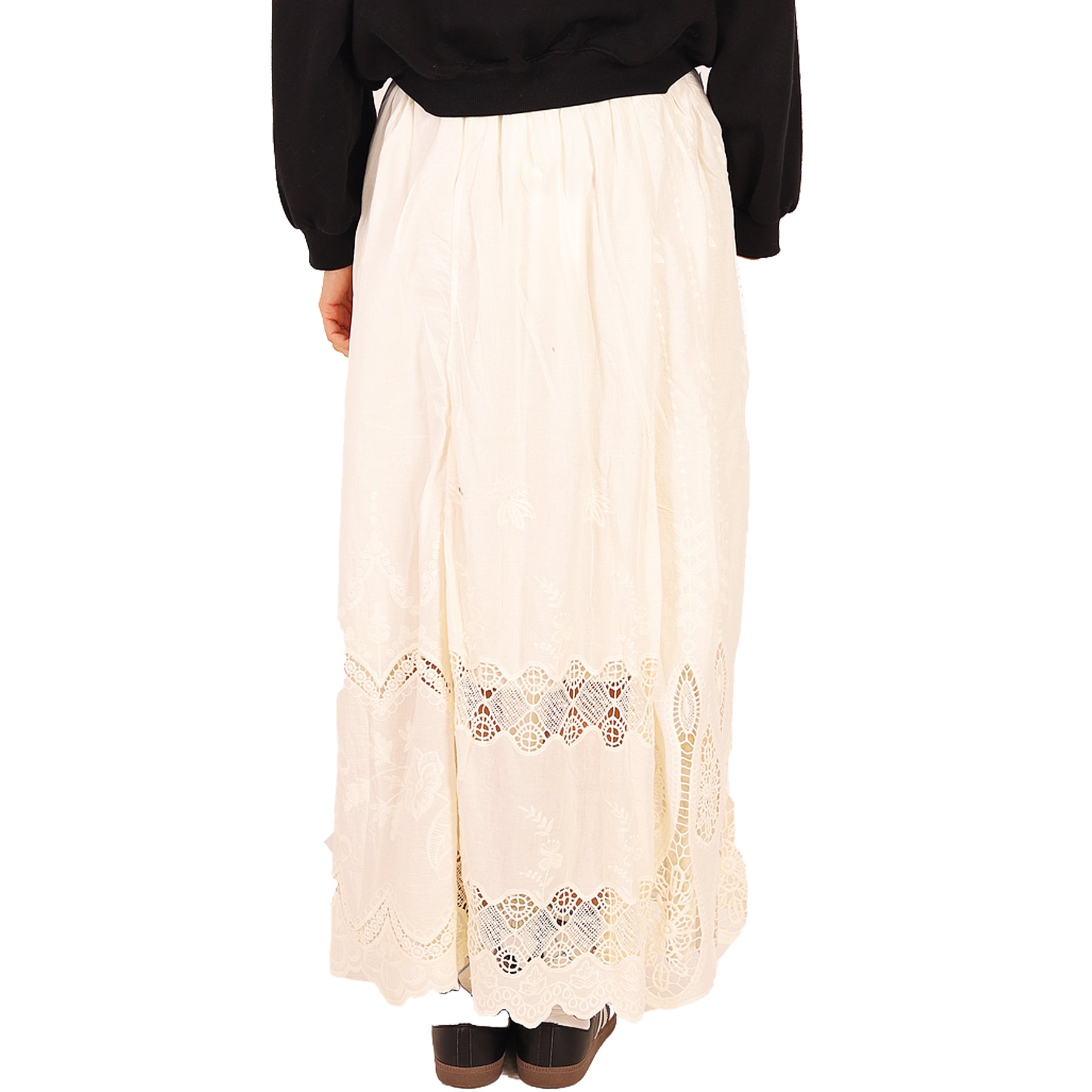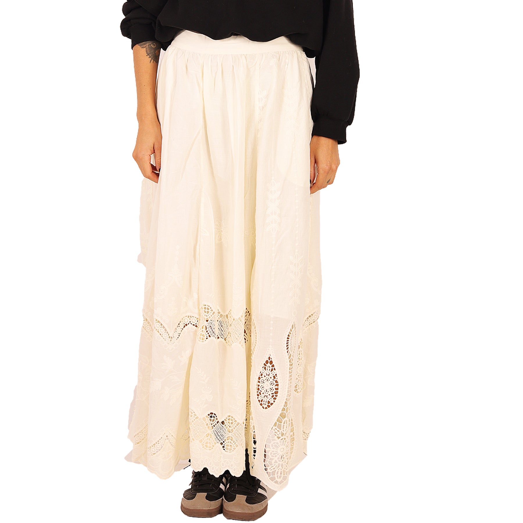 Gonna lunga Antik Batik, crema, con inserti in pizzo traforato, in cotone, con tasche, chiusura con zip laterale, fodera interna in cotone