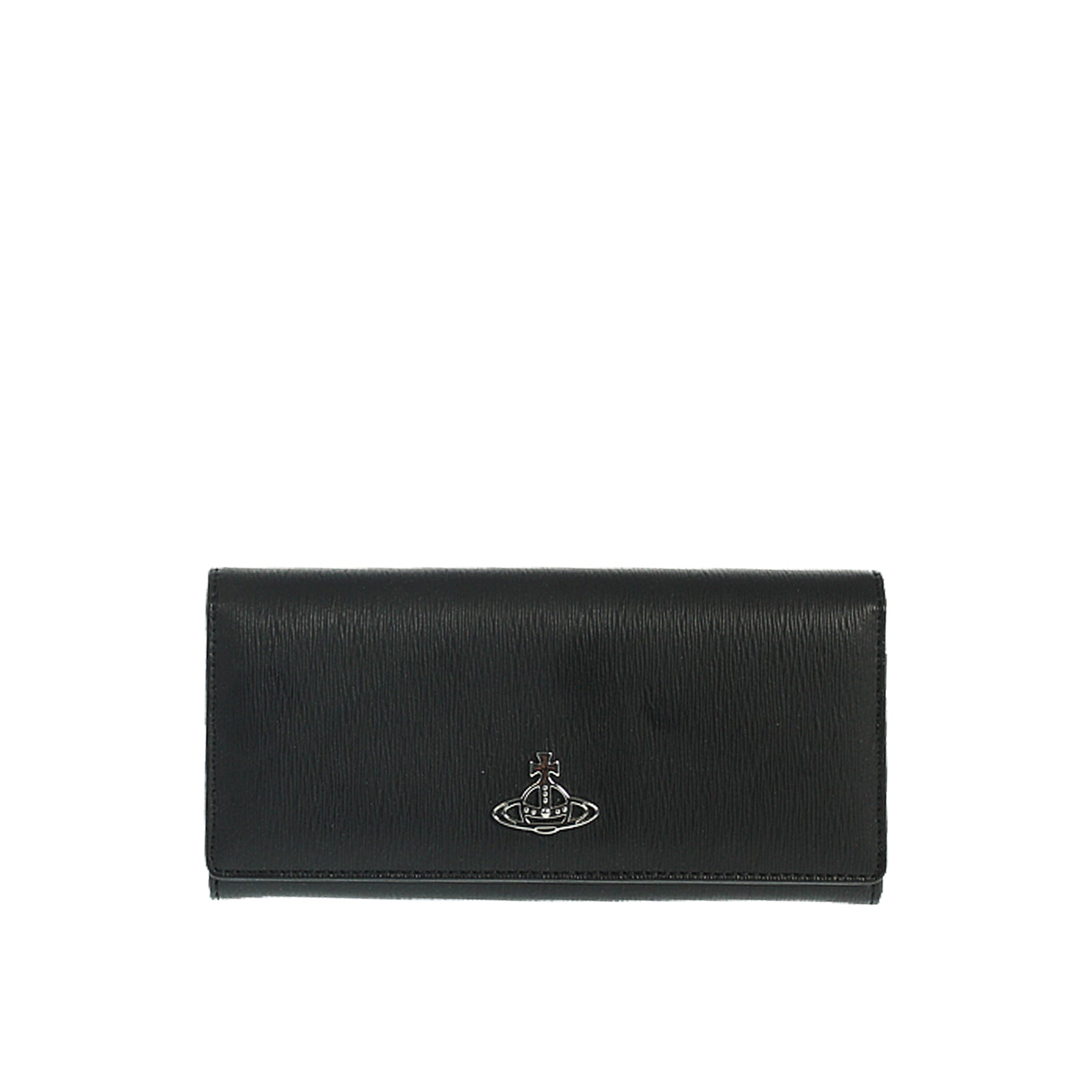 Portafoglio vivienne Westwood, in saffiano butterato, colore nero, logo strobo argento applicato, chiusura con doppio bottone a pressione tasca interna con cerniera, multicsomparto, tasche portacarte, lunghezza cm 19, retail € 190,00