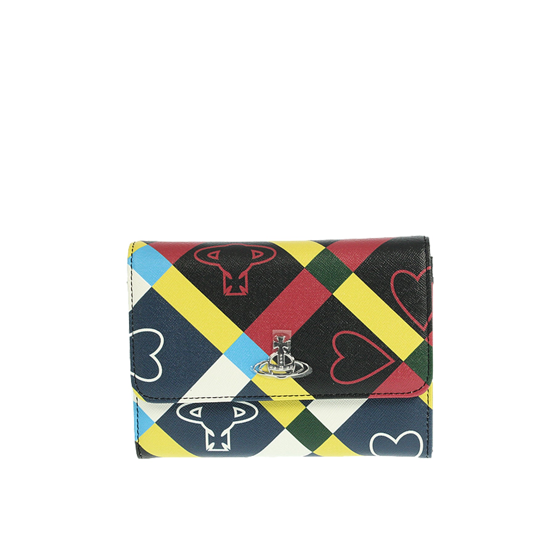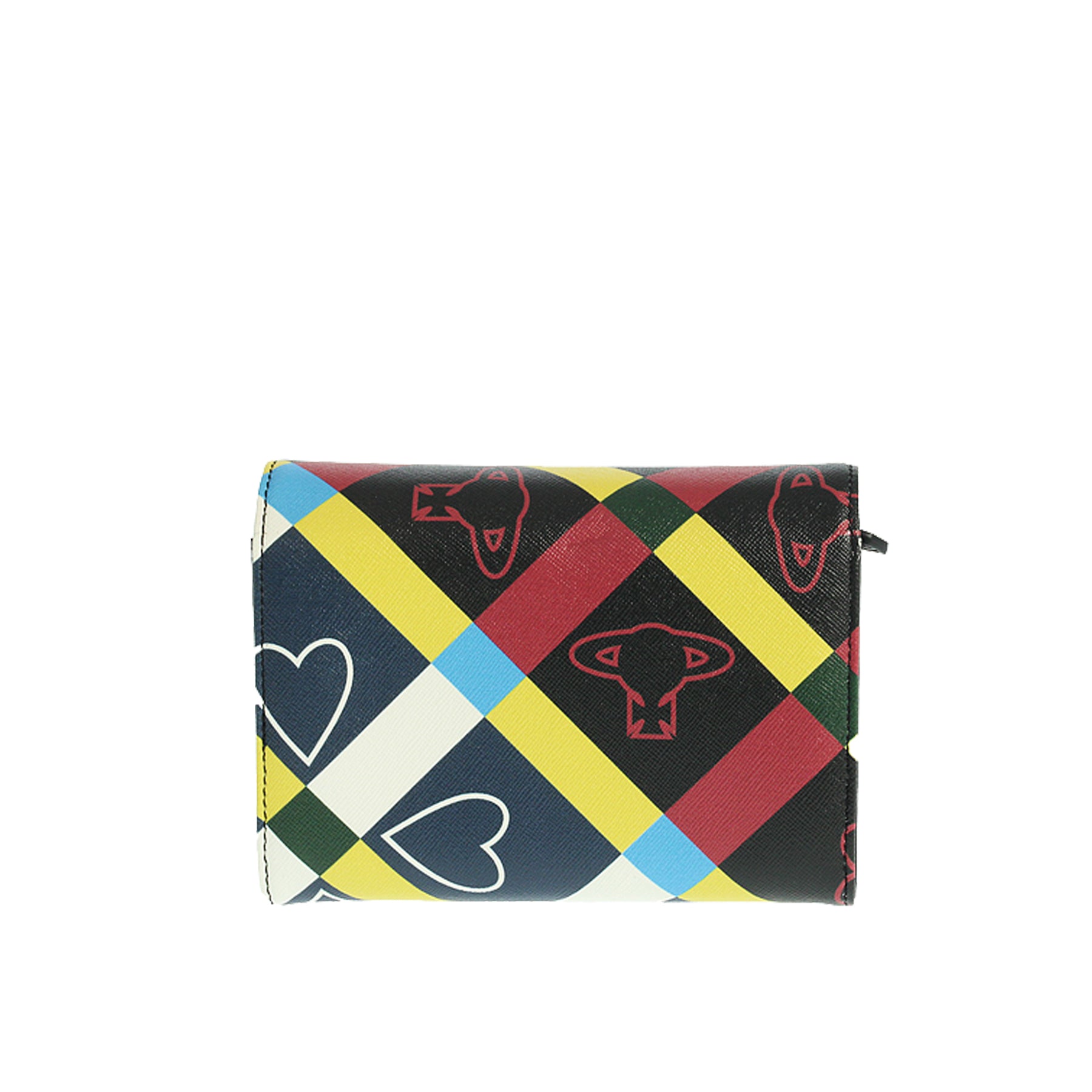 Portafoglio a tracolla Vivienne WEstwood, in saffiano, multixolor, strobo argento applicato, tracolla a catenella staccabile, tassca interna con cerniera, multiscomparto, tasche portacarte, lunghezza cm 16, retail € 280,00