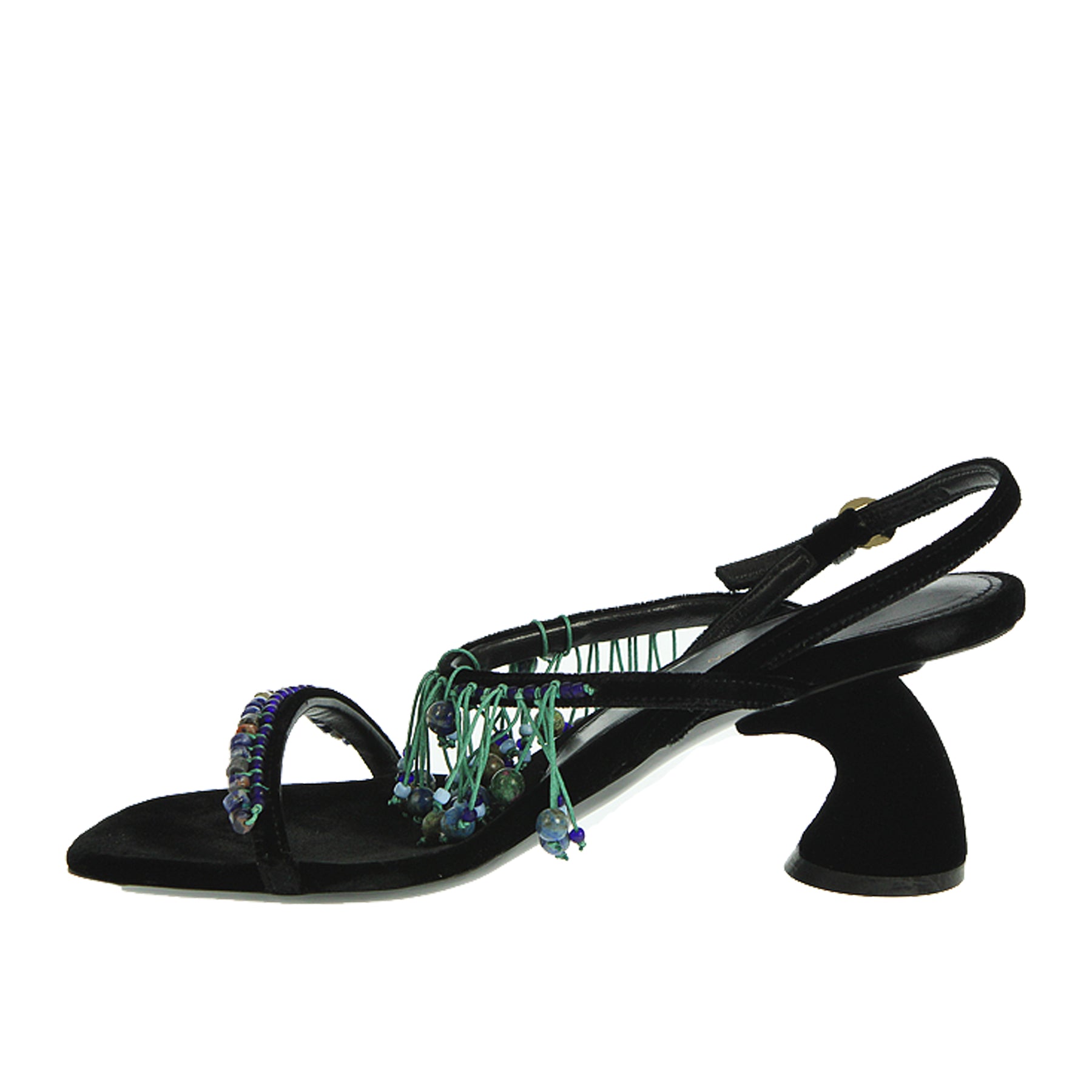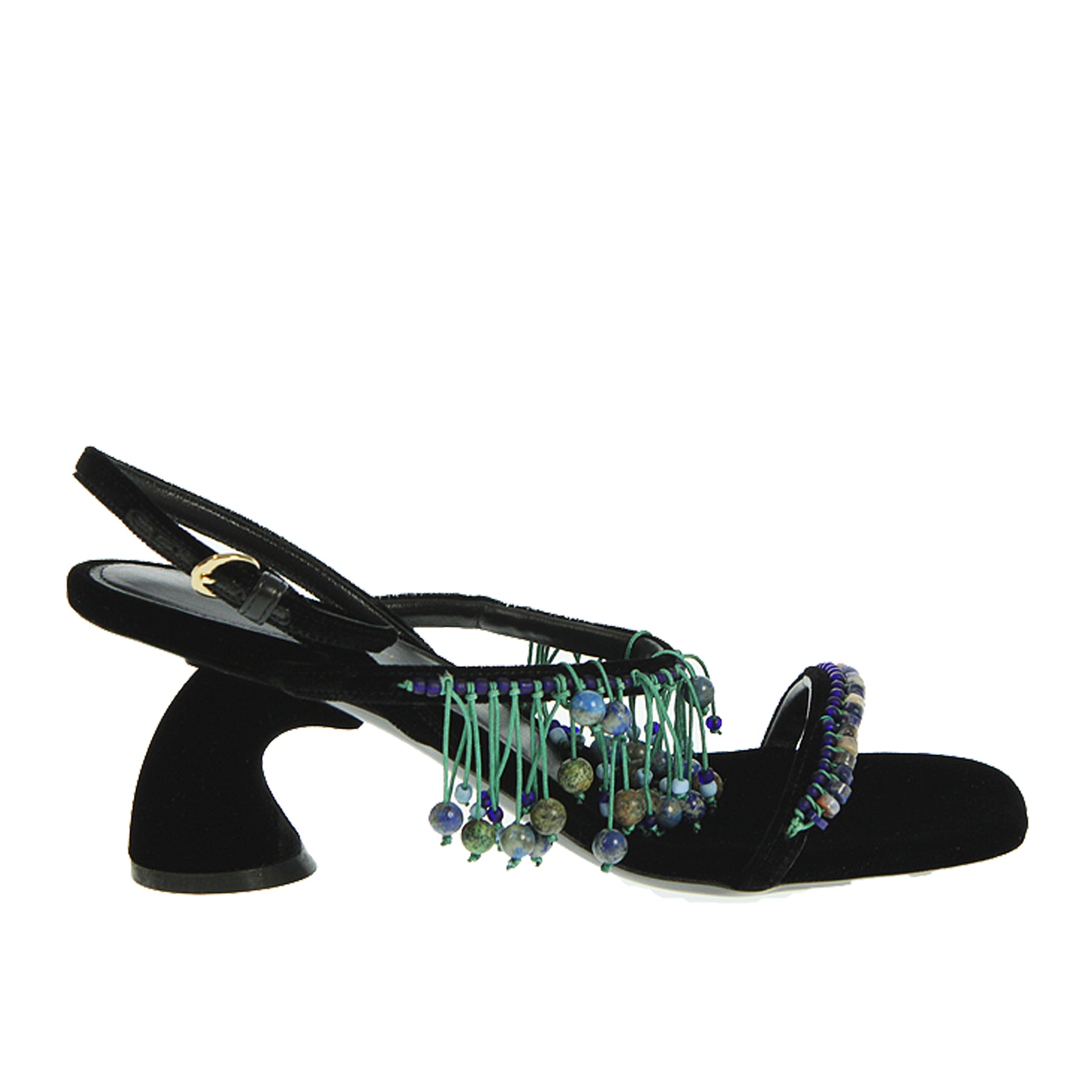 Dries Van Noten sandal, in black velvet, with straps, side ankle strap, with applied beads, shaped heel, leather sole, heel height 6.5 cm