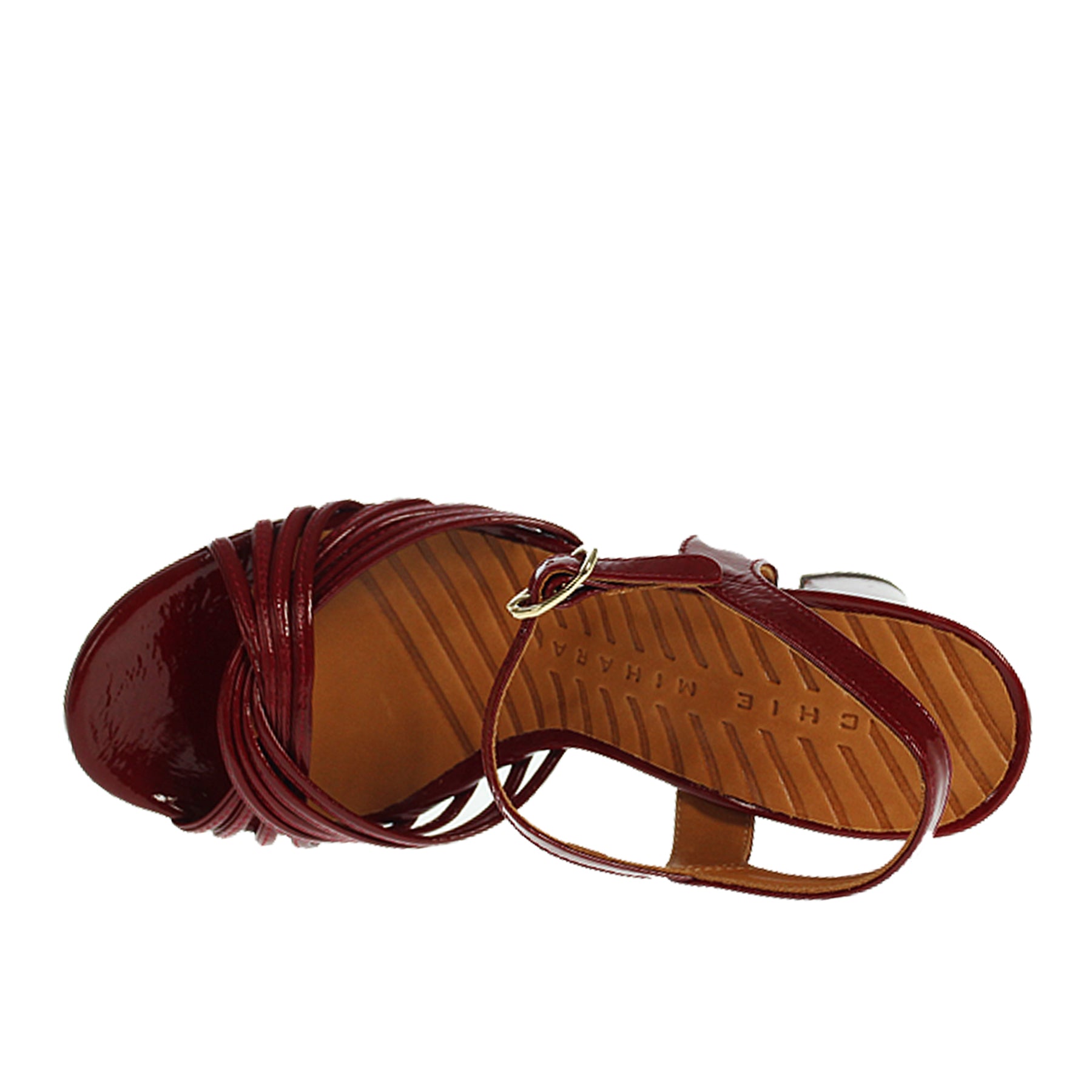 Sandalo Chie Mihara, in vernice, colroe rosso scuro, con fascette sottili intrecciate sul davanti, con cinturino alla caviglia, modello evergreen, con piccolo plateau 2 cm, tacco ampio, suola in cuoio con inserti in gomma, altezza tacco 11 cm, made in spagna