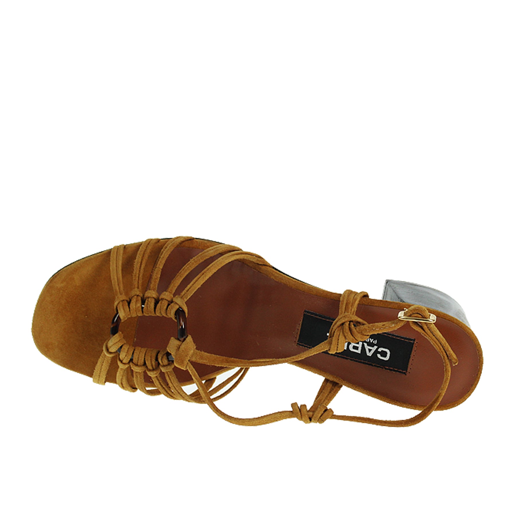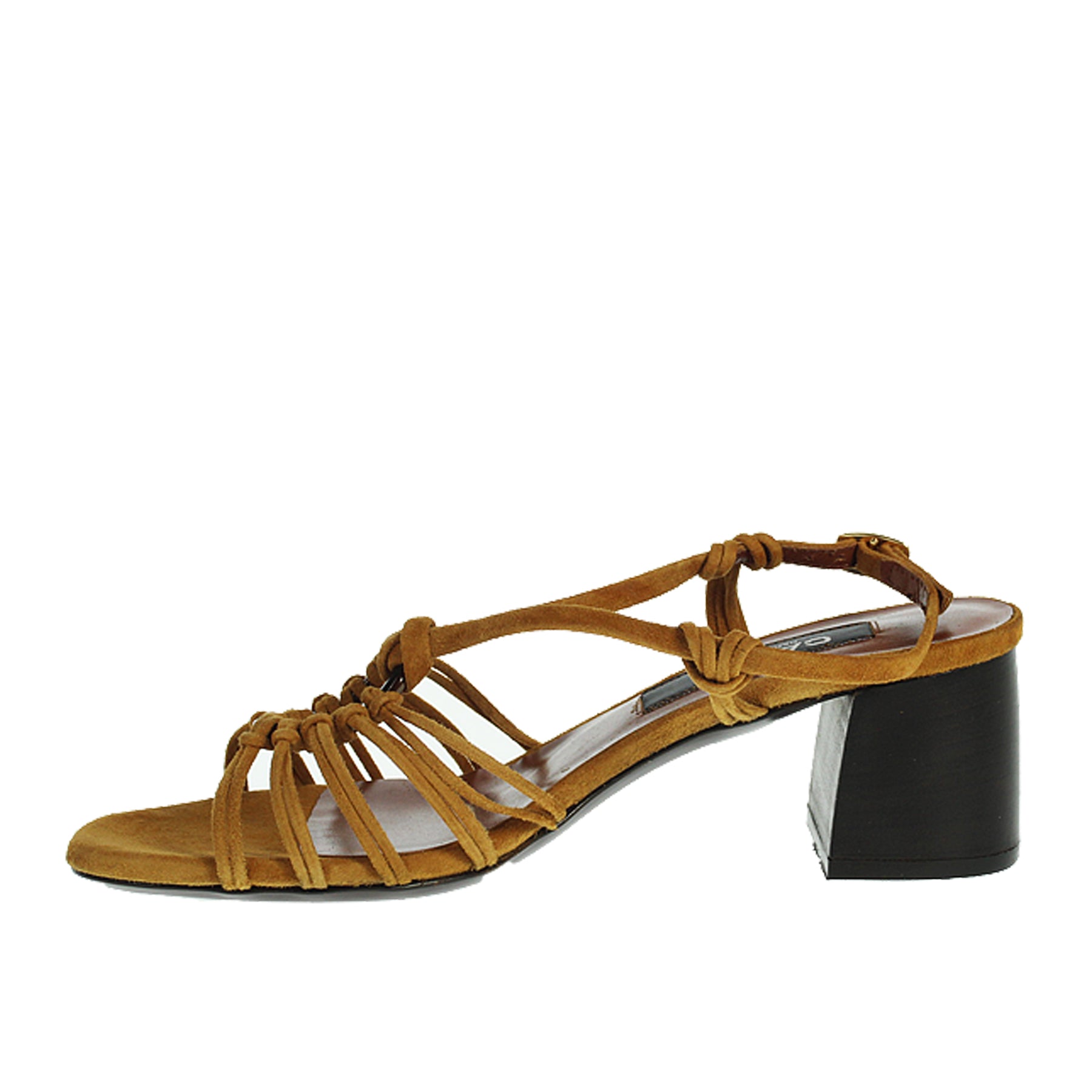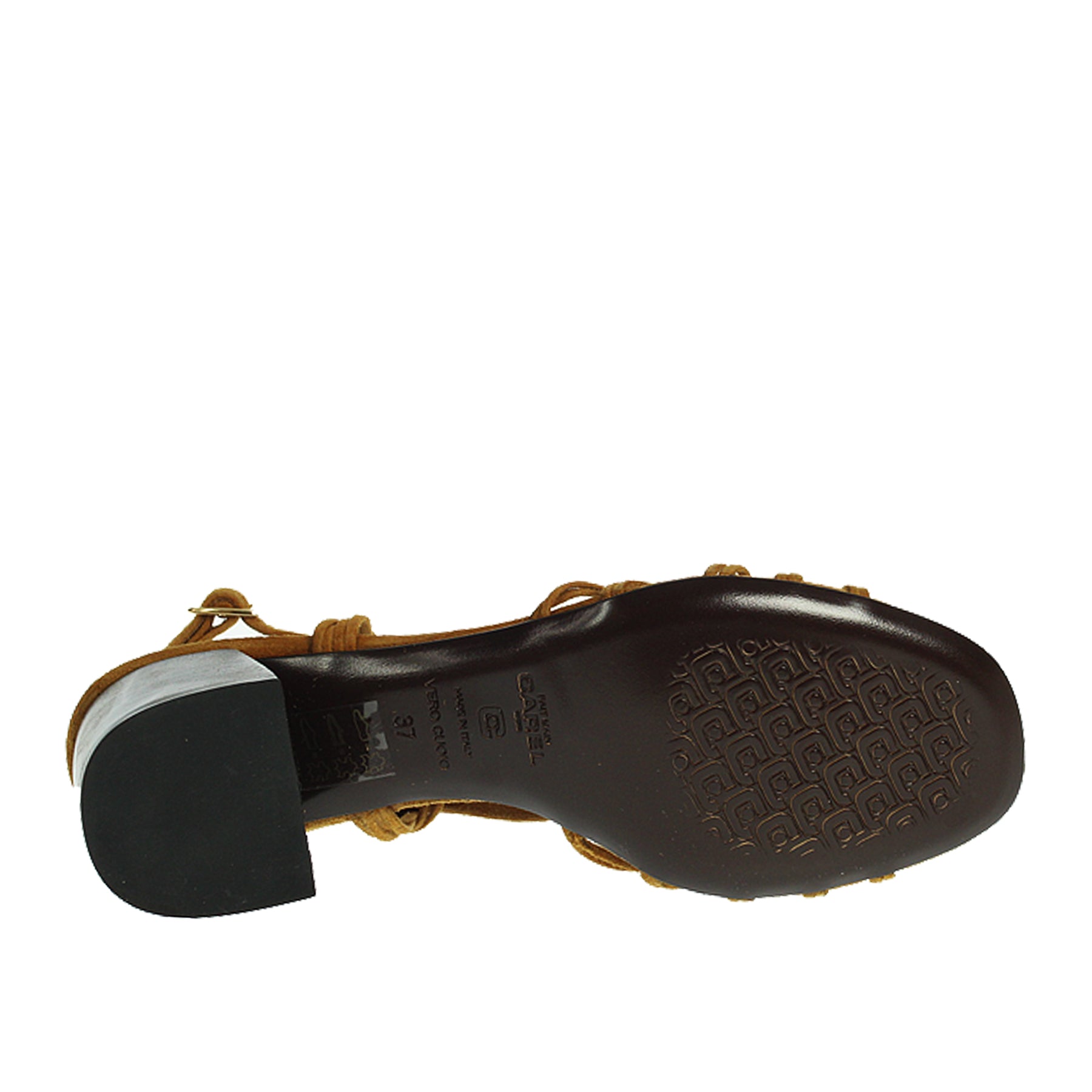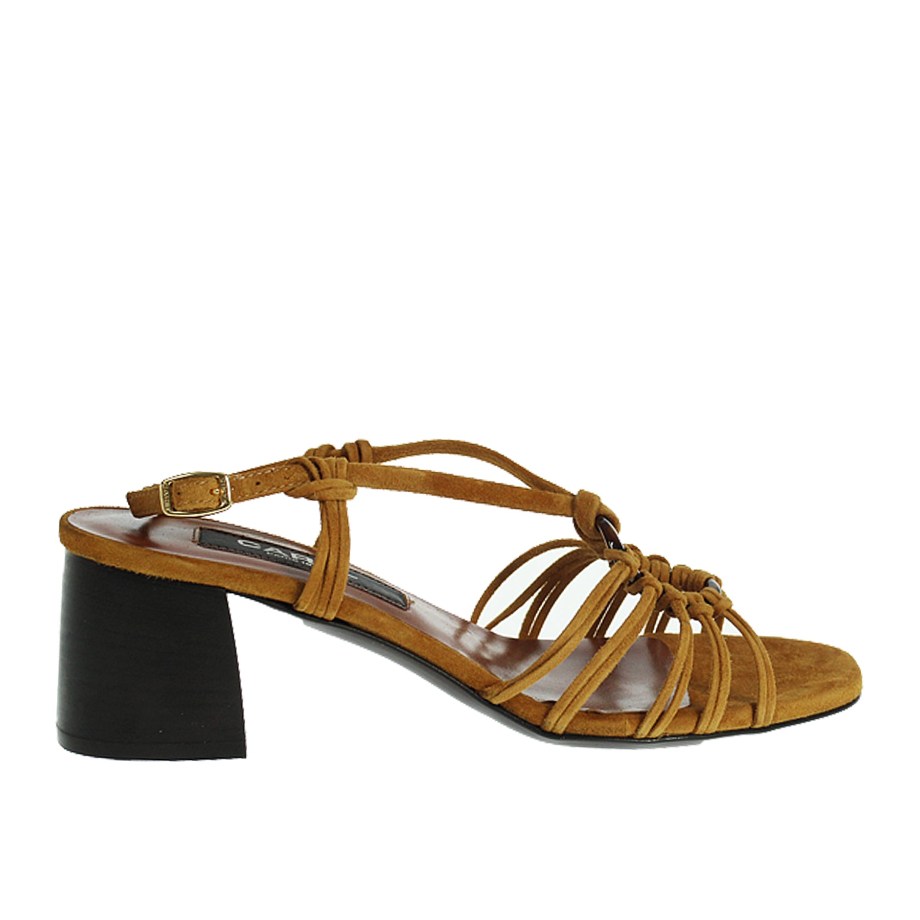 Sandalo Carel, in camoscio, colroe marrone, con fascette sottili intrecciate sul dorso, con cinturino alla caviglia, con tacco ampio, suola in vero cuoio, altezza tacco 6 cm