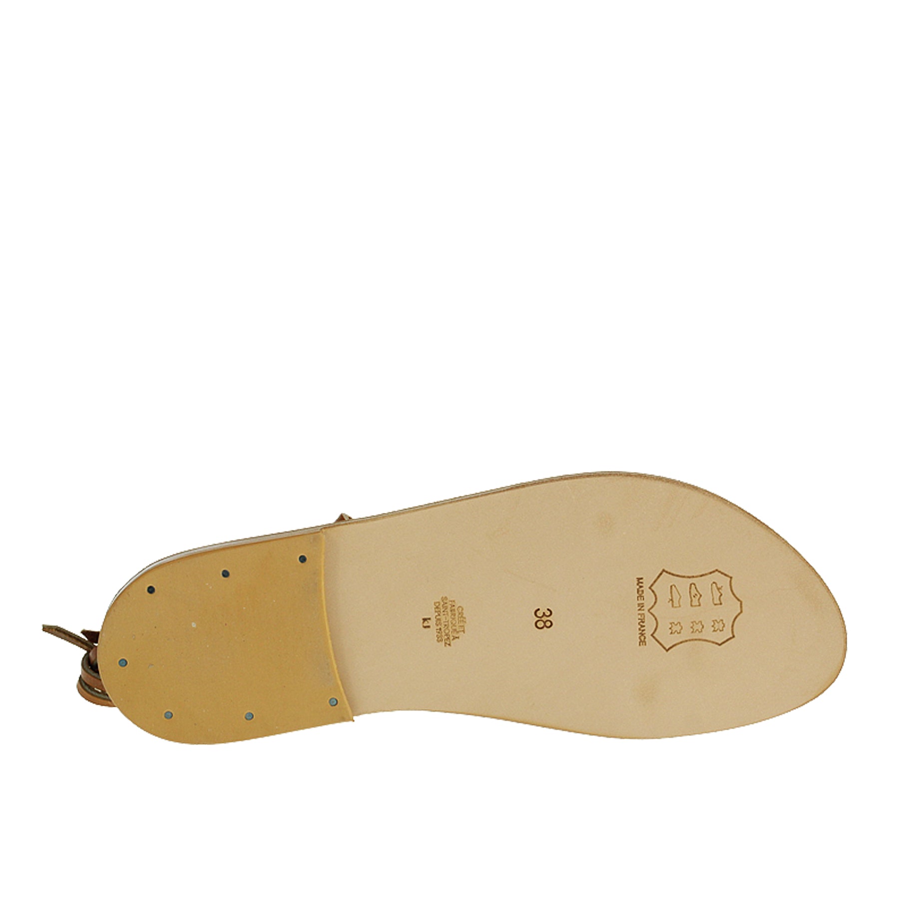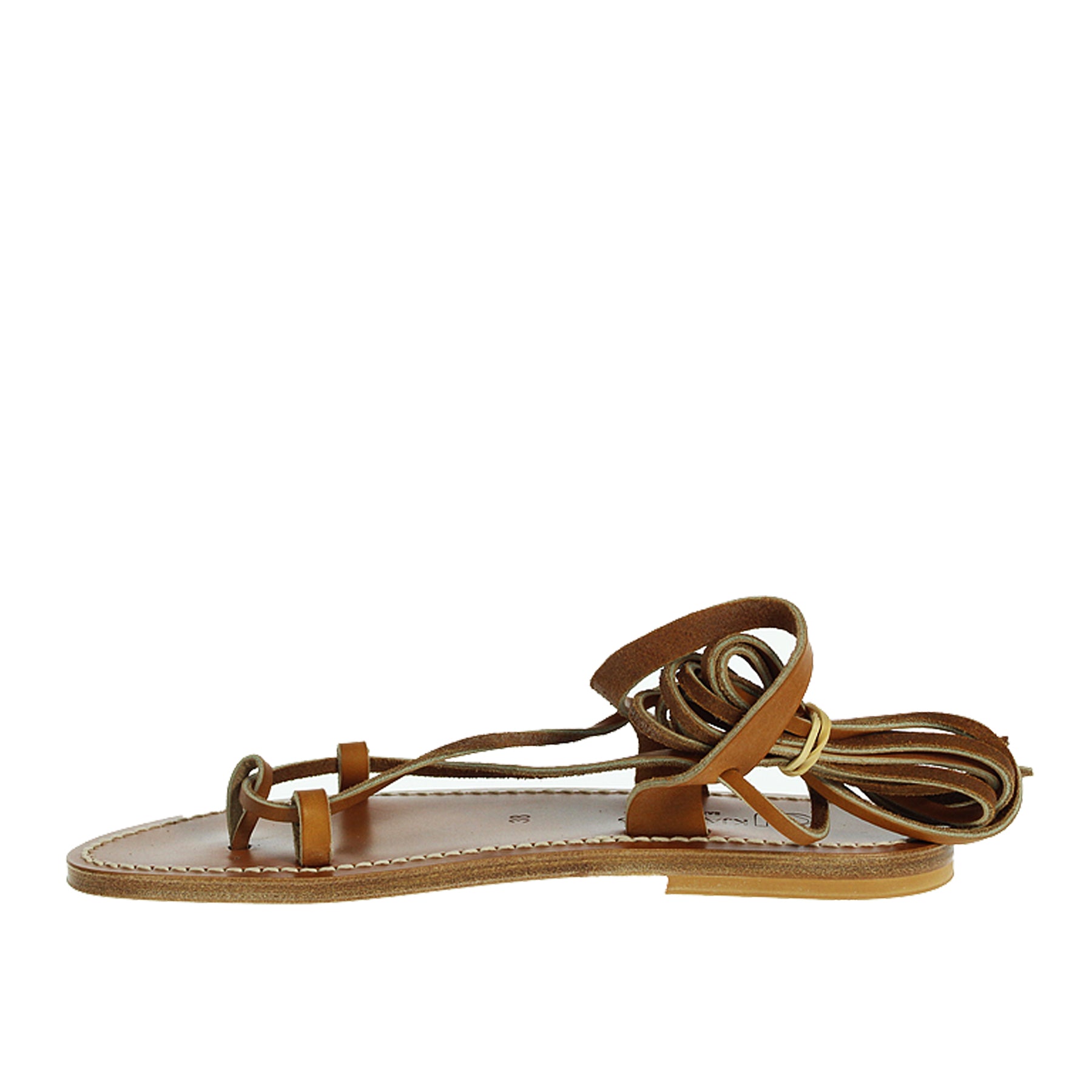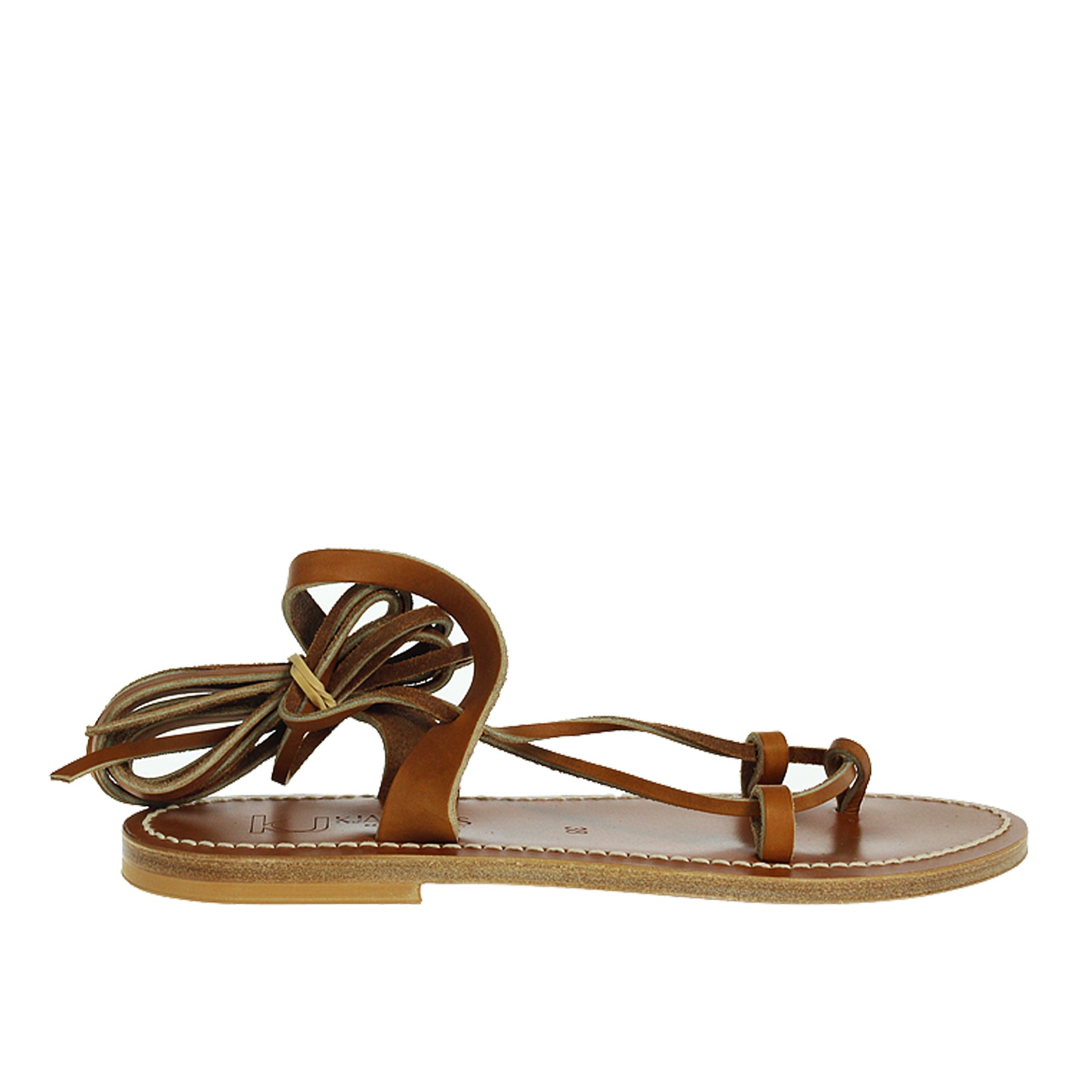 Sandalo piatto K.Jacque, in pelle, colore marrone naturale, ad infradito, con lacci in pelle intrecciati alla caviglia, modello iconico della maison, perfetto per l'estate, con cinturino alla caviglia, sandalo da design intramontabile fabbricato a mano a Saint Tropez dal 1933, con suola in vero cuoio, made in francia